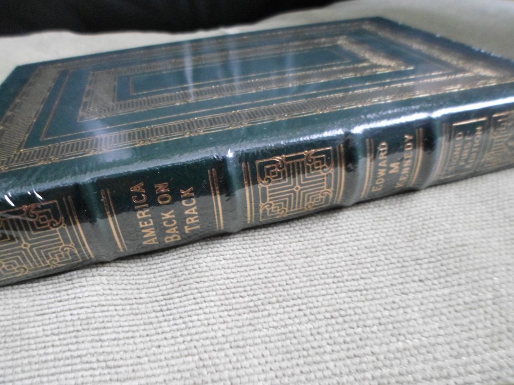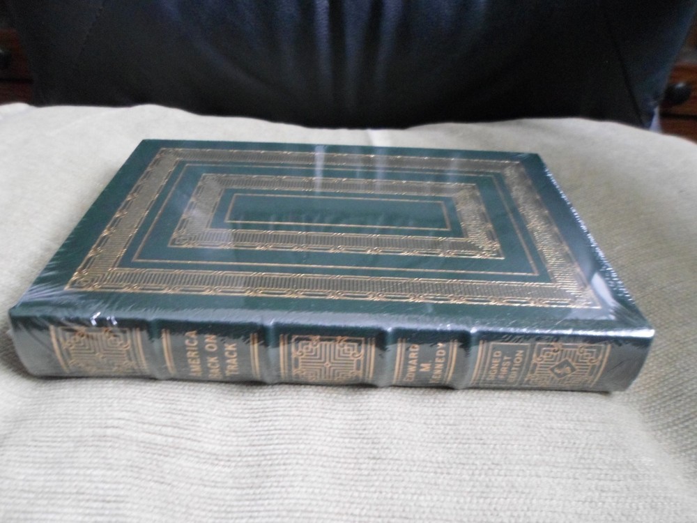 This is a leather bound signed first numbered edition of Senator Edward (Ted) Kennedy's best-selling political manifesto - "America Back On Track" . With a Senate career that has spanned more than four decades, Edward M. Kennedy has become one of the strongest voices in American politics. In America Back on Track , he argues that America is at a crossroads, having reached a point where it has departed more deeply from its fundamental ideals than at any time in its modern history. In response to the erosion of the nation's basic values, he presents a sweeping agenda for reform and renewal, speaking to the country's most significant needs at home and abroad. National security, the war in Iraq, terrorism, and key domestic challenges such as jobs, health care, education, civil rights, energy, and the environment all receive major attention in his proposals to counter the harmful policies of the current administration, restore America's respect in the world, and create a better America here at home where democracy, individual opportunity, equal justice, and innovation can flourish. With his first major policy book in more than twenty years, Senator Kennedy takes an in-depth look at our modern political landscape and offers innovative policies that he genuinely believes will guide the country effectively to the future. The book is in great condition, new, unread, still sealed in the original plastic packaging. Signed by the late senator on the limitation page, it also includes the signed certificate of authenticity and the publisher's note card. This is a one of only 1750 numbered copies ever published. Easton Press books are the golden standard in the publishing industry, highly collectible and lasting generations. Easton Press Full Genuine Leather Dubbed Spine Accented Wit 22 kt. Real Gold Satin Ribbon Page Marker Distinctive Cover Design Gilded Page Edges To Protect Against Humidity High Quality Acid - Free paper Smyth-Sewn Pages Silk-Moire Endleaves I combine multiple items for savings on shipping charges. I ship worldwide. Please ask about international shipping charges and/or different shipping options. Please check out my other auctions for several rare signed books for sale. Thank you!