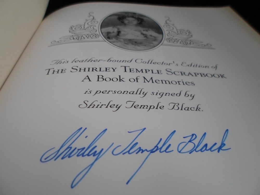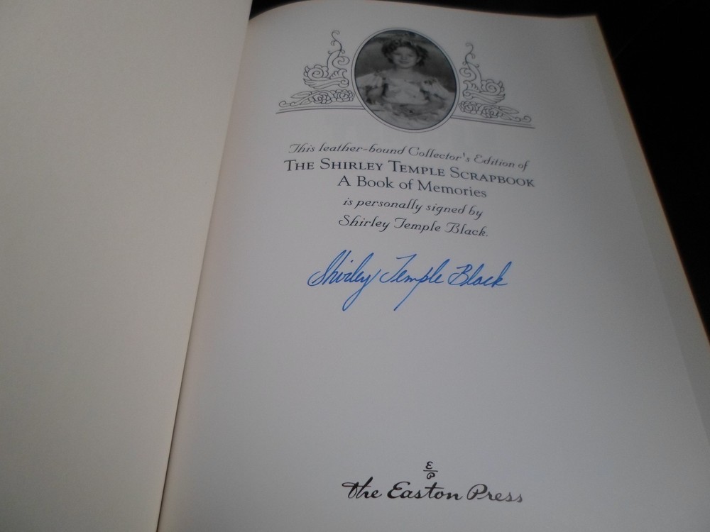 This is a leather bound signed collector's edition of Shirley Temple's best-selling autobiographical collection - "The Shirley Temple Scrapbook - A Book of Memories", a massive and beautiful photo album depicting the fascinating story of the legendary Hollywood star and, later in life, US diplomat and ambassador. A very exciting reading, describing both her successful movie career and her personal life. The book is unread and in great condition, with just a faint trace of rubbing on the upper right side of the cover (see pictures). It is signed by the famous movie legend on the limitation page. It also includes the signed and dated certificate of authenticity. Easton Press books are the golden standard in the publishing industry, highly collectible and lasting generations. Easton Press Full Genuine Leather Dubbed Spine Accented Wit 22 kt. Real Gold Satin Ribbon Page Marker Distinctive Cover Design Gilded Page Edges To Protect Against Humidity High Quality Acid - Free paper Smyth-Sewn Pages Silk-Moire Endleaves I combine multiple items for savings on shipping charges. I ship worldwide. Please ask about international shipping charges and/or different shipping options. Please check out my other auctions for several rare signed books for sale. Thank you!