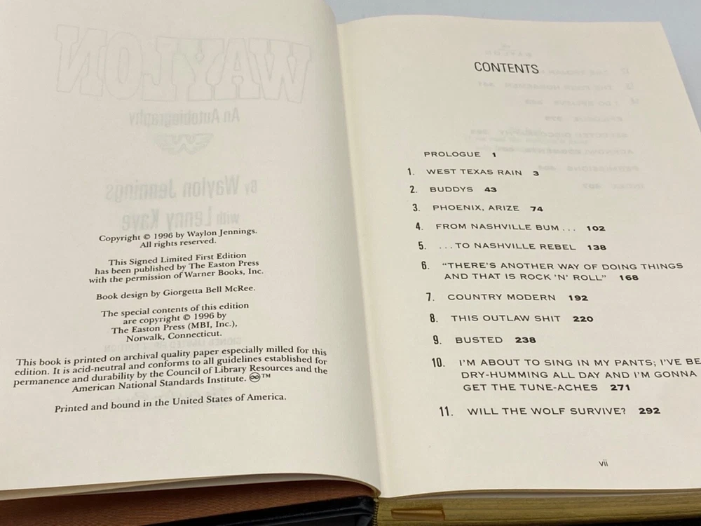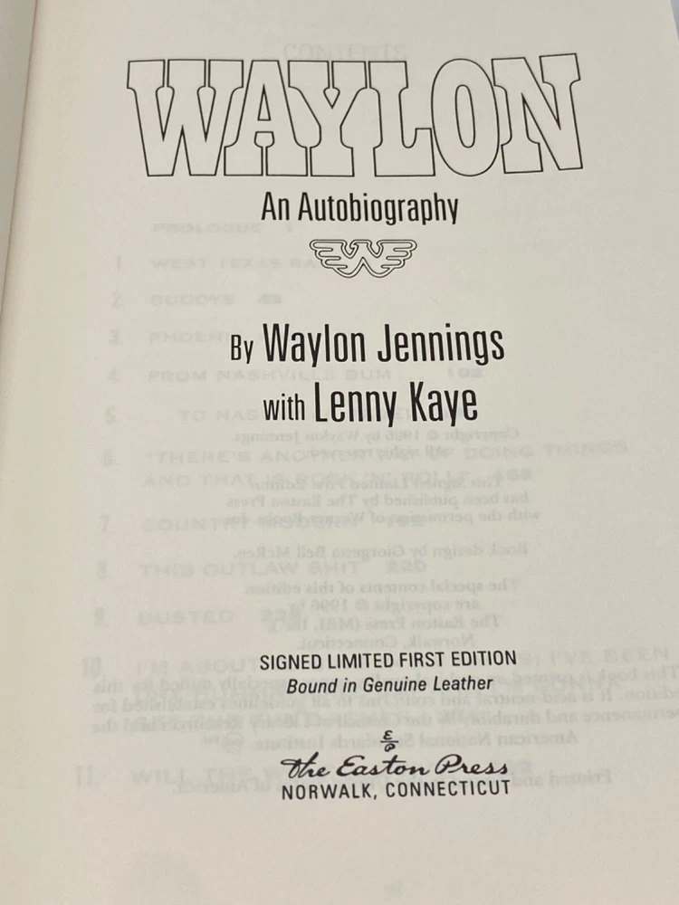 MAKES THE PERFECT GIFT FOR ANY WAYLON JENNINGS FAN / AUTOBIOGRAPHIES / SIGNED FIRST EDITIONS / COUNTRY MUSIC ** PLEASE READ : Mahalo for taking the time to look at our listing. We truly appreciate it. We always do our BEST to give you the most accurate description of these beautiful books. If, however, you have any SPECIFIC questions about the SIZE of the book, NUMBER of pages, TYPE of leather, SMELL or FEEL of the book, PLEASE email us through EBay’s mail system BEFORE you bid, and we will be HAPPY to give you more information. We want you to be completely happy with your purchase and keep you as our customers for years to come!** DESCRIPTION: Easton Press’s SIGNED FIRST EDITION , LONG OUT OF PRINT full-leather binding of WAYLON personally signed first edition by WAYLON JENNINGS . THIS IS 1395 out of ONLY 3000 ever produced. THIS IS A VINTAGE HEIRLOOM EASTON WITH LAVISH DEEP GILT IMPRESSIONS TO THE BOARDS AND SPINE WITH BEAUTIFUL VINTAGE PHOTOGRAPHS. IT IS ONE OF THE MOST HIGHLY-PRIZED & MOST BEAUTIFUL EDITIONS OF THIS GREAT WORK YOU CAN FIND. 🍍 NOT INCLUDED… 😃 THESE SIGNED FIRST LEATHER EDITIONS WILL ONLY GET MORE VALUABLE OVER TIME DUE TO WAYLON’S UNTIMELY DEATH IN 2002. ABOUT THE BOOK: Waylon Jennings relates the story of his life as a country music star. His beginnings were poor but he became Buddy Holly's protege before sinking into drug abuse and 3 failed marriages. His success came when he met his present wife, Jessi Colter. CONDITION: Book is LIKE NEW condition for its age with no discernible imperfections (SEE PICS FOR BETTER DETAILS). NO ATTACHED BOOKPLATES, WRITING FROM PREVIOUS. It is a BEAUTIFUL EDITION. SHIPPING: FREE TO US ADDRESSES ONLY. INTERNATIONAL $ based on location. WE SHIP PRIORITY MAIL & PACK VERY WELL. Please check out our other listings of Easton Press, Franklin Library, Limited Editions Club Folio Society, International Collectors Library, Heritage Press, and First Edition Library editions. WE DO COMBINE SHIPPING IF YOU PURCHASE MORE THAN ONE COPY. Mahalo for looking at our listings! By bidding/purchasing this item, you are helping a very grateful family who sends you our WARMEST ALOHA & MAHALO!