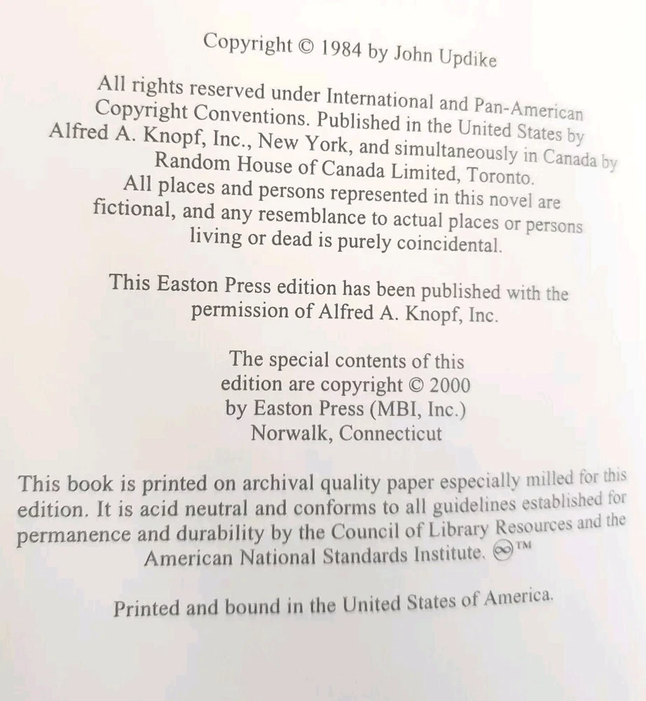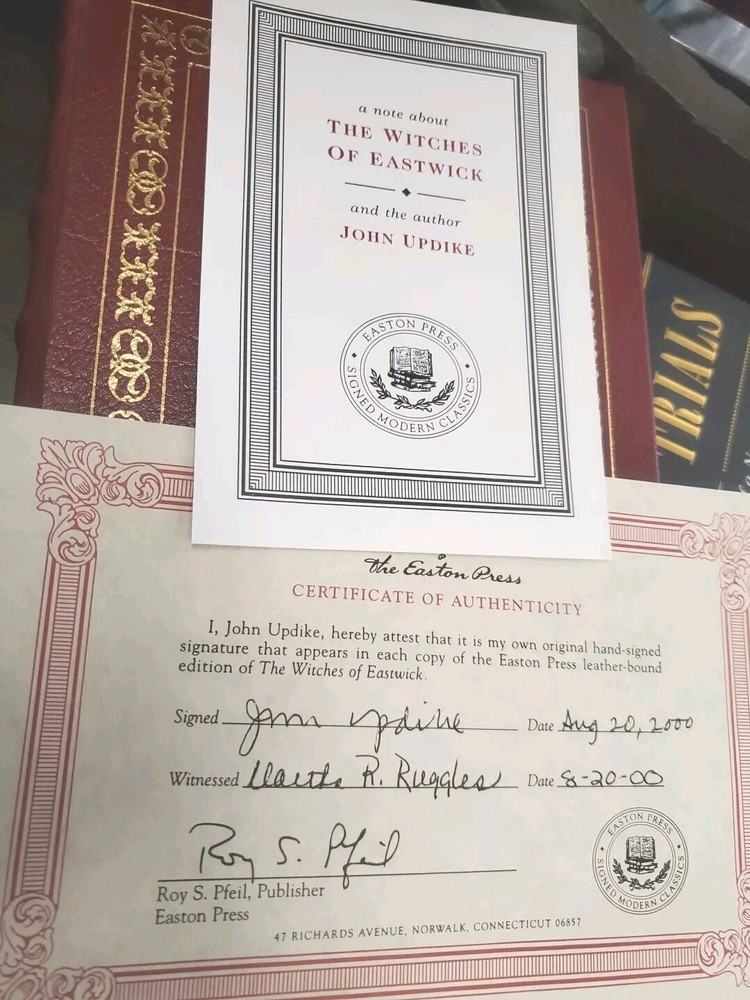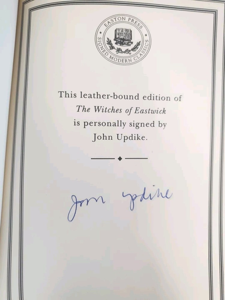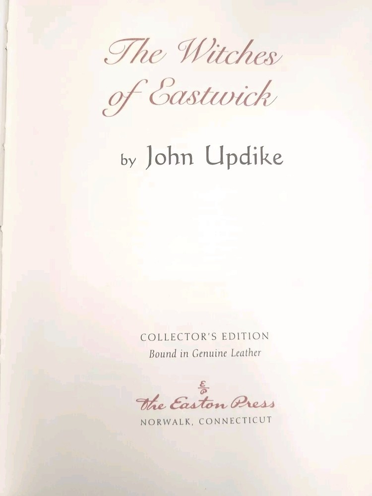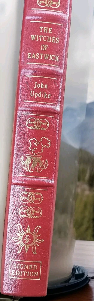 This luxurious and rare first edition of John Updike's "The Witches of Eastwick" is a must-have for any collector of modern literature. The book is beautifully bound in red leather and published by Easton Press in 2000, making it a valuable addition to any library. The author's signature adds even more value to this limited edition book and certificates of authenticity are included. The book is written in English and is a biography and autobiography of the author. It is an original copy and was published in Norwalk, CT. The book is also a collector's edition and has special attributes such as being a limited edition and a signed copy. This book is perfect for anyone who loves literature and wants to add a valuable and unique piece to their collection.
