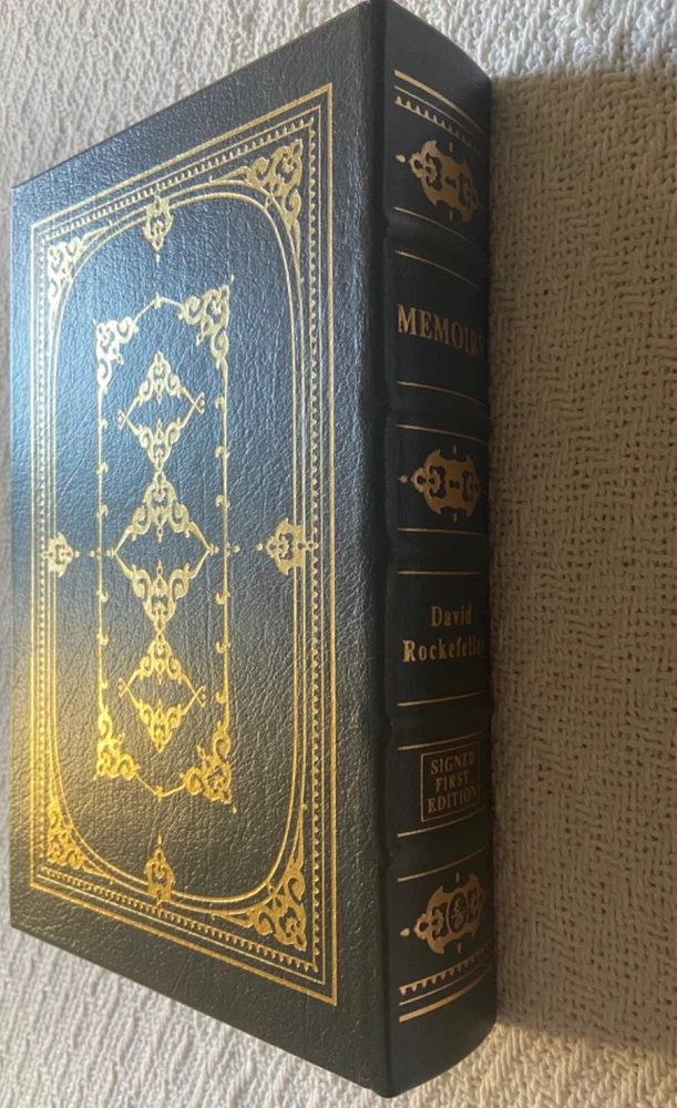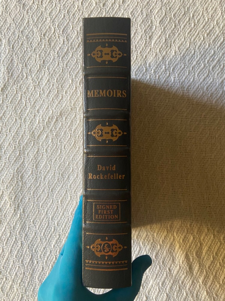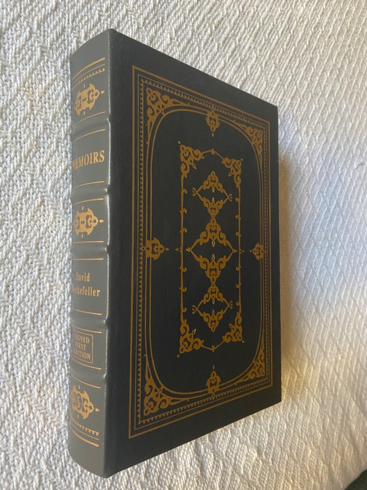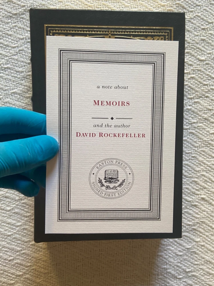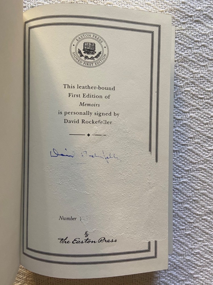 This is Easton Press’ Signed First Edition of famous banker David Rockefeller’s Memoirs, a genuine leather hardback. The exterior is a slightly textured dark grey with stunning gold designs. BESIDES THE TEAR on the signature page, t he book is in immaculate condition with no major signs of use/wear (see photos). I like to be conservative about my ratings so I would say Very Good Plus. It has the page signed by the author along with everything else: the certificate of authenticity and the special note about the book. Please reach out with any questions!