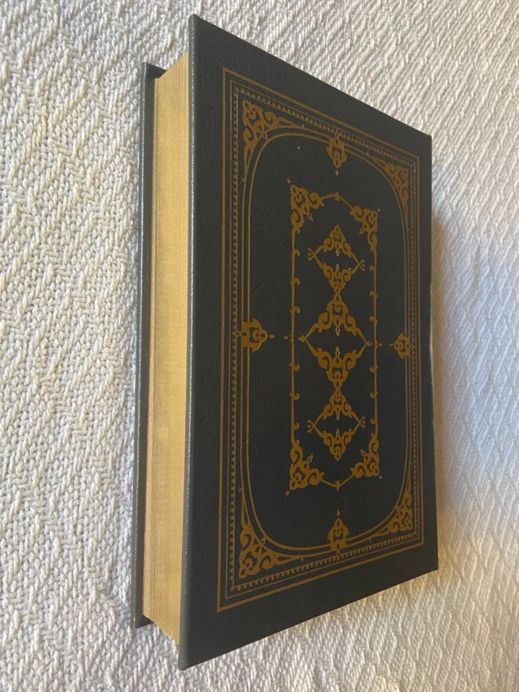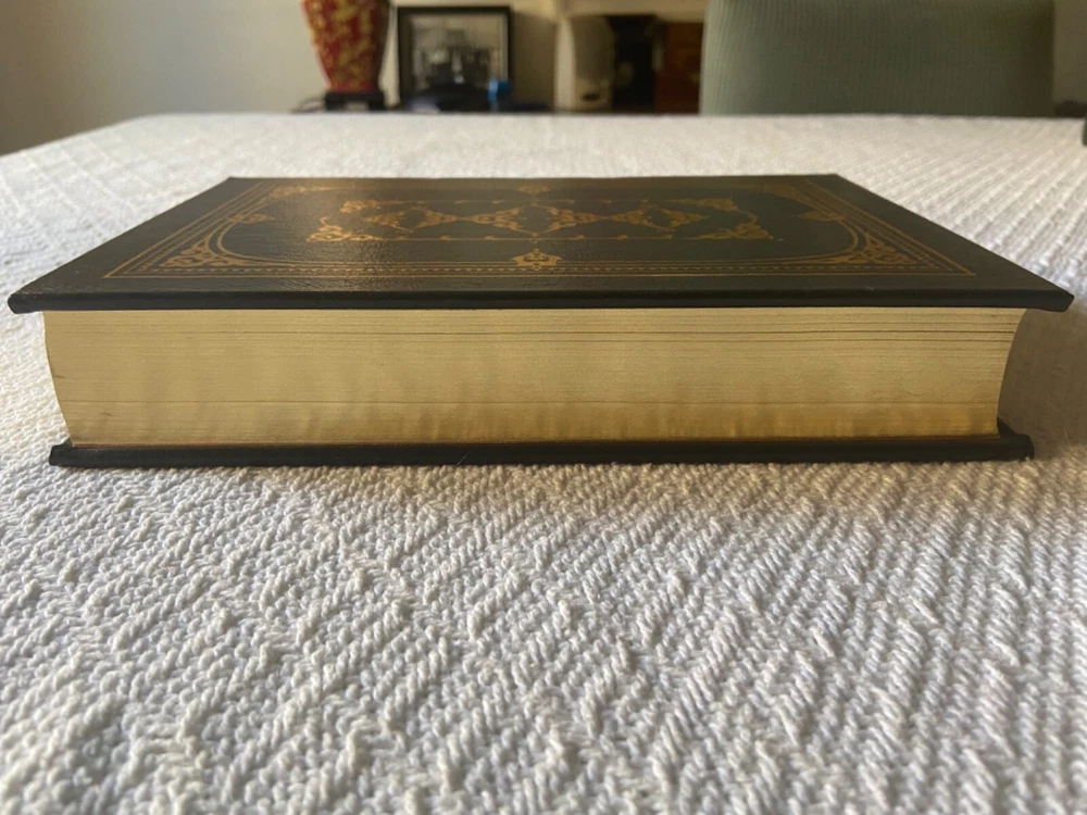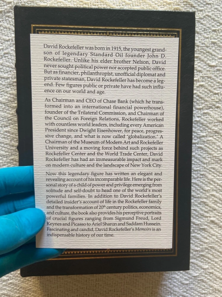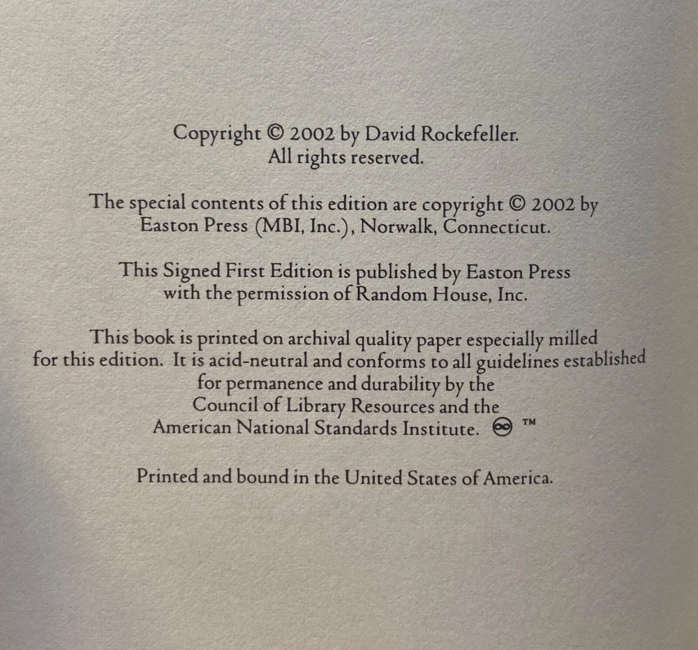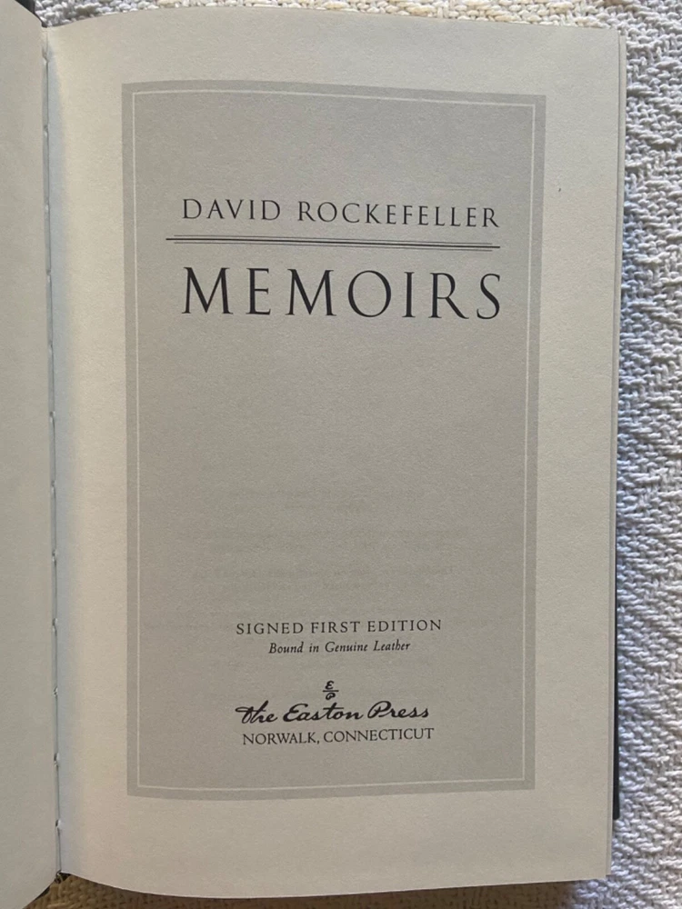 This is Easton Press’ Signed First Edition of famous banker David Rockefeller’s Memoirs, a genuine leather hardback. The exterior is a slightly textured dark grey with stunning gold designs. BESIDES THE TEAR on the signature page, t he book is in immaculate condition with no major signs of use/wear (see photos). I like to be conservative about my ratings so I would say Very Good Plus. It has the page signed by the author along with everything else: the certificate of authenticity and the special note about the book. Please reach out with any questions!