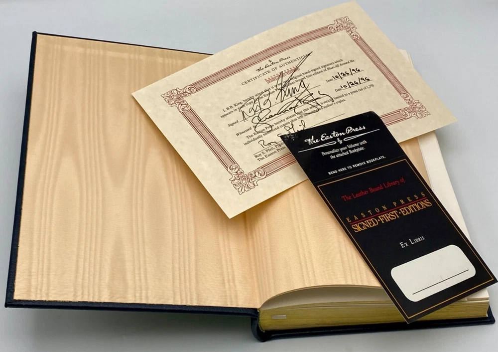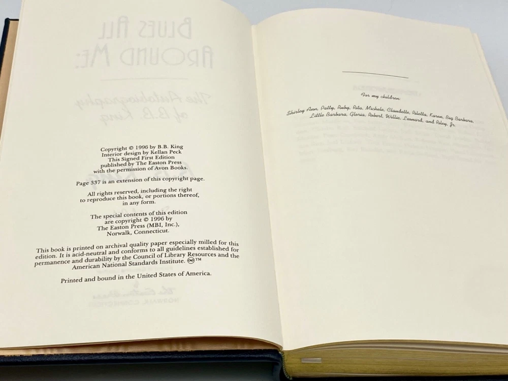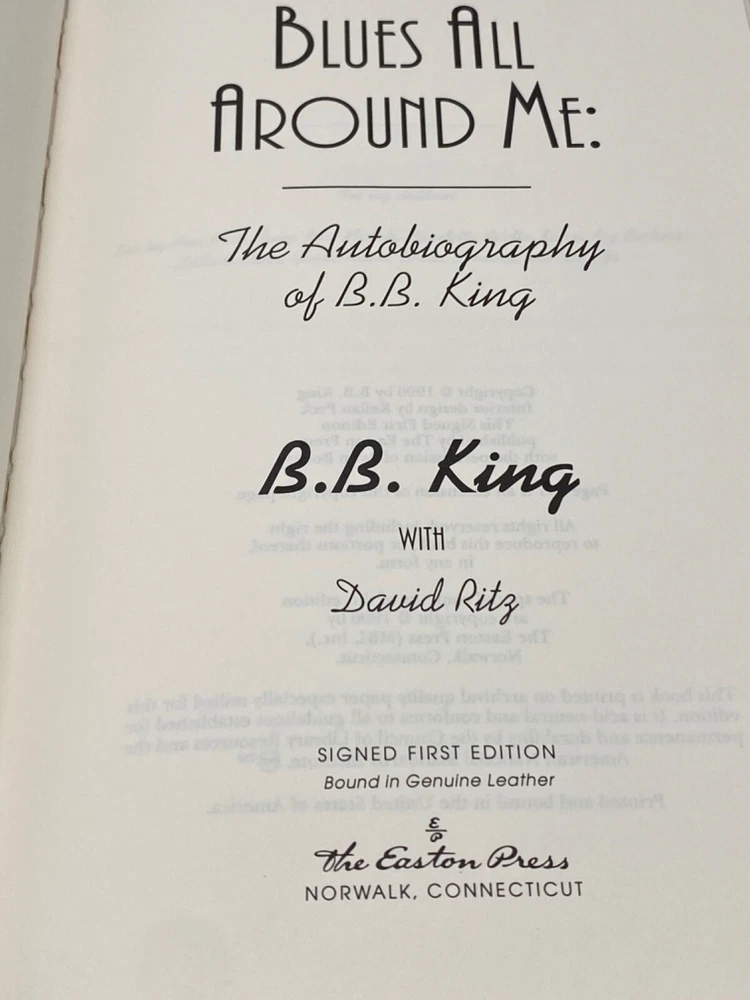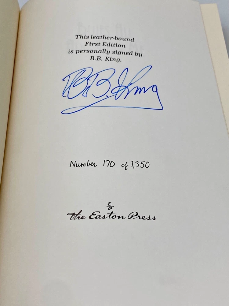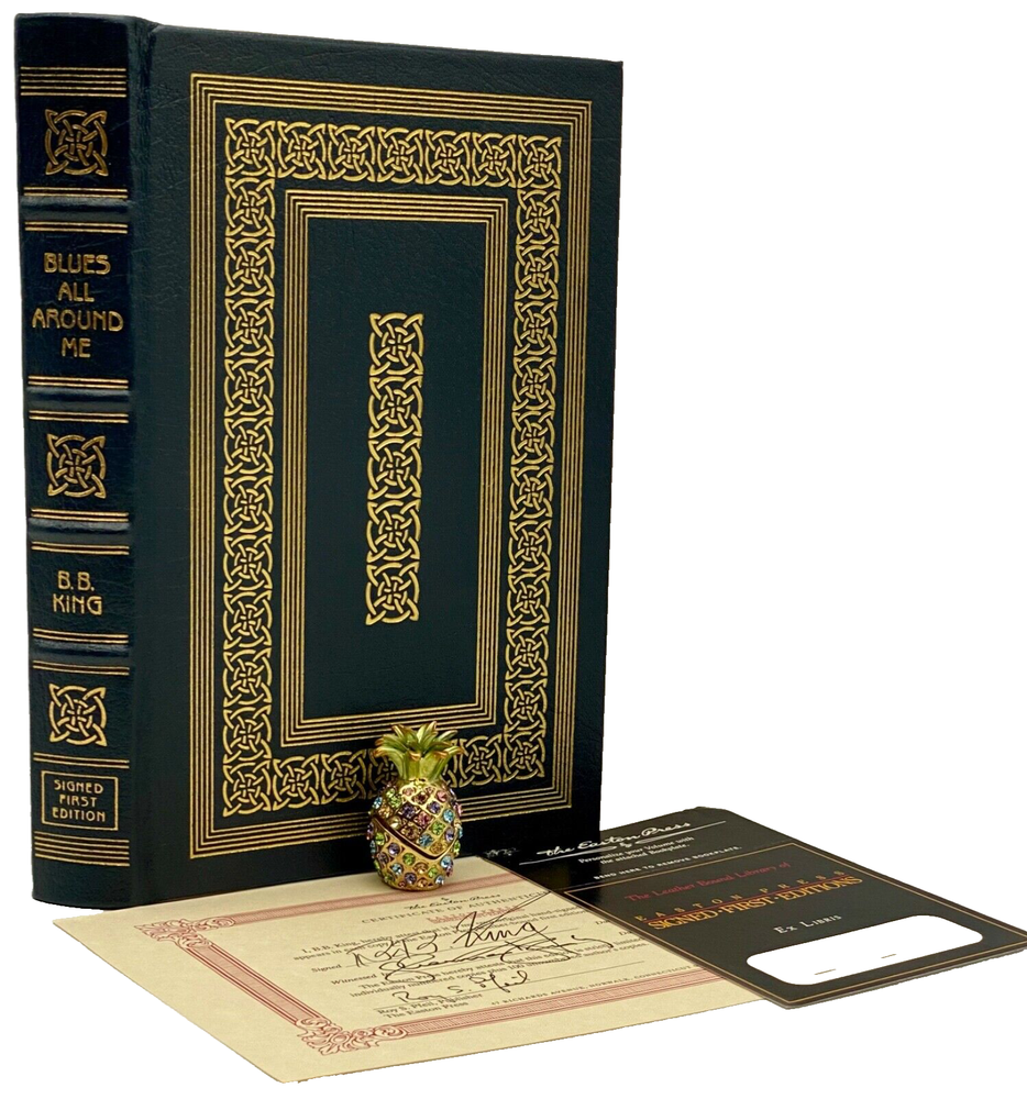 MAKES THE PERFECT GIFT FOR ANY FAN OF JAZZ MUSIC / COLLECTIBLE ✍️ SIGNED FIRST EDITIONS / COLLECTIBLE LEATHER-BOUND BOOKS / B.B. KING ** PLEASE READ : Mahalo for taking the time to look at our listing. We truly appreciate it. We always do our BEST to give you the most accurate description of these beautiful books. If, however, you have any SPECIFIC questions about the SIZE of the book, NUMBER of pages, TYPE of leather, SMELL or FEEL of the book, PLEASE email us through EBay’s mail system BEFORE you bid, and we will be HAPPY to give you more information. We want you to be completely happy with your purchase and keep you as our customers for years to come!** DESCRIPTION: Easton Press full-leather binding of BLUES ALL AROUND ME personally SIGNED by B.B. KING. THIS IS A SCARCE, ONE OF THE MOST DIFFICULT TO FIND HEIRLOOM EASTONS WITH LAVISH GILT IMPRESSIONS TO THE BOARDS AND SPINE. IT IS ONE OF THE MOST HIGHLY-PRIZED EDITIONS OF THIS MASTERPIECE. CERTIFICATE OF AUTHENTICITY & UNUSED BOOKPLATE ARE INCLUDED . 🍍 NOT INCLUDED… 😃 THESE SIGNED ✍️ EDITIONS WILL ONLY INCREASE IN VALUE OVER TIME DUE TO THE UNFORTUNATE PASSING OF B.B. KING IN 2015 ABOUT THE BOOK: Growing up in the rural poverty of the Mississippi Delta, King first experienced the blues at nine years old, when his mother passed away. The man of the house before the end of his first decade, he used this strife as a source of inspiration and launched one of the most celebrated musical careers in American history. King has led a remarkable life, and this riveting autobiography dramatizes his whirlwind adventures from the Memphis of the forties to the Moscow of the nineties with unflinching candor and sincerity. But most of all, Blues All Around me , B.B.'s story, is the story of the blues--the evolution from country acoustic to urban electric, the birth and explosion of rock 'n' roll--and B.B.'s own long, but ultimately triumphant, struggle for crossover success, during which he remained unwaveringly true to the music of his heart. CONDITION: Book is in LIKE NEW condition for its age with only a couple of minor rubs to the gilt page ends (SEE PICS FOR BETTER DETAILS). NO WRITING FROM PREVIOUS OWNER, ETC. It is a SPECTACULAR edition. SHIPPING: FREE TO US ADDRESSES ONLY. INTERNATIONAL $ based on location. WE SHIP PRIORITY MAIL & PACK VERY WELL. Please check out our other listings of Easton Press, Franklin Library, Limited Editions Club, First Edition Library, International Collectors Library, Heritage Press, and Folio Society editions. WE DO COMBINE SHIPPING IF YOU PURCHASE MORE THAN ONE COPY. Mahalo for looking at our listings! By bidding/purchasing this item, you are helping a very grateful family who sends you our WARMEST ALOHA & MAHALO!