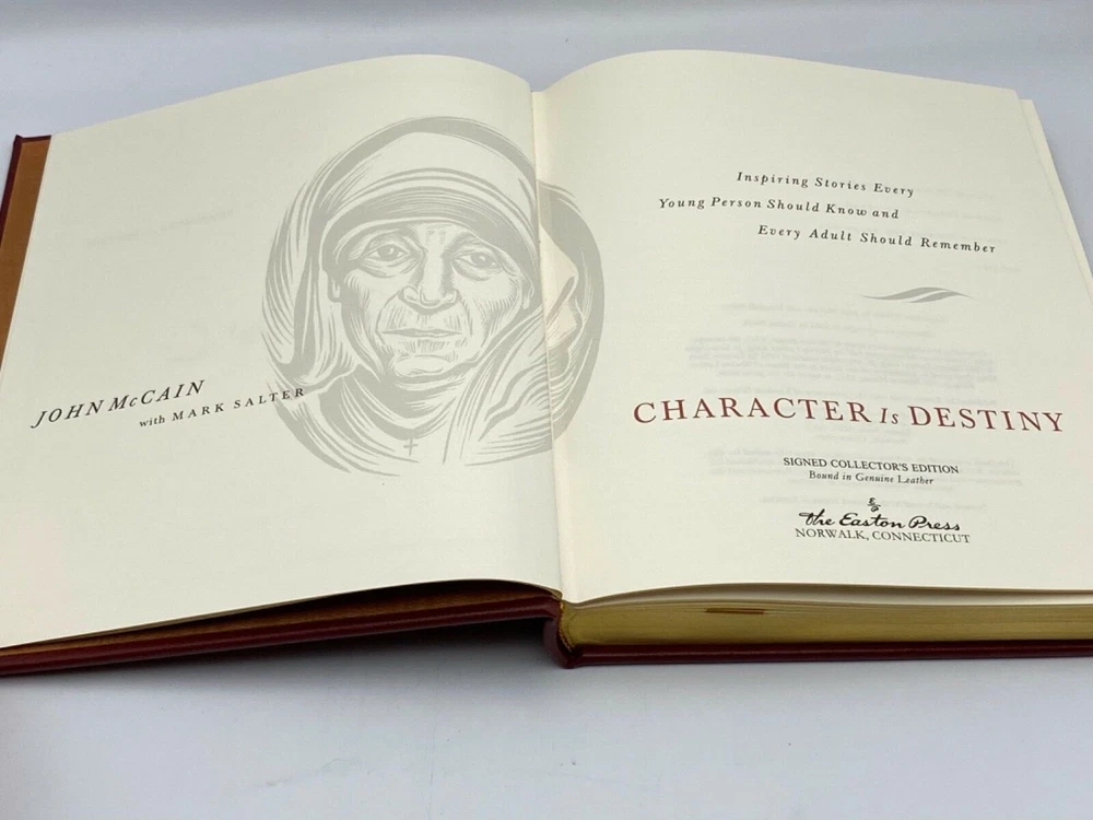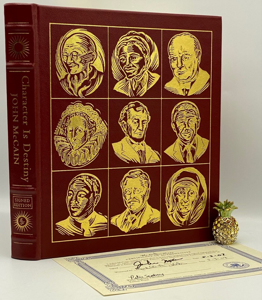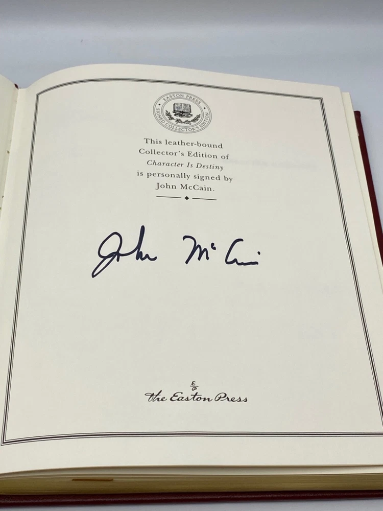 MAKES THE PERFECT GIFT FOR ANY FAN OF JOHN McCAIN / AUTOBIOGRAPHIES ** PLEASE READ : Mahalo for taking the time to look at our listing. We truly appreciate it. We always do our BEST to give you the most accurate description of these beautiful books. If, however, you have any SPECIFIC questions about the SIZE of the book, NUMBER of pages, TYPE of leather, SMELL or FEEL of the book, PLEASE email us through EBay’s mail system BEFORE you bid, and we will be HAPPY to give you more information. We want you to be completely happy with your purchase and keep you as our customers for years to come!** DESCRIPTION: Easton Press full-leather binding SIGNED edition. THIS IS AN HEIRLOOM EASTON WITH LAVISH GILT IMPRESSIONS TO THE BOARDS AND SPINE with BEAUTIFUL PHOTOGRAPHS. IT IS ONE OF THE MOST HIGHLY-PRIZED EDITIONS OF THIS BEAUTIFUL AUTOBIOGRAPHY BY McCAIN. 🍍 NOT INCLUDED... 😃 ABOUT THE BOOK: In Character is Destiny , McCain tells the stories of celebrated historical figures and lesser-known heroes whose values exemplify the best of the human spirit. He illustrates these qualities with moving stories of triumph against the odds, righteousness in the face of iniquity, hope in adversity, and sacrifices for a cause greater than self-interest. The tributes he pays here to men and women who have lived truthfully will stir the hearts of young and old alike, and help prepare us for the hard work of choosing our destiny. CONDITION: Book is in LIKE NEW condition for its age with only a few faint negligible rubs to the gilt page ends (SEE PICS FOR FURTHER DETAILS). NO ATTACHED BOOKPLATES, WRITING FROM PREVIOUS OWNER, ETC. It is a GORGEOUS EDITION. SHIPPING: FREE TO US ADDRESSES ONLY. INTERNATIONAL $ based on location. WE SHIP PRIORITY MAIL & PACK VERY WELL. Please check out our other listings of Easton Press, Franklin Library, Limited Editions Club, First Editions Library, Folio Society, Heritage Press, and International Collectors Library editions. WE DO COMBINE SHIPPING IF YOU PURCHASE MORE THAN ONE COPY. Mahalo for looking at our listings! By bidding/purchasing this item, you are helping a very grateful family who sends you our WARMEST ALOHA & MAHALO!