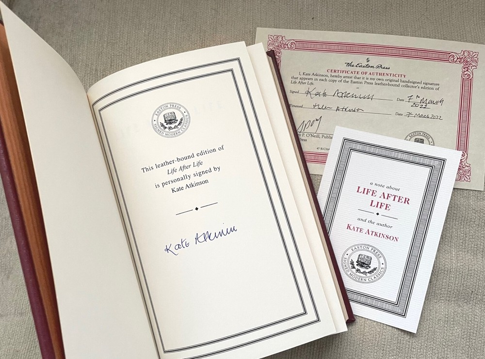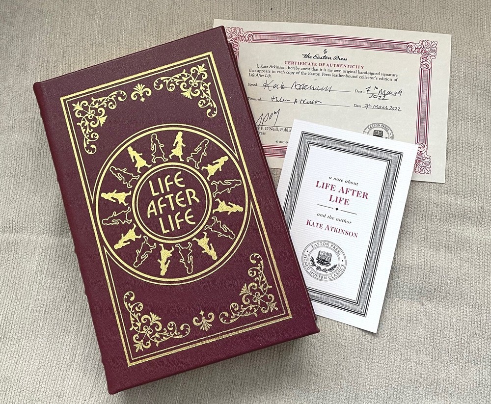 LIFE AFTER LIFE signed by Kate Atkinson Easton Press, with Certificate of Authenticity and original notes. What if you could live again and again, until you got it right? On a cold and snowy night in 1910, Ursula Todd is born to an English banker and his wife. She dies before she can draw her first breath. On that same cold and snowy night, Ursula Todd is born, lets out a lusty wail, and embarks upon a life that will be, to say the least, unusual. For as she grows, she also dies, repeatedly, in a variety of ways, while the young century marches on towards its second cataclysmic world war. Does Ursula's apparently infinite number of lives give her the power to save the world from its inevitable destiny? And if she can -- will she? Named a New York Times Best Book of the Century, Life After Life is darkly comic, startlingly poignant, and utterly original: this is Kate Atkinson at her absolute best. The book is unread. The ribbon bookmark has never been moved. Questions please email me. USPS media mail shipping with delivery confirmation. US buyers only.