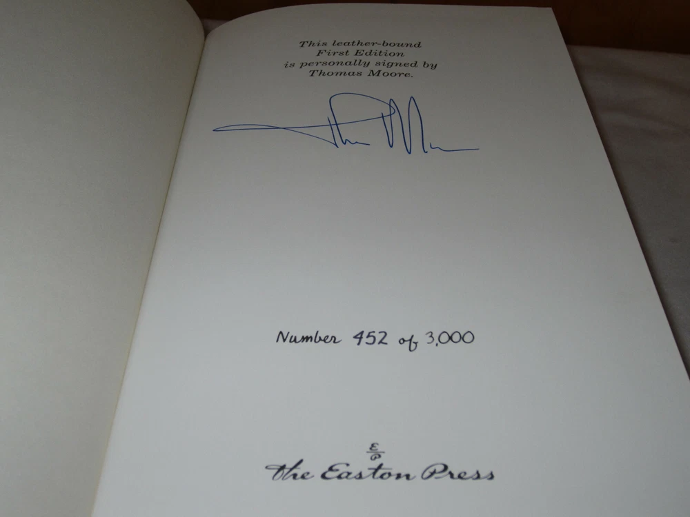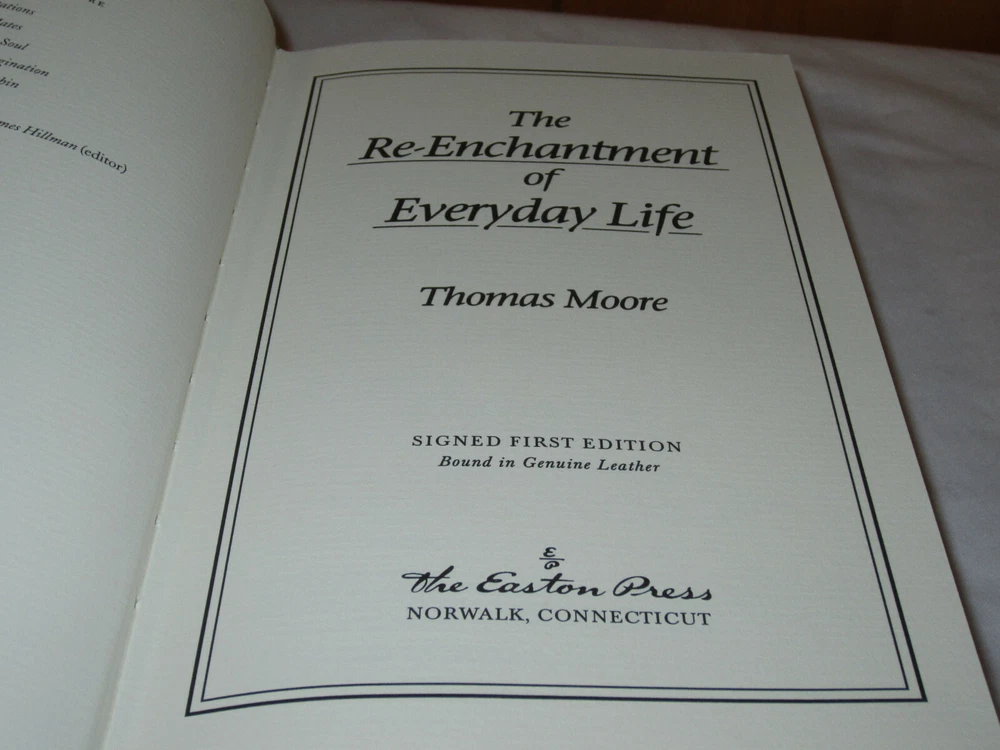 From the Easton Press Signed First Editions Collection... The Re-Enchantment of Everyday Life PERSONALLY SIGNED by Author Thomas Moore Easton Press Signed First Edition Copyright 1996 by The Easton Press Number 452 of 3,000 Signed Copies Bound in Premium Full Leather This Signed First Edition contains all of the classic Easton Press trimmings: Premium Leather Silk Moire Endleaves Distinctive Cover Design Hubbed Spine, Accented in Real 22KT Gold Satin Ribbon Page Marker Gilded Page Edges Long-lasting, High Quality Acid-neutral Paper Smyth-sewn Pages for Strength and Durability A very scarce title in any condition, this copy is in Fine condition. The front and back covers are both in near perfect condition and the gilded page edges show hardly any wear! There is NO attached bookplate nor any other signs of previous ownership. This edition is limited to only 3,000 signed copies; this being number 452. This book is personally signed by Thomas Moore and would be a beautiful addition to your Easton Press collection. Overall, this copy is a grade collector's book. This book is very elusive in this superior condition, as only a limited number of them were ever published, so now is the time to act. Hopefully you can add this book to your collection and enjoy it in the years to come... Please Email Me With Any Questions You Might Have! Shipping Info: Buyer to Pay Shipping and Handling International Bidders Pay Extra Shipping Seller Not Responsible For Uninsured Items Lost or Damaged in Mail Forms of Payment Accepted: Paypal Good luck and happy bidding! Powered by eBay Turbo Lister The free listing tool. List your items fast and easy and manage your active items.