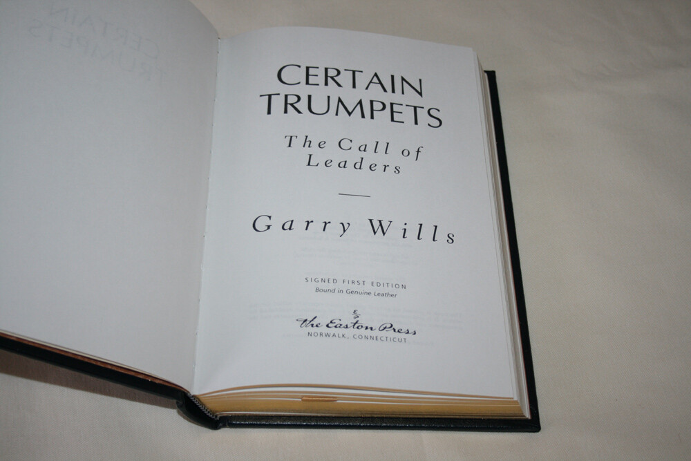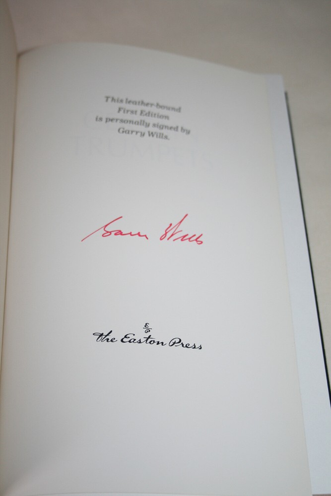 From the Easton Press Collection... Certain Trumpets The Call of Leaders PERSONALLY SIGNED by Garry Wills Easton Press Signed First Edition Copyright 1994 by The Easton Press Bound in Premium Full Leather This Signed First Edition contains all of the classic Easton Press trimmings: Premium Leather Silk Moire Endleaves Distinctive Cover Design Hubbed Spine, Accented in Real 22KT Gold Satin Ribbon Page Marker Gilded Page Edges Long-lasting, High Quality Acid-neutral Paper Smyth-sewn Pages for Strength and Durability A very scarce title in any condition, this copy is in Absolute Mint and Unread condition. The front and back covers are both in Perfect condition and the gilded page edges show no wear at all! This book is personally signed by Garry Wills as issued by the publisher and comes with an attached bookplate from the previous owner. It would be a beautiful addition to your Easton Press collection. Overall, this copy is a grade collector's book. This book is very elusive in this superior condition, as only a limited number of them were ever published, so now is the time to act. Hopefully you can add this book to your collection and enjoy it in the years to come... The Pulitzer Prize-winning author of Lincoln at Gettysburg offers a gallery of portraits that examine the interplay among leaders and followers and identify the essential elements of successful leadership. Please Email Me With Any Questions You Might Have! Shipping Info: Buyer to Pay Shipping and Handling International Bidders Pay Extra Shipping Seller Not Responsible For Uninsured Items Lost or Damaged in Mail Forms of Payment Accepted: Paypal Good luck and happy bidding! Powered by eBay Turbo Lister The free listing tool. List your items fast and easy and manage your active items.