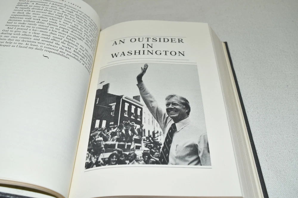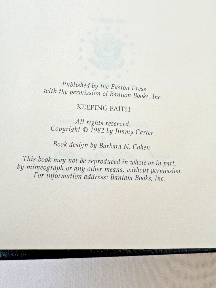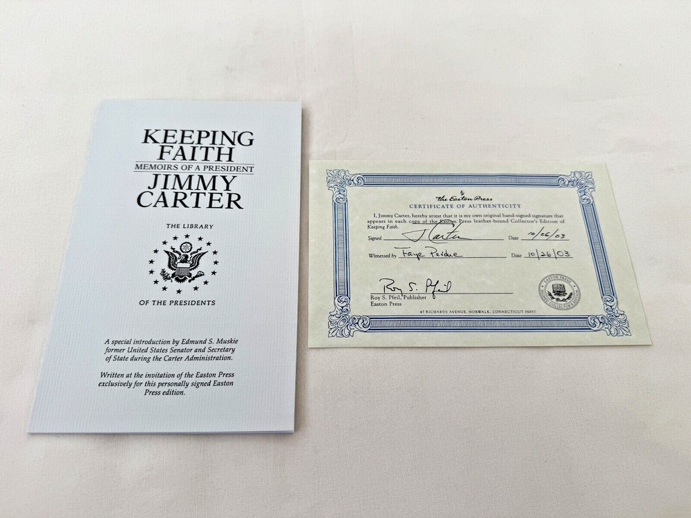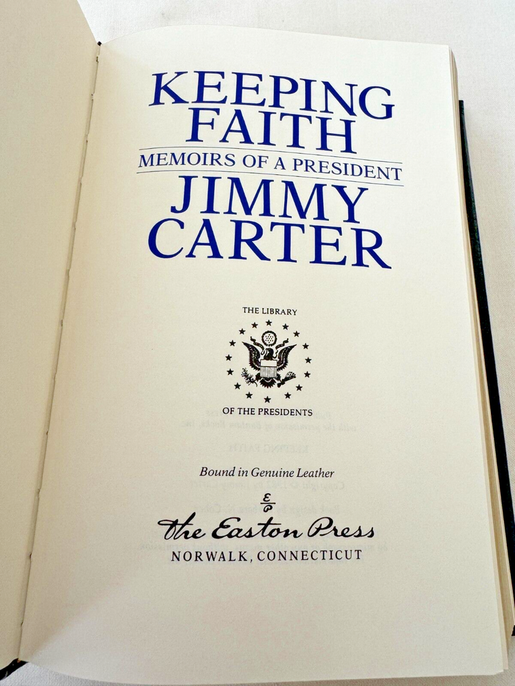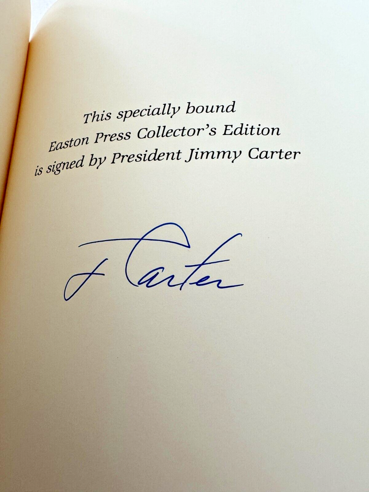 From the Easton Press Library of the Presidents Collector's Edition Series... Keeping Faith Memoirs of a President SIGNED by Former President Jimmy Carter Copyright 1982 by The Easton Press Bound in Premium Full Leather Collector's Edition This volume contains all of the classic Easton Press trimmings: Premium Leather Decorated Endleaves Distinctive Cover Design Hubbed Spine, Accented in Real 22KT Gold Satin Ribbon Page Marker Gilded Page Edges Long-lasting, High Quality Acid-neutral Paper Smyth-sewn Pages for Strength and Durability Beautiful Illustrations A very scarce title in any condition, this Signed Edition is in Fine and Unread condition. The front and back covers are both in near Perfect condition and the gilded page edges show hardly any wear at all! There are no writing, markings, bookplates, or other signs of prior ownership in this book. The binding is tight and square without spine lean. This book is part of the Library of Presidents published by Easton Press and comes complete with a Collector's Notes. It would be a beautiful addition to your Easton Press collection. Overall, this copy is a grade collector's book. This book is very elusive in this superior condition, as only a limited number of them were ever published, so now is the time to act. Hopefully you can add this book to your collection and enjoy it in the years to come... Please Email Me With Any Questions You Might Have! Shipping Info: Buyer to Pay Shipping and Handling International Bidders Pay Extra Shipping Good luck and happy bidding!