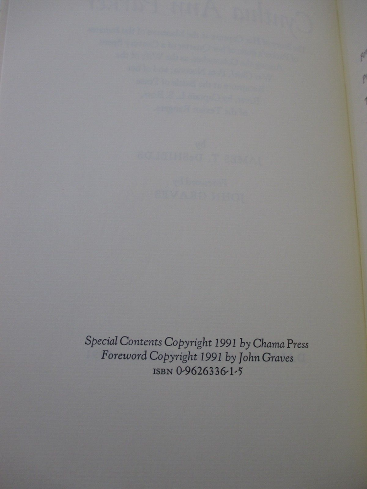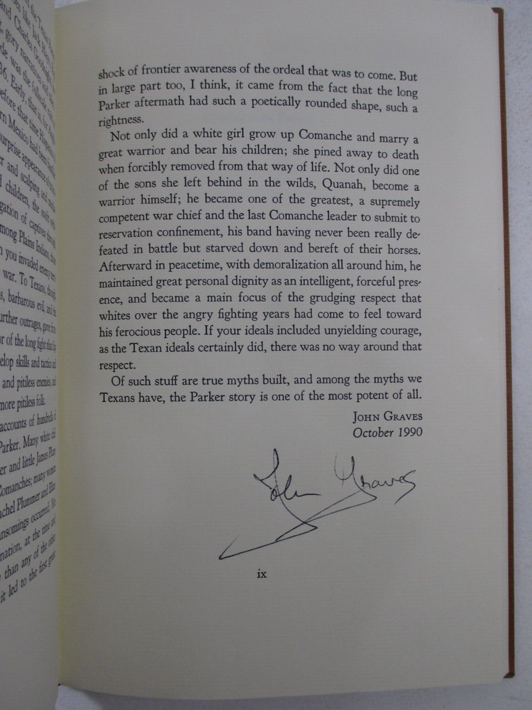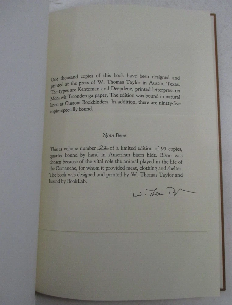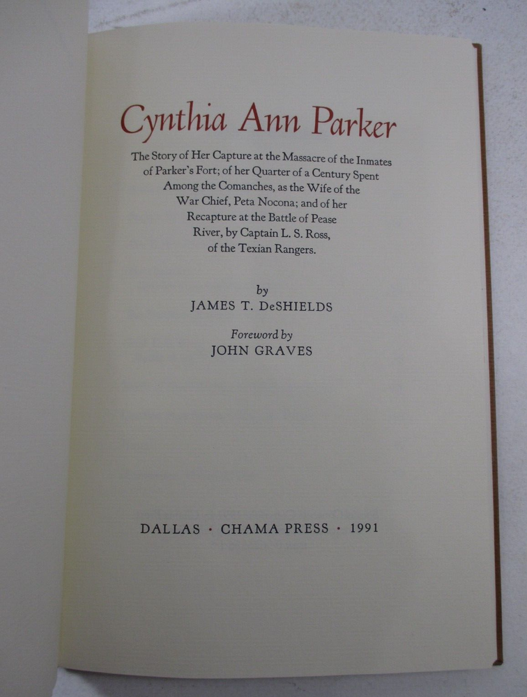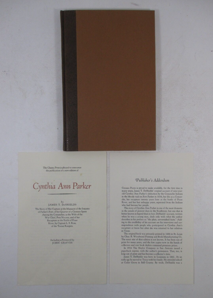 For sale is a SIGNED limited edition special leather-bound copy of Cynthia Ann Parker: The Story of Her Capture at the Massacre of the Inmates of Parker's Fort... by James T. DeShields. SIGNED by JOHN GRAVES at the end of the foreword. Also SIGNED by W. Thomas Taylor (the designer and printer) and numbered 22 of only 95 limited edition, signed copies bound in leather. Published by Chama Press, in 1991. Includes Publisher's Addendum and publication notice that originally came with the book. Binding is sound and pages are unmarked. 1/4 leather-bound cover is clean and square, and is now protected in a clear, removable sleeve. shelf reference #L-1217