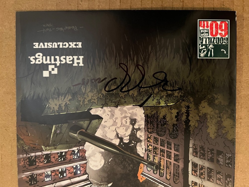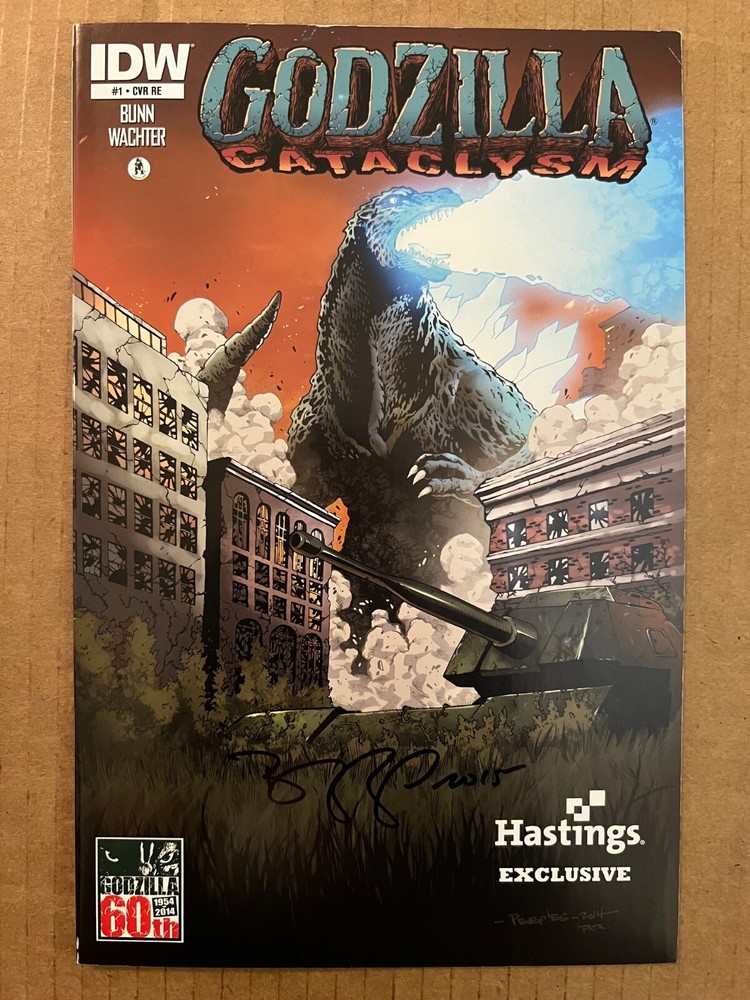 Signed by Brent Peeples (cover artist). Dive into the prehistoric chaos of "Godzilla: Cataclysm" with this exclusive variant cover of issue #1, signed by the talented Brent Peeples. Published by IDW Publishing in August 2014, this modern-age comic book delivers a thrilling blend of action and science fiction, featuring the iconic monster that has captivated audiences for decades. This single issue comic book is a collector's gem, presented in a 7.0 Fine/Very Fine grade. It's a retailer exclusive edition with Hastings' exclusive cover, and it comes boarded and bagged for protection. Enjoy the vivid color style and expand your universe with this engaging tale of Godzilla and his colossal adventures.