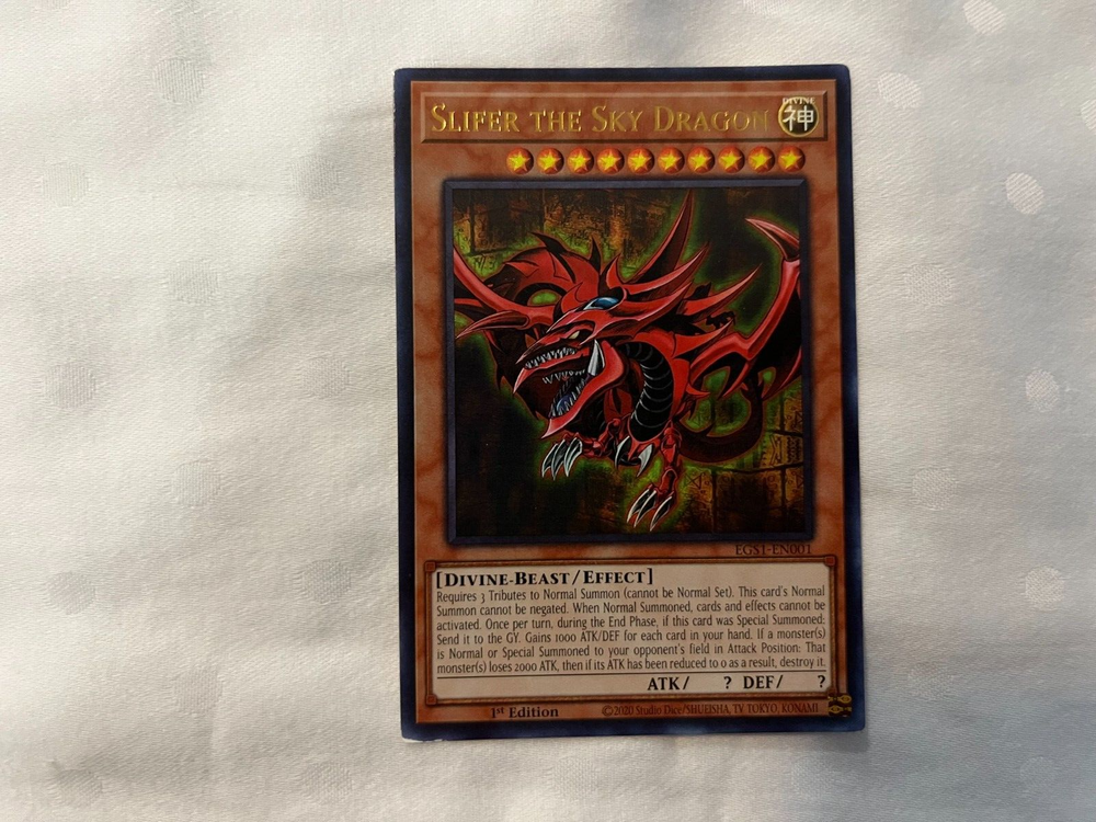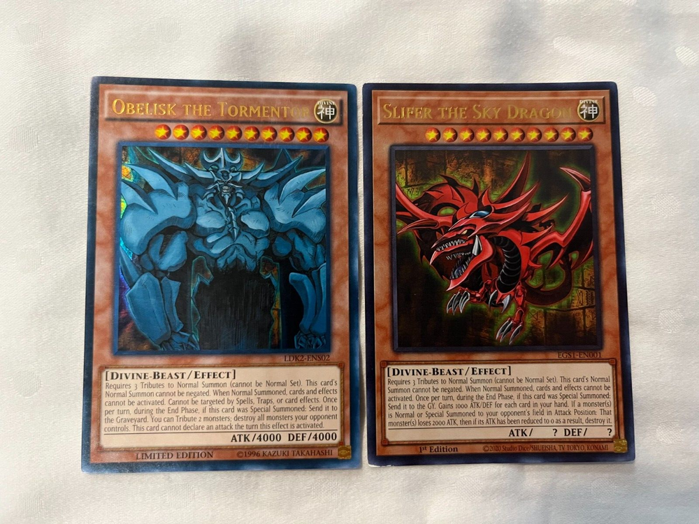 SLIFER THE SKY DRAGON OBELISK THE TORMENTOR ULTRA RARE LDK2-ENS02 EGS1-EN001 YGO AS SHOWN IN PICTURES: ALL CARDS ARE IN NEAR MINT OR VERY LIGHTLY PLAYED CONDITION! GREAT CONDITION! SLIFER THE SKY DRAGON (ULTRA RARE) OBELISK THE TORMENTOR (ULTRA RARE) ALL orders from my store will be shipped in a small envelope WITH tracking shipped with an eBay standard envelope tracking label. See shipping price! Handling time is 2 days, and then the item will be shipped immediately!