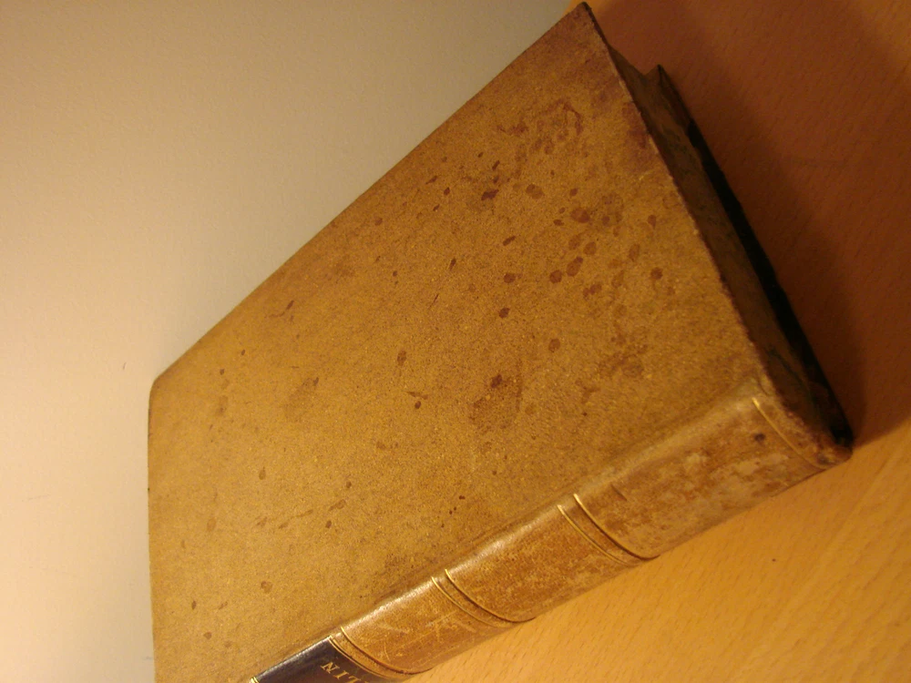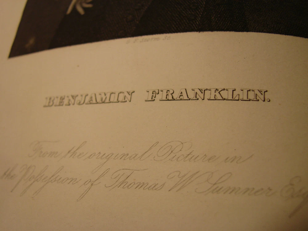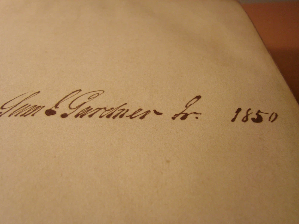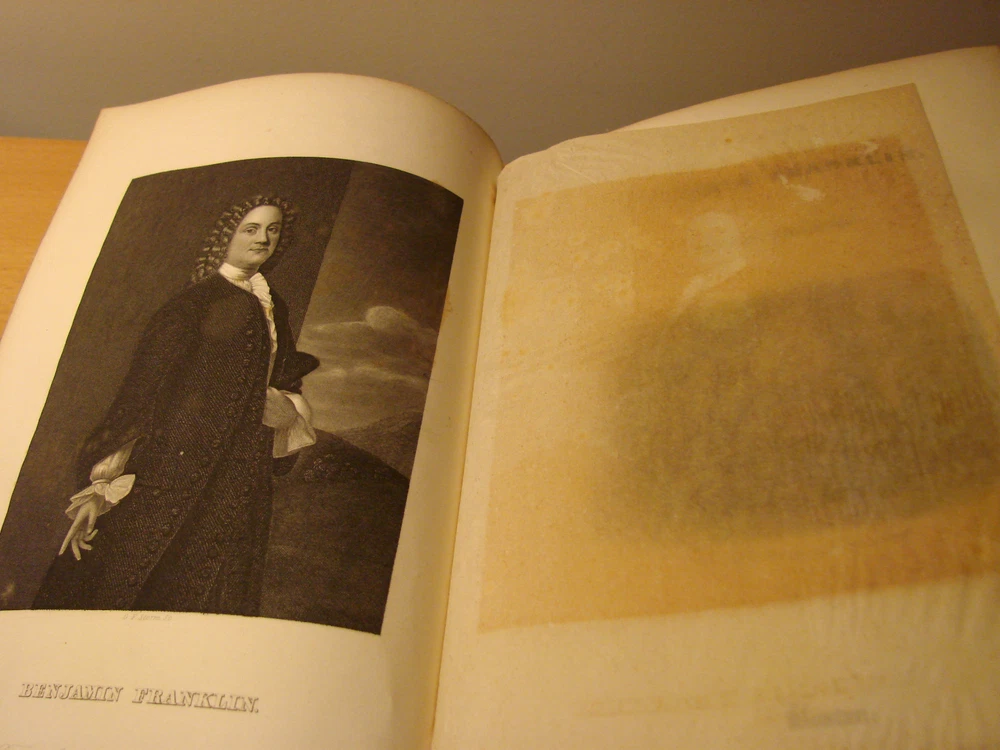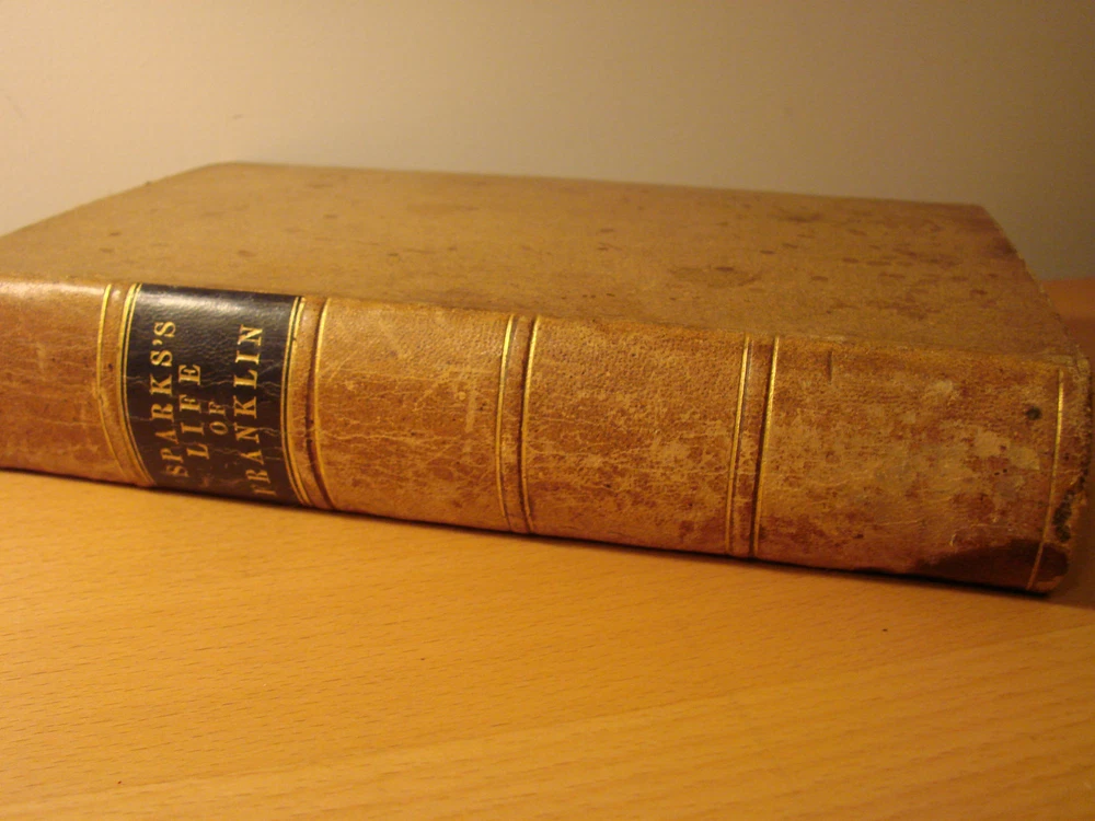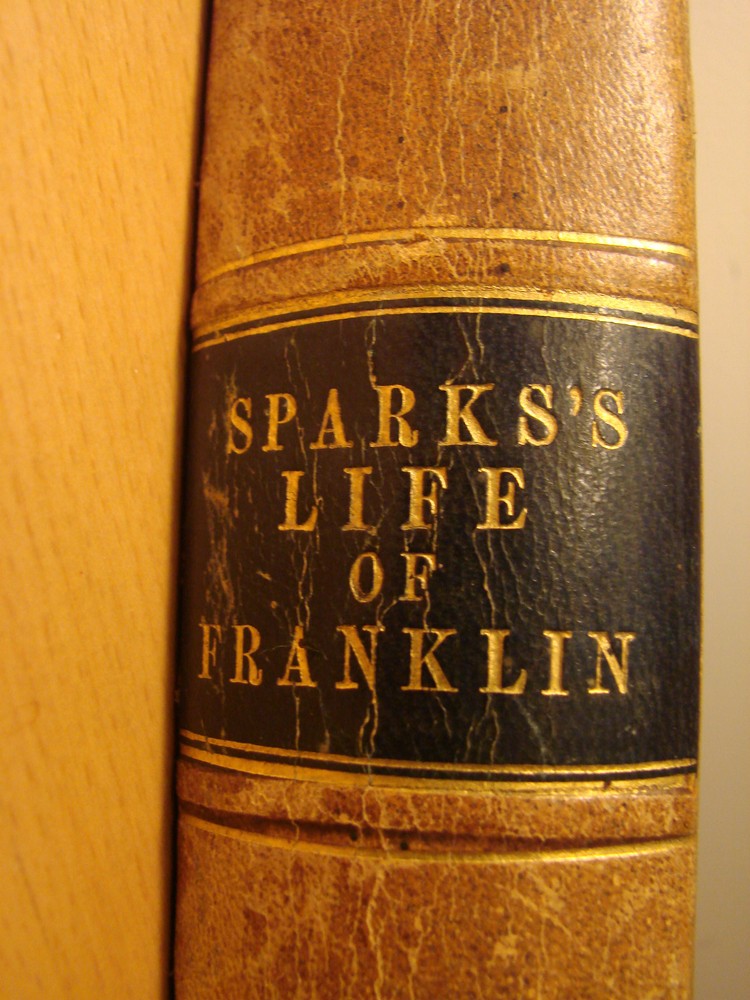 Direct from a New England attic this morning comes this wonderful book: THE LIFE OF BENJAMIN FRANKLIN by Jared Sparks. The book is bound in leather with gilt lettering. There is staining and wear on the cover, consistent with age, but the binding is tight and in remarkably good condition. The interior is in good condition, but there is some staining to the very bottom of the page to pages 492 to the end. The book measures 6 x 9.5. It was printed in Boston by Tappan and Dennett in 1844 and has 611 pages. Despite the relatively minor defects (considering the age of the book), I think it is very good condition. Please see a similar volume, Sparks' Life of Washington, being offered in another auction. Please email with questions.
