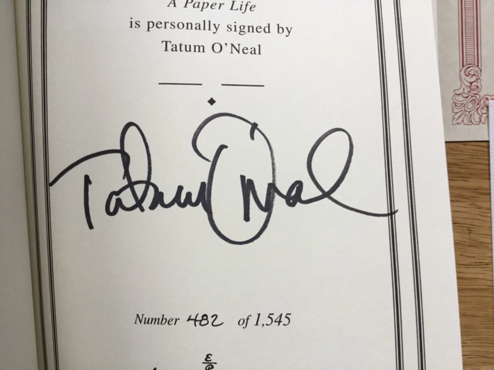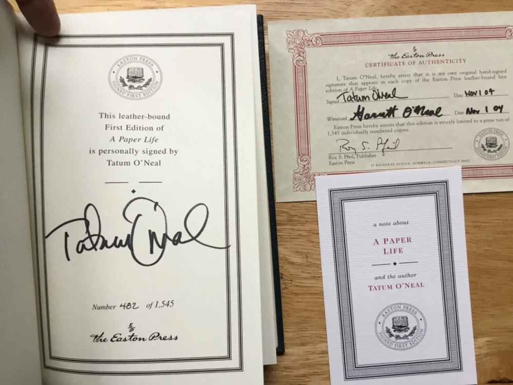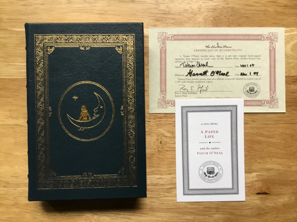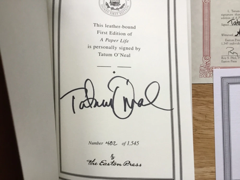 TATUM O'NEAL This is a Mint Condition Never Read Easton Press Signed First Edition, Limited Edition (#482 of 1545) Leather Bound Book, Titled: "A Paper Life", Signed Boldly in Black by Tatum O'Neal. Easton Press and Franklin Library Books are Bound in Genuine Leather and Feature: *Distinctive Cover Designs, *Hubbed Spines, Accented in Real 22KT Gold, *Silk Moire Endleaves, *Gilded Page Edges, *Permanent Satin Ribbon Page Marker, *Smyth-Sewn Pages For Strength and Durability, *Long Lasting High Quality Acid-Neutral Paper, *Beautifully Illustrated. Check Out Our Ebay Store *Please visit our Ebay Store SuperStarsGallery or just click on "See other items" above in this listing. Where you can view our entire inventory of over 1000 unique & one-of-a-kind In-Person obtained Signed items - JSA, PSA/DNA & BAS/Beckett Authenticated along with Limited Edition Autographed items. **YOU WON'T BE DISAPPOINTED** **New Items listed almost daily so check back often or just click Save Seller below in this listing to be the first to see the newest items. Shipping FAST ONE BUSINESS DAY SHIPPING *All items are shipped via the United States Postal Service (USPS) within **One business day of purchase**. *Individual shipping fees are posted in the listing. *Domestic and International Shipping: All items are shipped First Class Mail unless otherwise stated in the listing. Packaging PHOTO(S) - All our photos are placed into individual protective sleeves and packaged between two thick custom cut pieces of cardboard. Photo(s) are then placed into an envelope that is boldly marked "PHOTOS - DO NOT BEND". MEMORABILIA - First all items are carefully placed into a protective sleeve or bubble wrap. Items are then boxed using generous amounts of padding material (packing popcorn or something similar). The box is then boldly marked "FRAGILE". Payment Method We accept all major forms of credit cards through PayPal. Please let us know if you are using other forms of payment - So we can have your item carefully packaged & ready to ship. Return Policy Any item can be returned for a full refund for any reason within 30 days of purchase. Additionally, all of our In-Person Signed items are Guaranteed Authentic for life. We guarantee that they will pass any examination by all major authentication service, such as GAI, BAS/Beckett, PSA/DNA or JSA , etc.