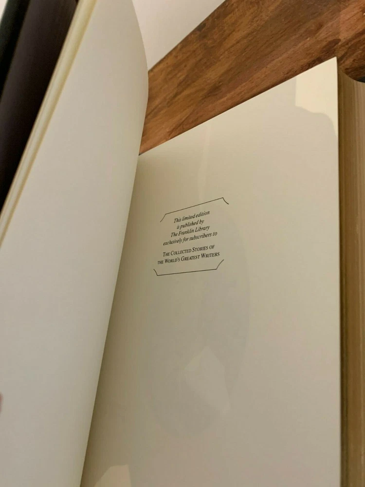 This is full genuine leather bound in new and sealed condition, never opened or read. The publisher's notes booklet is inside the plastic wrap. The first photo includes my own copy shown here for exemplification only. This book is the perfect find, perhaps the last one to be found in original wrapping. It laid in waiting for nearly 40 years to find its unique loving owner. The 3 stories included are: •The Sad Fortunes of Rev. Amos Barton •Mr. Gilfil's Love-Story •Janet's Repentance Note (condition check): addressing concerns from some buyers, I can confirm the book's condition by opening the packaging, upon commitment to buying it, should the book reveals itself to be as pristine as I expect it to be. 'Scenes of Clerical Life' by George Eliot is one of Franklin Library's ‘Collected Stories of the World's Greatest Writers’, with wonderful attributes: •Fully and tightly bound in genuine leather. •22kt gold accents deeply inlaid on the "hubbed" spine and covers. •Heavy duty binding boards enhance the book’s durability. •Superbly printed on acid-neutral paper that lasts for generations. •Sewn pages – not just glued like ordinary books. •Handsome moiré end pages and a satin-ribbon page marker. •Gold gilded page ends. •Rigorous inspection at every stage ensured adherence to exacting standards and the highest quality. •Superb craftsmanship and commitment to quality. The appeal for collecting Franklin Library comes from having these attributes taken way further into the exquisite quality, durability and craftmanship, than Easton Press and Folio Society managed with their productions. This book is the perfect companion out on a park bench with a hot cup of coffee or snuggled up in front of the fireplace. Despite its all-inclusive nature it still feels very light and compact at a size of 4 x 16 x 24cm. Wonderful to hold and excellent reading experience.