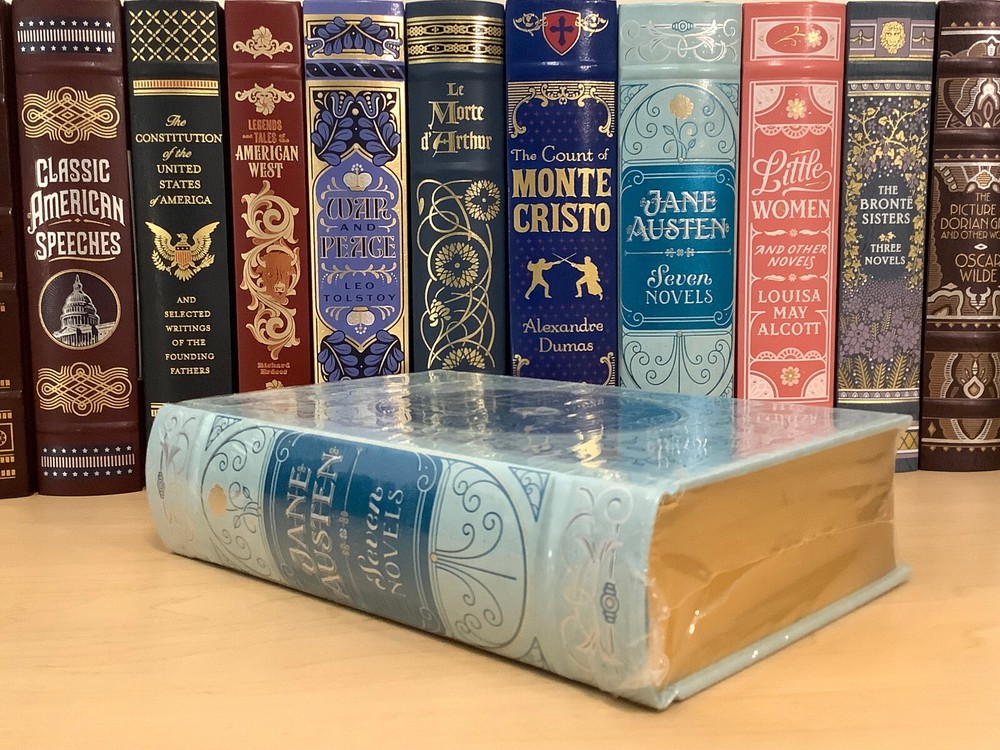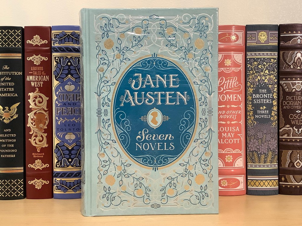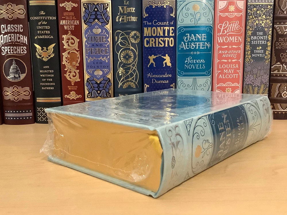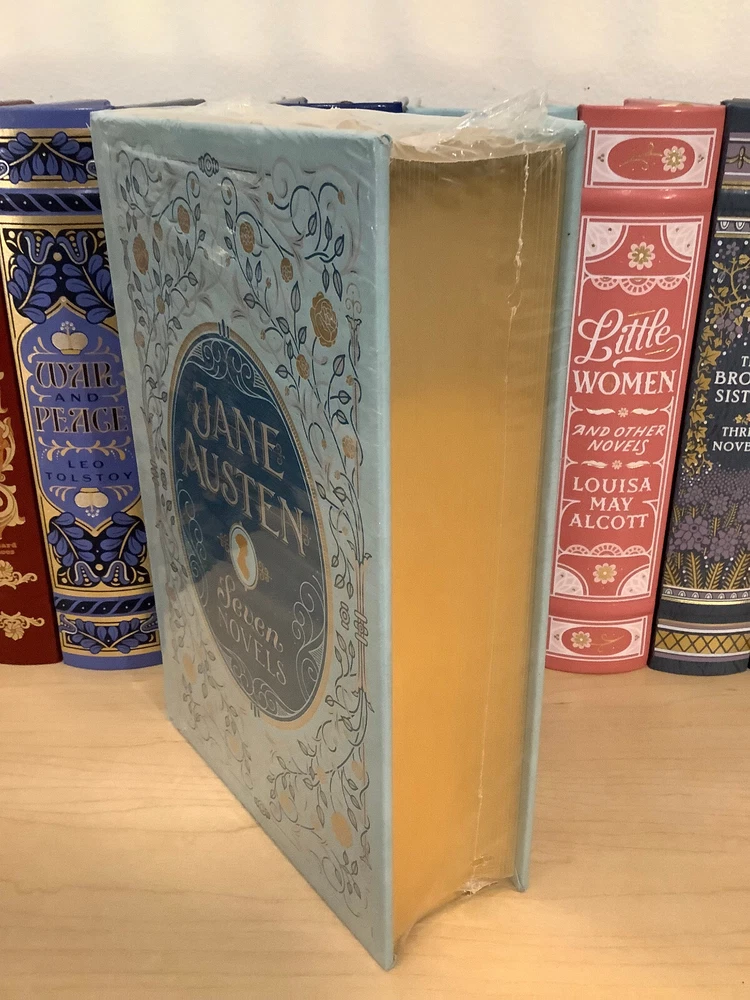Jane Austen : Seven Novels bound in leather, with gilt edged pages and a ribbon marker. Contents: Sense and Sensibility Pride and Prejudice Mansfield Park Emma Northanger Abbey Persuasion Lady Susan Item Condition: This is a hardcover leatherbound, sealed. The seal is opening and there are some flaws in the gilt edging, Dimensions are approx: 9.25" x 6.25" x 2.5" This book will ship in a box with bubble wrap. Photos 1-8 are of the actual book that will be shipped, the rest are examples of the book from an open copy.