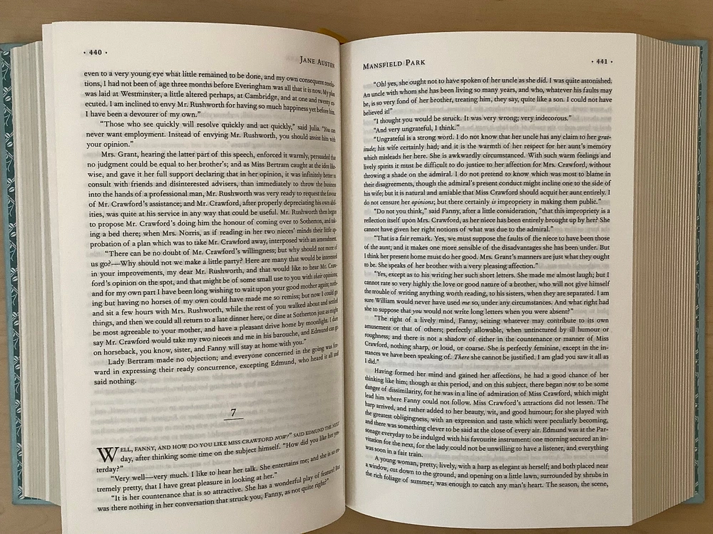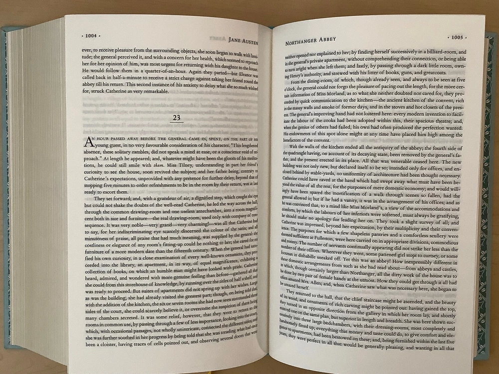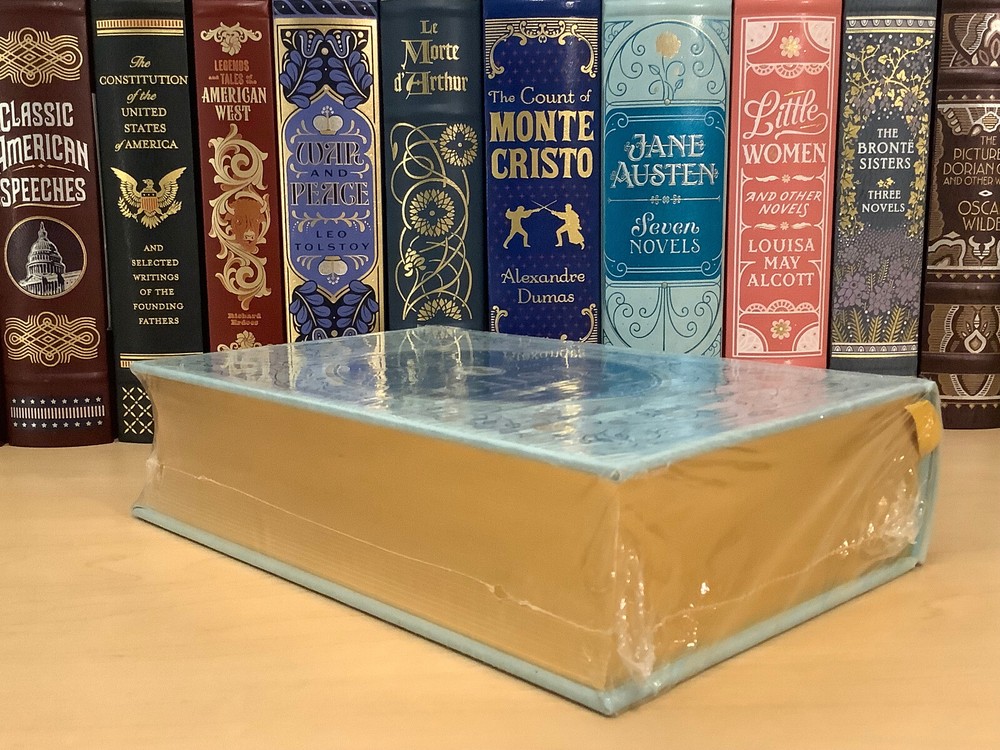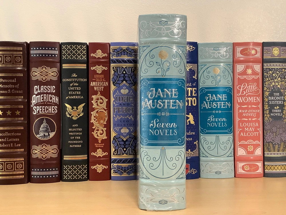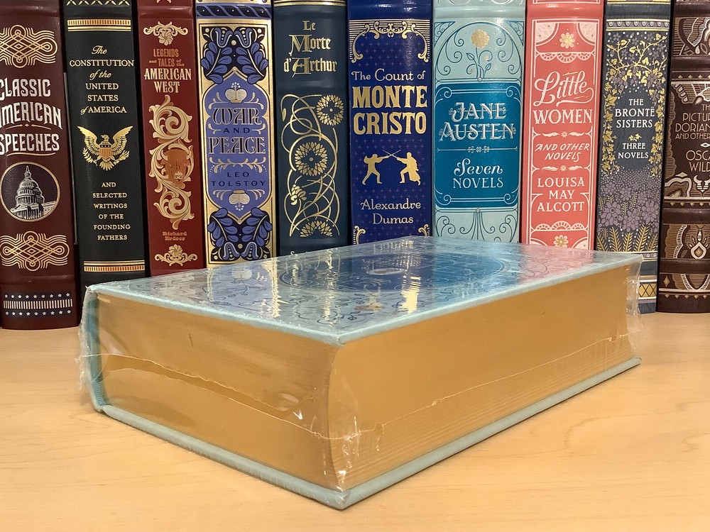 Jane Austen : Seven Novels bound in leather, with gilt edged pages and a ribbon marker. Contents: Sense and Sensibility Pride and Prejudice Mansfield Park Emma Northanger Abbey Persuasion Lady Susan Item Condition: This is a hardcover leatherbound, sealed. The seal is opening and there are some flaws in the gilt edging, Dimensions are approx: 9.25" x 6.25" x 2.5" This book will ship in a box with bubble wrap. Photos 1-8 are of the actual book that will be shipped, the rest are examples of the book from an open copy.