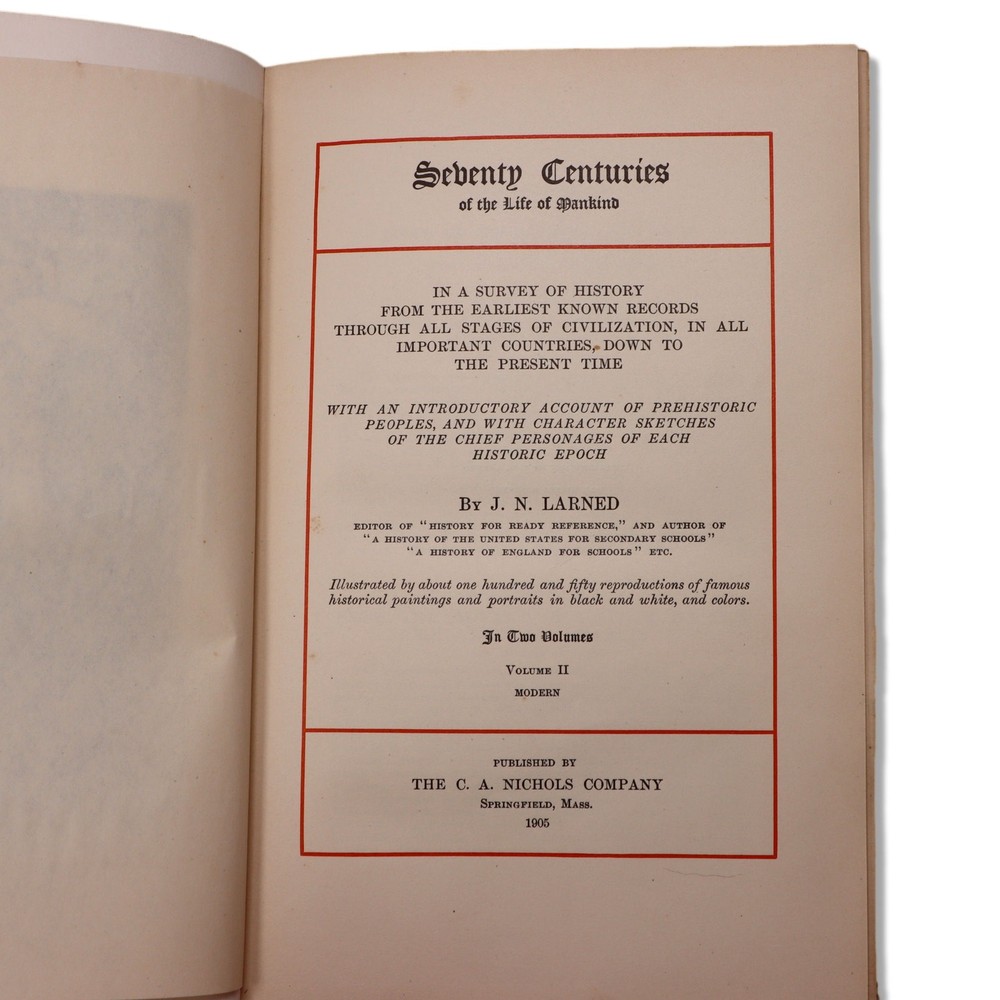 <![CDATA[<div>Seventy Centuries of the Life of Mankind Vol II 1905 JN Lerned Antique CA Nichols LB HC Title: Seventy Centuries of the Life of Mankind Vol II Modern Author: J.N. Lerned Publisher: C.A. Nichols Company, Springfield, MA Published: 1905 Edition: 1st Language: English Subject: History Illustrated (-or): Yes Ex-libri: No Binding: Maroon leather over marbled boards Pages: 509pp Condition: Very good condition. Firm binding. No marks. General tanning. Light rubbing top/bottom of spline. Size: 9" x 6" Weight: 2lb 6oz SKU: 6808.10