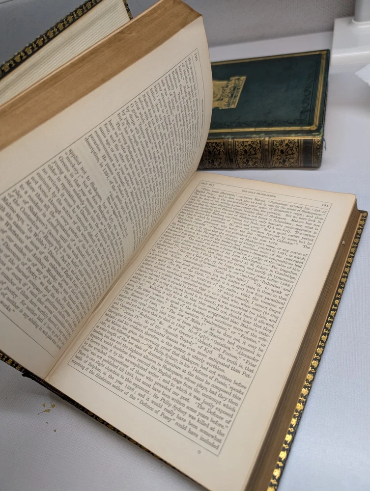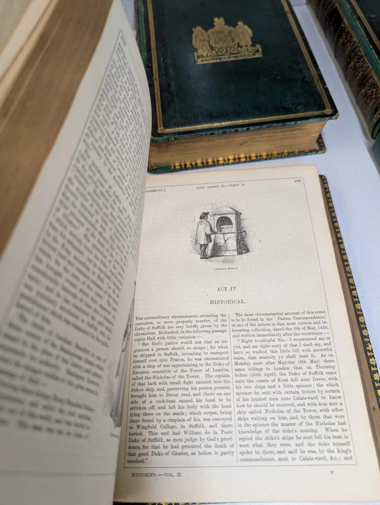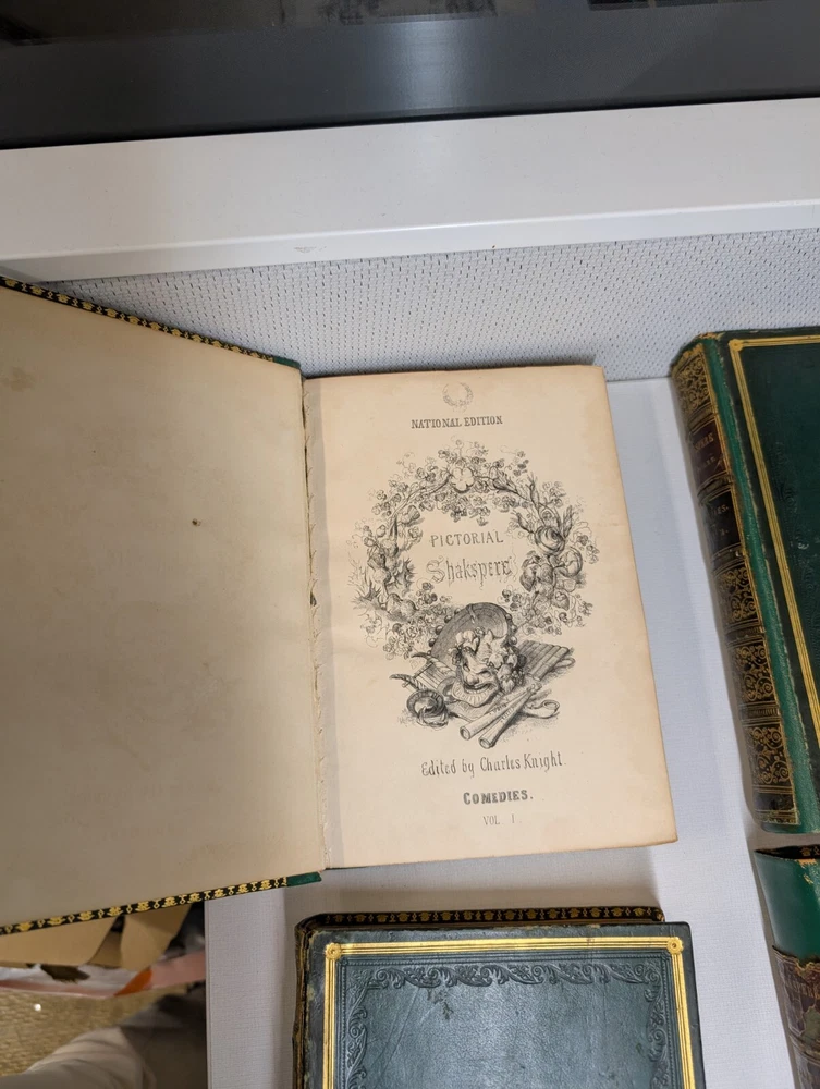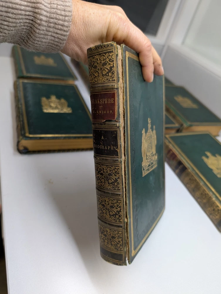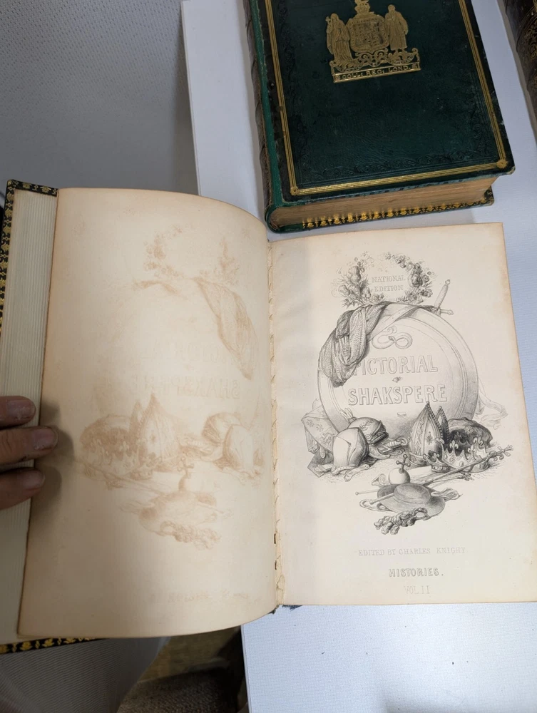 This Shakespeare 8 Volume Leather Bound Set Pictorial Edition London Charles Knight is a collector's gem. The set features the works of the legendary playwright William Shakespeare, published by George Cox, King Street, Covent Garden in 1853. The beautiful green leather binding and special gold attributes make it a valuable addition to any collection. The set includes eight volumes, each filled with the richness of Shakespeare's plays and biography. The language of the text is English and the place of publication is London. The set falls under the categories of Antiquarian & Collectible and Books & Magazines. This set is perfect for theater enthusiasts and Shakespearean collectors. Please see up close the condition of all books. All pages are intact. Biography book spine is slightly detaching. The cover spines have a slight chip to wear to it. All pages are readable. 8 Books: -Comedies vol. I -Comedies vol. II -Tragedies vol. I -Tragedies vol. II -Histories vol. I -Histories vol. II -Studies -Biography PLEASE READ ENTIRE AD IN ITS ENTIRETY AND LOOK CLOSELY AT ALL PICTURES, WHAT YOU SEE IN ALL THE PHOTOS IS WHAT YOU'LL BE GETTING. IF THERE IS ANY QUESTION OR ADDITIONAL PHOTOS NEEDED PLEASE ASK BEFORE PURCHASING OR PRIOR TO BIDDING. PLEASE!!! CONTACT ME FIRST IF THERE MIGHT BE ANY ISSUES, I AM ALWAYS WILLING TO WORK OUT ANY PROBLEM, DO NOT JUST LEAVE A NEGATIVE FEEDBACK IT DOES NOT DO ANYONE ANY GOOD. I DO MY BEST TO DESCRIBE EVERY ITEM ACCURATELY WITH A DESCRIPTION AND PHOTOS. IF I MAKE A MISTAKE I WILL COVER SHIPPING BACK TO ME AS WELL AS YOUR INITIAL SHIPPING, ONCE THE ITEM HAS BEEN RETURNED TO ME. IF THE MISTAKE IS MUTUAL (I.E. YOU DID NOT READ THE AD CLEARLY OR YOU JUST DID NOT WANT THE ITEM AFTER ALL), I WILL NOT PAY FOR RETURN SHIPPING (FAIR IS FAIR) PAYMENT IS DUE WITHIN 48 HOURS OF AUCTIONS END. We ship UPS unless otherwise stated. If buyer wants more than just a UPS tracking number such as a Signature Confirmation, additional insurances or services or ship through a different company please let us know before payment so we can make sure your item(s) are shipped accordingly or it will be ship by what you selected at checkout. We also can do combine shipping. Any items over $500 will automatically have adult signature added to shipping costs. **Please checkout my other items** BIDDING/PURCHASING: * Please review item description and check pictures for cosmetic condition and additional information. * We will not end auctions early for buy it now offers. * Payments must be received within 3 days. Unpaid cases will be open after the allotted time. Please contact us if additional time is needed. PRODUCT GUARANTEE: * We do our very best to accurately describe our items. Some of our items are used and the history is unknown but we will list any additional info if needed. * Items are ran through a basic testing and pictures uploaded are in their current condition. However, if you have any questions, please contact us right away before bidding. SHIPPING: * We will only ship to confirmed addresses in the US. Please make any changes to your address before paying. We will not change addresses. * Items will be shipped UPS unless over 150 pounds (including packing weight) or otherwise selected or communicated by buyer. * We will combine shipping on multiple items purchased to same address. We can combine shipping cost to same address. Please let us know in advance if you are intending to purchase multiple items so we can combine them and invoice you back one shipping price if you are unable to do so at checkout. * If shipped internationally buyer will be responsible for any additional international shipping cost. * If we posted local pick up only that means you will have to arrange for item to be pick up or shipping and any insurances involved with it. We will not be responsible for shipping or packaging with this item. RETURNS: * There are no returns on items listed as "AS-IS, "FOR PARTS OR REPAIR", or "FOR PARTS NOT WORKING". * Items MUST be returned in the same condition as purchased * We do not accept returns on the following: 1) Sealed packages that have been opened and 2) Any item that has been modified without our prior approval LOCAL PICKUPS: * Local pickup is available for all of our items to avoid shipping cost. Please contact us in advance for more information. * For items that are posted as "LOCAL PICKUP" it will be the buyer responsibility to arrange for the pick up, no exceptions. (For example, item may not have been listed to be able to ship through mail because of shipping costs, risk of possible damage during transportation and/or of it awkward size, shape or weight.) FEEDBACK: * Please let us know (Ebay Messages) if you have any problems before leaving a negative or neutral feedback. We will always do our best to correct problem(s). Our goal is great quality customer service that will bring back repeat customers. THERE IS NO RESERVE!! Check out my other items! Be sure to add me to your favorites list! *** AUCTION DETAILS: *** THERE IS NO RESERVE!! *** PAYMENT MUST BE RECEIVED WITHIN (3) DAYS OF AUCTIONS END OR I WILL RE-LIST THE ITEM AND TAKE ACTION THROUGH EBAY!! PLEASE, SERIOUS BIDDERS ONLY!! SHIPPING INSIDE THE U.S. ONLY TO CONFIRMED ADDRESS ONLY!! NO EXCEPTIONS! NO INTERNATIONAL SHIPPING!! NO EXCEPTIONS!! ** ** IF ANY PROBLEMS ARISE AFTER THE END OF THE AUCTION, PLEASE CONTACT ME HERE, DIRECTLY ON EBAY, NOT VIA E-MAIL! I ALWAYS TRY TO KEEP MY CUSTOMERS HAPPY AND PREFER 5 STAR FEEDBACK IN RETURN! I AM ALSO WILLING TO ANSWER ALL YOUR QUESTIONS BEFORE THE AUCTIONS END WITH AT LEAST (1) DAY NOTICE. GOOD LUCK!! ***