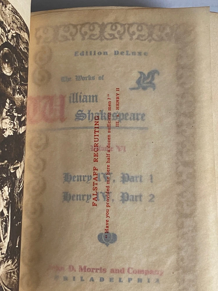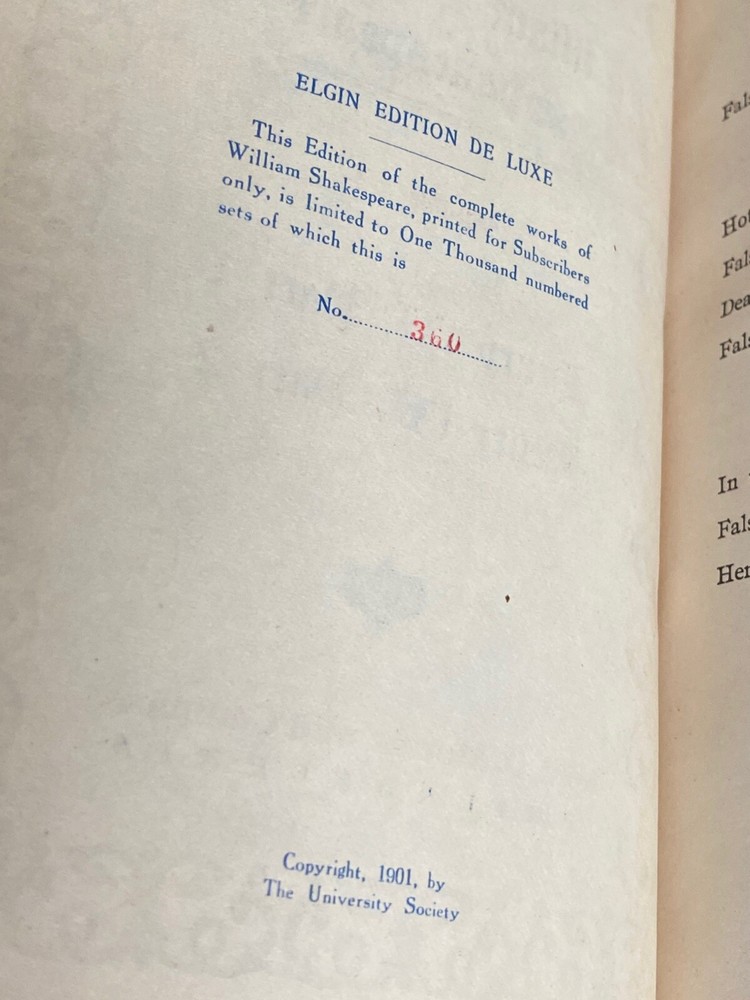 “Midsummer Night’s Dream”, “The Life of Shakespeare” is a deluxe numbered limited edition of William Shakespeare's works Vol. I. Published in 1901 by John D. Morris & Company in Philadelphia, Pa. This partially leather bound luxury edition is numbered 306 out of 1000. The book is illustrated with a tissue covered frontis and part of the rare Elgin Edition making it a valuable collectible for fans of Shakespearean literature. The Elgin Edition was sold only to subscribers. Book appears unread with a very tight binding, no writing, no missing loose or torn pages. Minor loss of gilt decoration to spine, gilt still bright. Minor chip of leather to upper & lower spine. Gilt upper page edges, uncut fore and lower page edges. Beautiful marble decorated boards. The volume is printed in English and is an original edition from the United States.