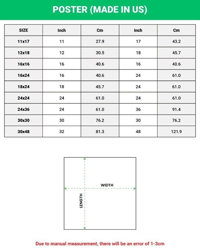 PRODUCT DETAILS Make your room more colorful and add characters to your space with this simple custom Poster. Made from high-quality paper, our posters are perfect to hang on the wall. You can easily decorate any space from a party, bedroom, bathroom, kids? room, living room, office, dorm, and more with our print-on-demand poster without a frame. High-quality resin-coated photo-base paper. Satin photo finish, maximum color gamut, dmax, and image resolution. Heavyweight (230 gsm); 9 mil base. Ships in protective tubes. Lasts 95 years inside. 5 years in direct sunlight.