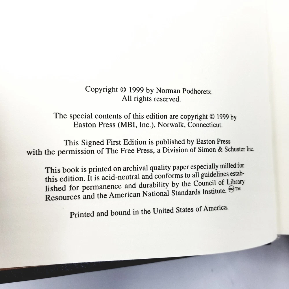 Ex-Friends by Norman Podhoretz . Easton Press, 1999. Leather-bound, limited edition, 860/1000. Signed by Podhertz on a special edition page up front. 244 pages. Gilt edges with bookmark.