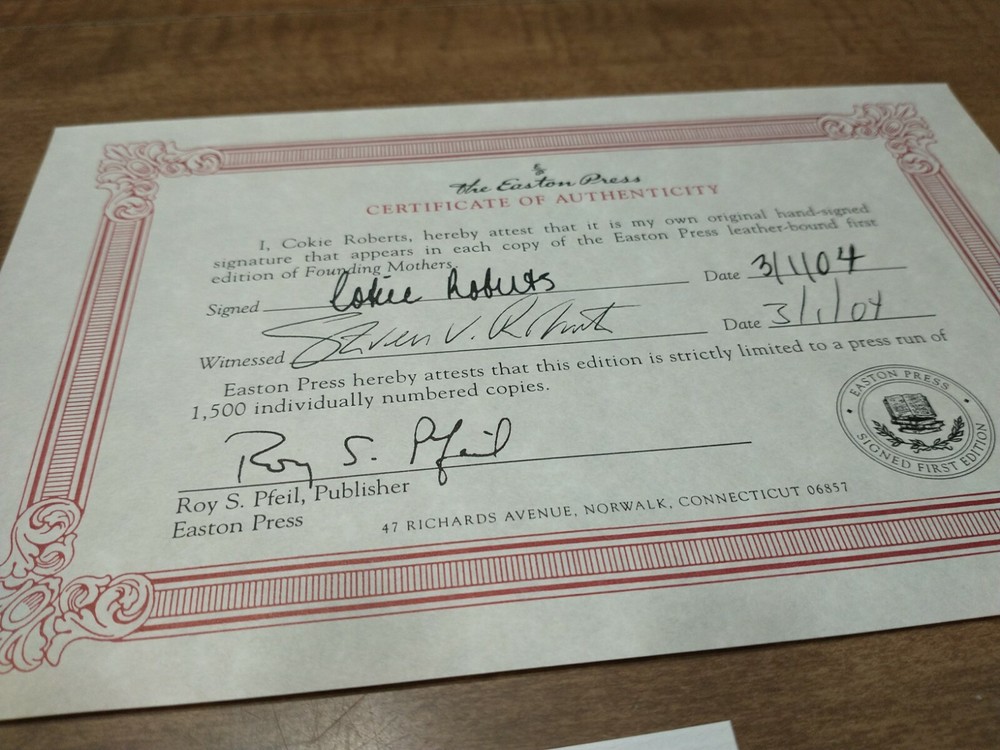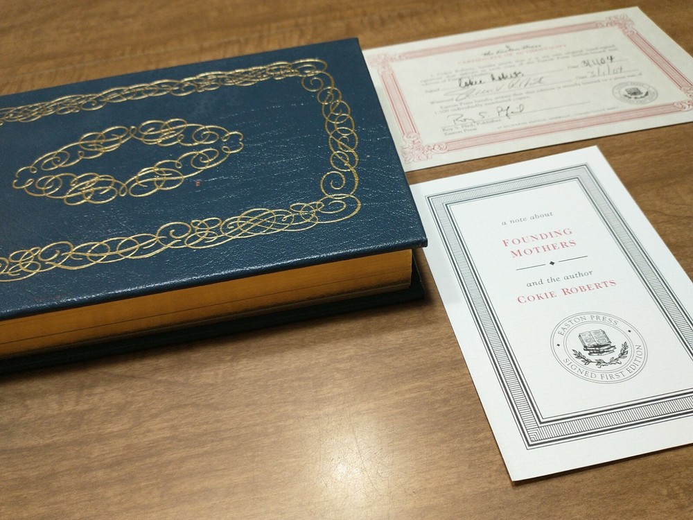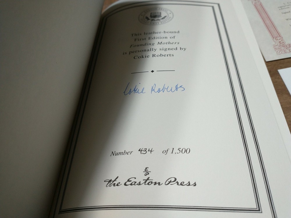 Signed Founding Mothers By Cokie Roberts Easton Press Leather Bound 1st Edition. Number 434 of a limited press run a 1500 individually numbered copies. Pristine condition from a smoke-free home. Ships in a secure box for protection.