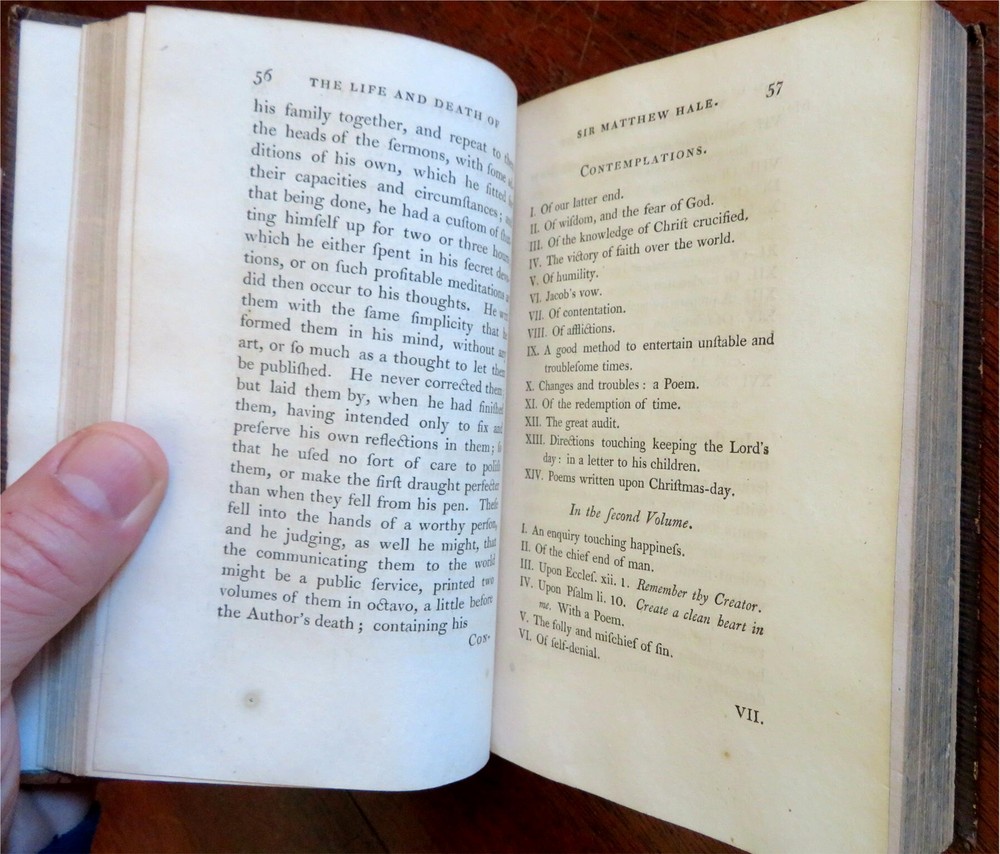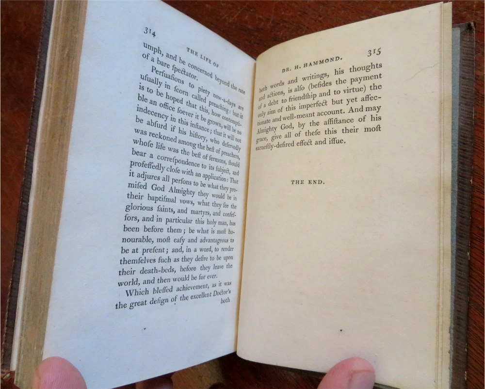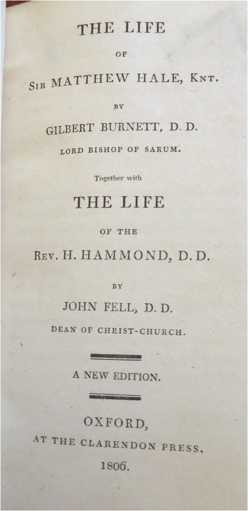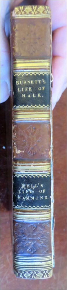 Sir Walter Hale & Rev. Henry Hammond 1806 British Biographies leather book Sir Walter Hale & Rev. Henry Hammond 1806 British Biographies leather book (Old Books, 19th Century Books, Leather Books, British Civil War History, Biographies, Sir Walter Hale, Reverend Henry Hammond). The Life of Sir Walter Hale, Knt. By Robert Burnett & The Life of the Rev. H. Hammond, D.D. by John Fell. Published 1806, Oxford by the Clarendon Press. 315 pages. Text in English. Attractive antiquarian full leather binding, slightly raised & gilt bands, gilt title lettering on contrast black leather labels, embossed compartment decoration, embossed & gilt ruled covers, marbled edges. Book is physically old and shows some signs of handling and time. Binding gently age worn but still appealing, leather slightly rubbed but still supple, joints cracked, front joint split, cover still attached firmly , remains overall very attractive as an object. Text block paper is gently age toned as typical, internally book remains mostly clean, tight and sound. An antiquarian book which does not look like new. Still attractive on the shelf. Book displays a pleasing and unique age patina and is in rather nice antiquarian condition, any age flaws seem easy to overlook or forgive. Please review photos for more detailed attempt to present this book as it survives. We often over-describe any flaws that many sellers would not even bother to mention since most people would overlook them as minor and unworthy of comment. Many people tell us the books they receive from us are nicer in person than it appears on the screen. We want you to be clear about what you are buying, so we take clear photos and try to describe it clearly. Book Measures c. 6 1/2" H x 4 1/4" W. [B4123].