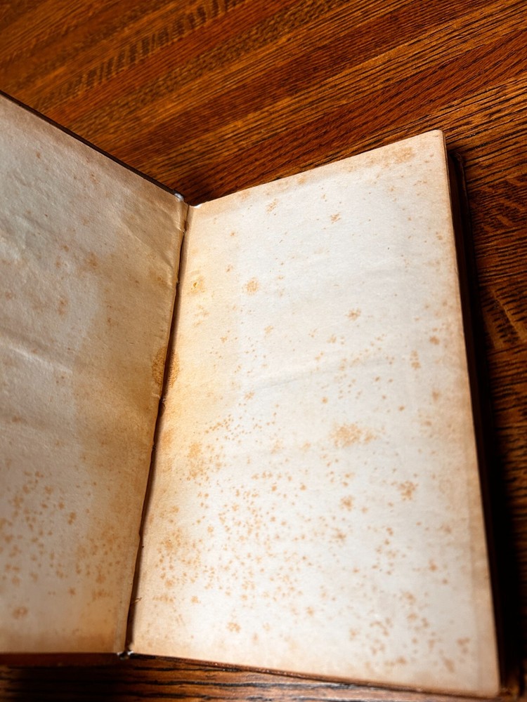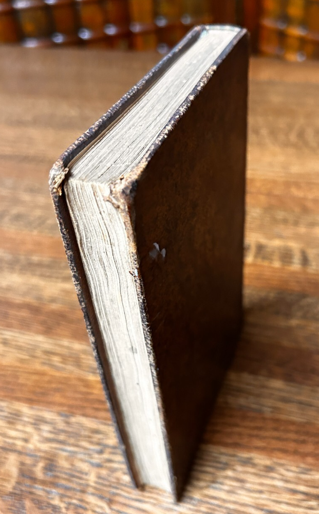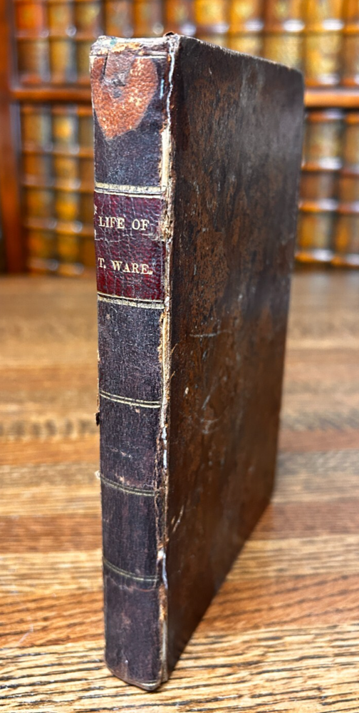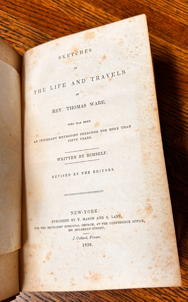 Sketches of the Life and Travels of Rev Thomas Ware; Mason & Lane 1839 Leather Good: Previous owner name in pencil in rear, erased but faint. Text is Unmarked. Rubbing to extremities, corners, cover, fold lines. Chip missing from spine, at head (pictured). Fold line has some cracking to the leather, hinge holding. Leather starting to deteriorate at extremities and fold line. Age toned (tanning, larger age spots as pictured). General handling and use wear.