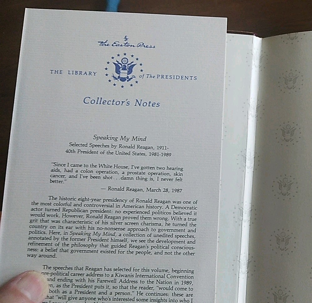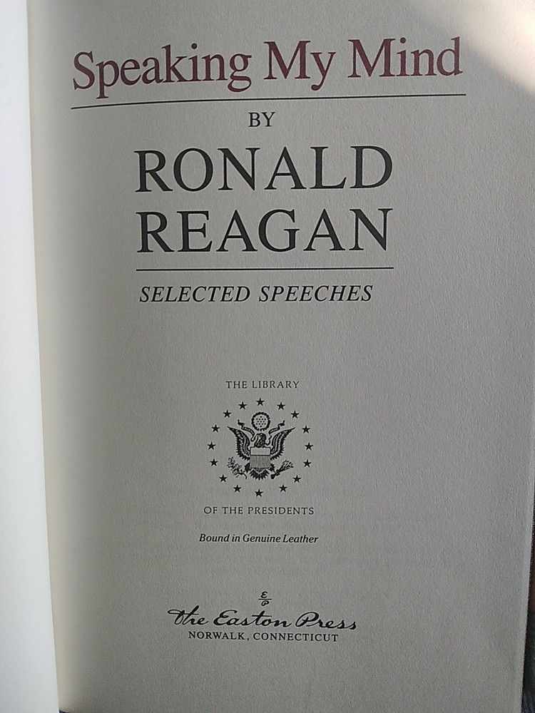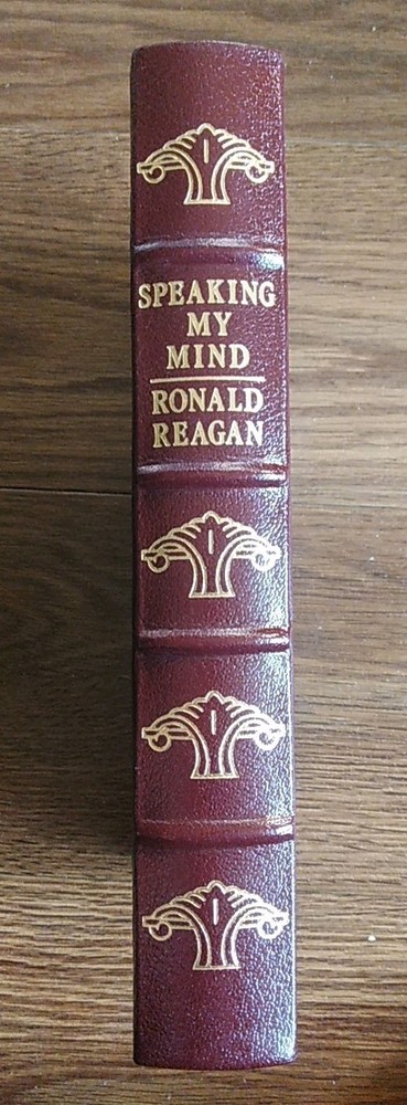 "Speaking My Mind" by Ronald Reagan is a luxurious leather-bound edition published by Easton Press in Norwalk, Connecticut. This limited edition collector's item features original content in English, reflecting Reagan's thoughts on politics and his time in office. This exquisite piece makes for a valuable addition to any political or Reagan enthusiast's collection, showcasing his speeches and insights in a timeless and elegant format. New. A treasure!