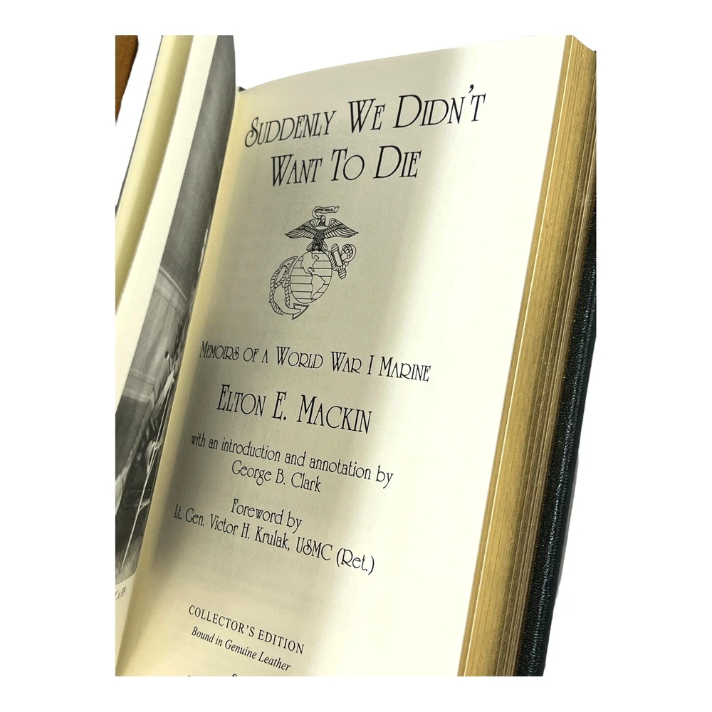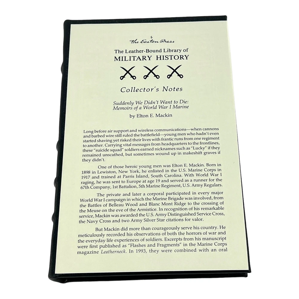 Suddenly We Didnt Want to Die Memoirs of a WWI Marine Easton Press Mackin 2015 Very Good Preowned Condition. Please see all photos. Book has never been read. Slight imperfections in the gold on the page ends. Shipped USPS Media Mail with Tracking. I ship fast. Thanks for looking.