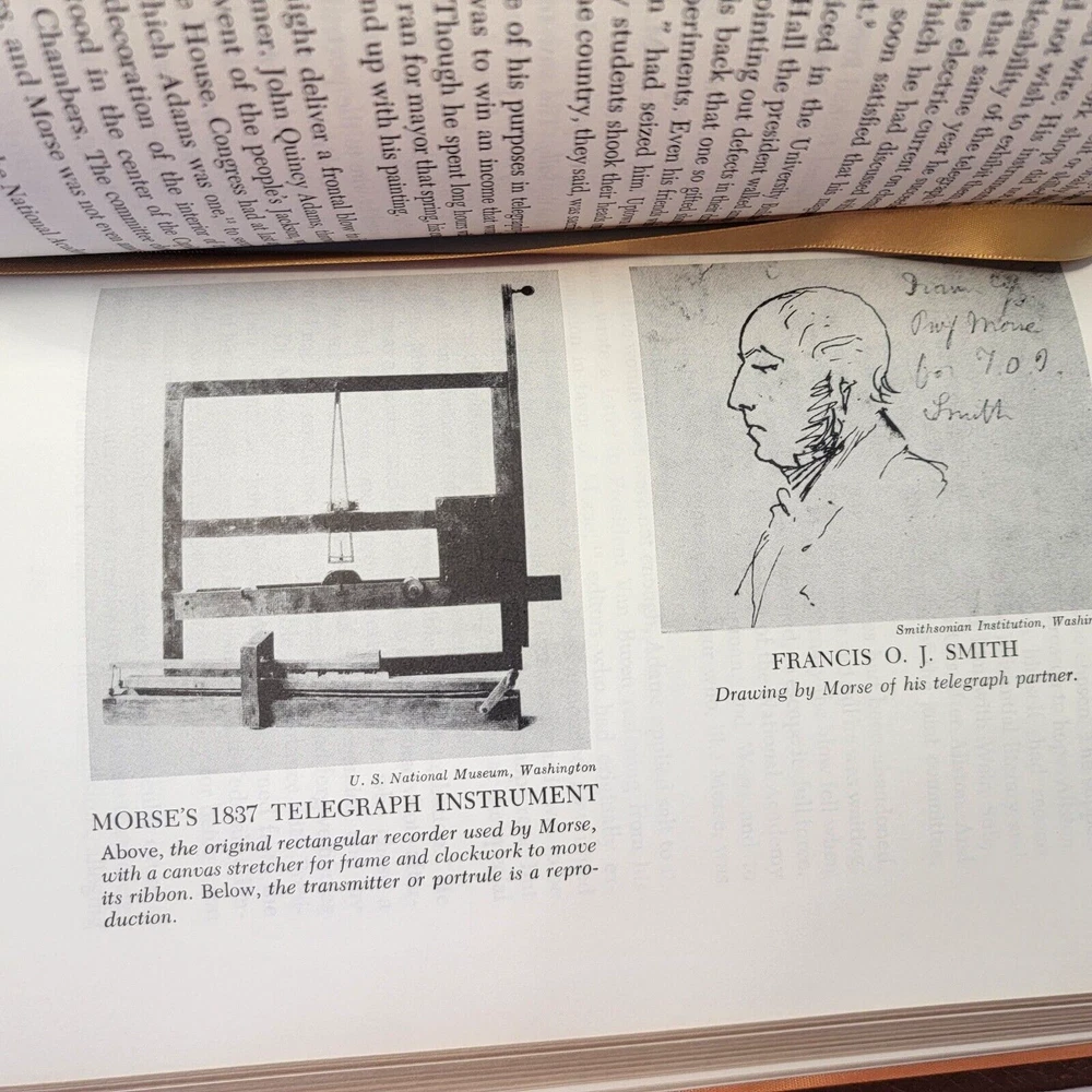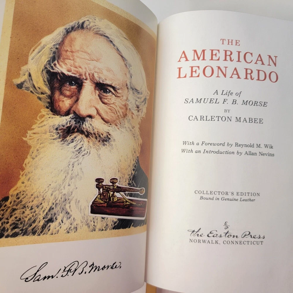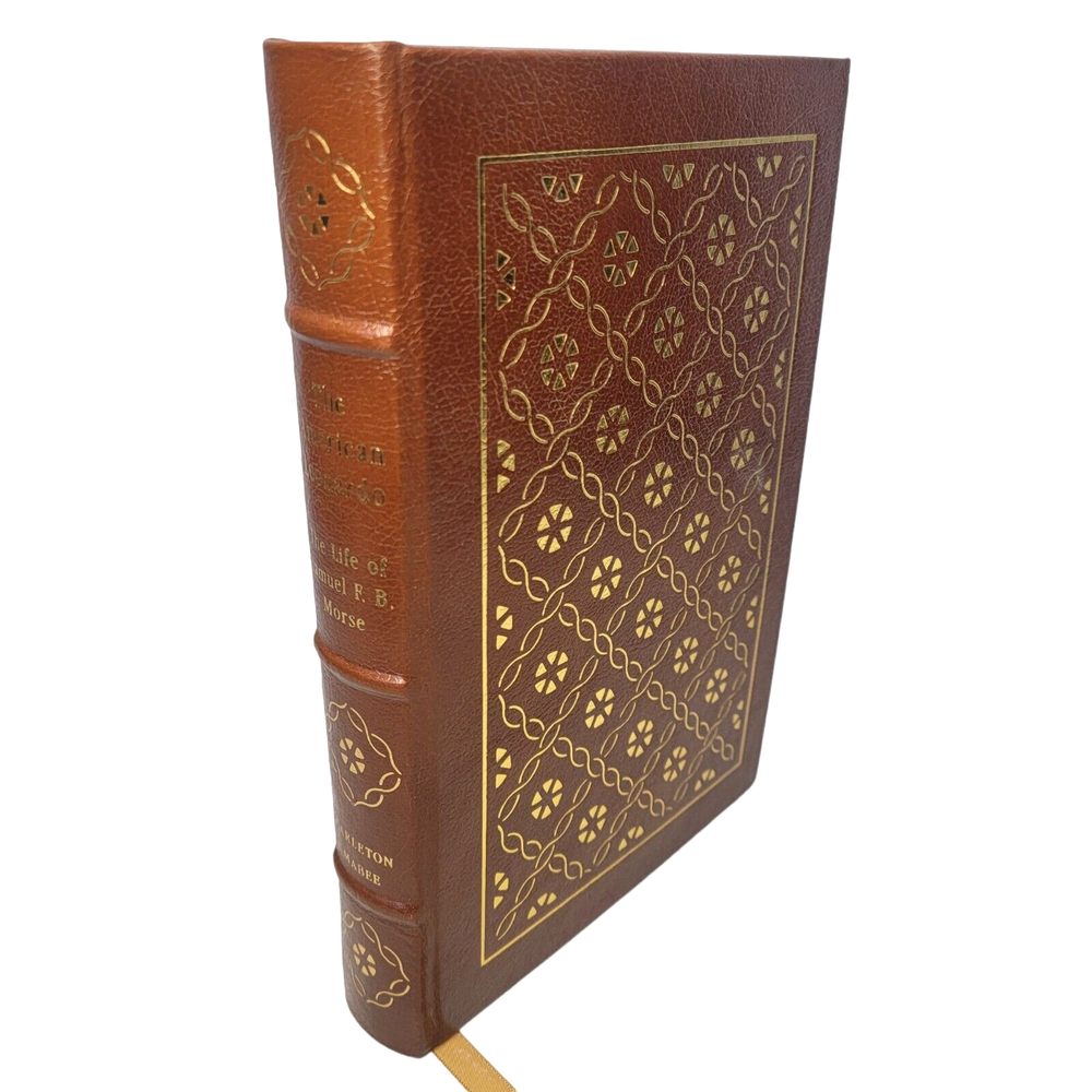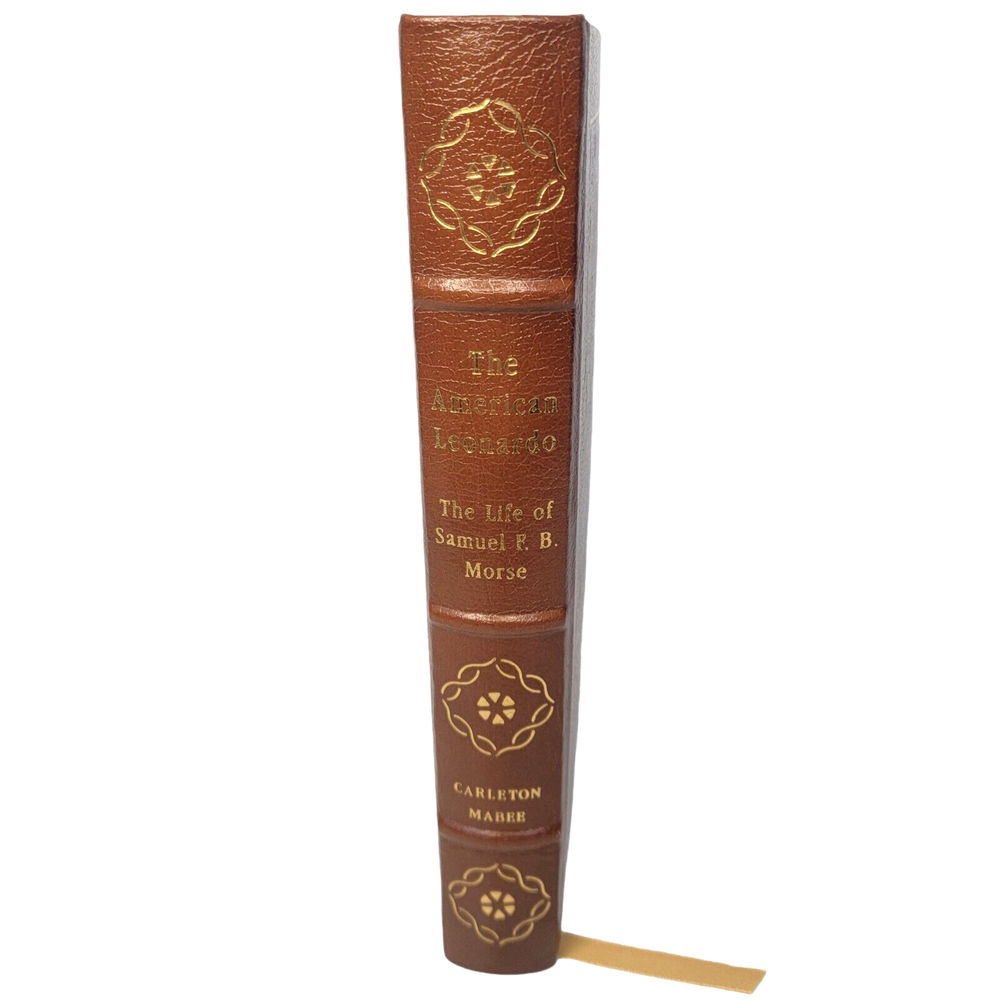 American Leonardo: A Life of Samuel F. B. Morse by Carleton Mabee With a Foreword by Reynold M. Wik introduction by Allan Nevins Easton Press Collector's Edition from the Library of Great Lives Gorgeous leather binding with raised bands on the spine, gold gilt page edges, silk end papers and a sewn-in satin ribbon Easton Press, 1990. Minimal shelf wear. Appears unread. Unattached, blank Easton bookplate laid in front cover. Gorgeous brown leather binding with gold gilt illustration on covers, gold gilt page edges, silk end-papers and a sewn-in satin ribbon. Interior pages are clean, bright and tight. A stunning copy.
