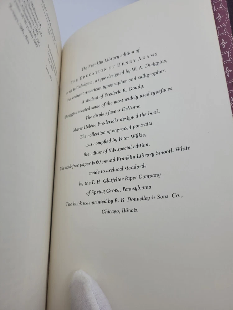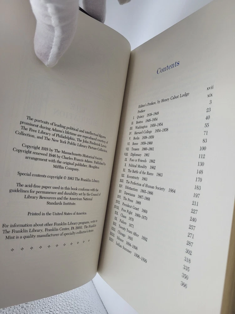 For your consideration: 1983 Franklin Library Hardcover Leatherette edition of THE EDUCATION OF HENRY ADAMS by Henry Adams with portraits of leading figures of the day. This book is in beautiful condition with tight binding and appears completely unread. Be sure to check out our other listings this week for a number of Franklin Library volumes in amazing condition. We offer combined shipping with USPS Media Mail. ENJOY! The Franklin Library was a division of The Franklin Mint that produced fine collector edition leather bound books over three decades ending in the year 2000. For this reason all Franklin Library editions are now considered "out of print" and are no longer available for sale from the Franklin Mint. All Franklin Library Editions exhibit: • High quality paper. • Pages that are sewn not glued into the binding. • Gold gilded page edges on all three sides. • Raised spine bands that give each book that distinctive antique look. Pulitzer Prize Winner, 1919 The Education of Henry Adams by Henry Adams is a seminal work in American literature, providing an insightful and thought-provoking exploration of the themes of identity, progress, and the role of education in modern life. Written in 1907, the book is an autobiographical narrative of Adams’ life and his findings as he grapples with the challenges of the rapidly changing modern world. Adams’ autobiography is remarkable for its frankness and self-reflection, as he reflects on his upbringing, his marriage, and his career as a professor and historian. He also confronts the challenges of his own identity and what it means to be an “American” in a changing world. In the book, Adams posits that education is the key to understanding the modern world, and this exploration of his own educational journey leads to an incredible amount of insight and understanding. Adams’ writing is both insightful and engaging, making The Education of Henry Adams an essential read for anyone interested in the themes of identity, progress, and education. Not published for the general public until after Adams's death in 1918, The Education of Henry Adams is considered to be one of the finest -- and by many, to be the finest -- autobiographical memoirs ever written in the English language, displaying dazzling insights not just into the mind of a remarkable man but a broad understanding of the changes in the world around him. Henry Adams (1838-1918) was an American historian and author, noted for his brilliant and award-winning works. Born in 1838, he was a descendant of two prominent American families, the Adams and the Lees. He was raised in Quincy, Massachusetts and graduated from Harvard University in 1858. He was a professor of medieval history at Harvard for a number of years and wrote several articles and books on the subject. Adams was best known for his book, The Education of Henry Adams , which won the Pulitzer Prize in 1919. This book was an autobiographical reflection on Adams’ life, beginning with his childhood and continuing up to the end of the 19th century. He also wrote other works, such as Mont Saint-Michel and Chartres , which focused on the history of France. Adams was a prominent social figure in Washington D.C. and was a friend of several presidents, including Theodore Roosevelt and William McKinley. He was also a member of the Harvard Board of Overseers and the Massachusetts Historical Society. In addition to his work as an historian, Adams was also a successful businessman. He invested in numerous businesses, such as railroads, land real estate, utilities, and insurance companies. His investments enabled him to financially support his writing. Adams died in Washington D.C. in 1918. He left behind an impressive body of work, which earned him a Pulitzer Prize and the title of one of America's greatest historians.