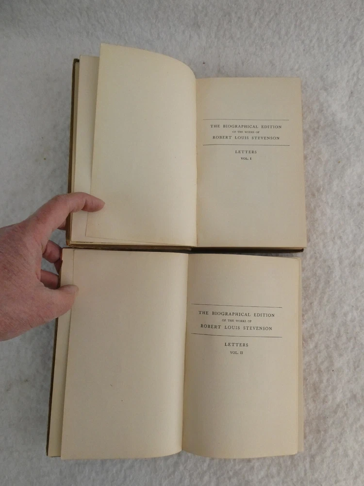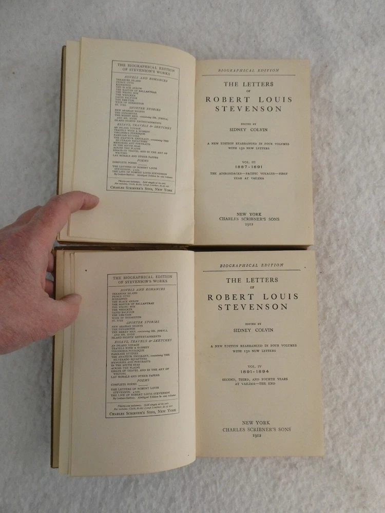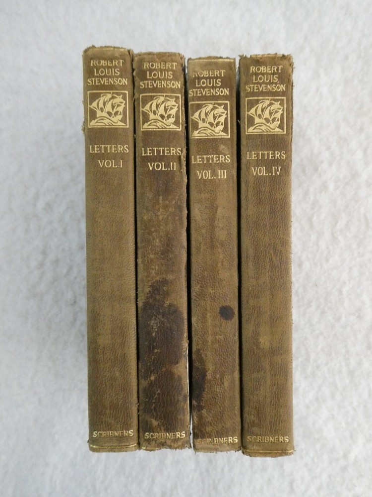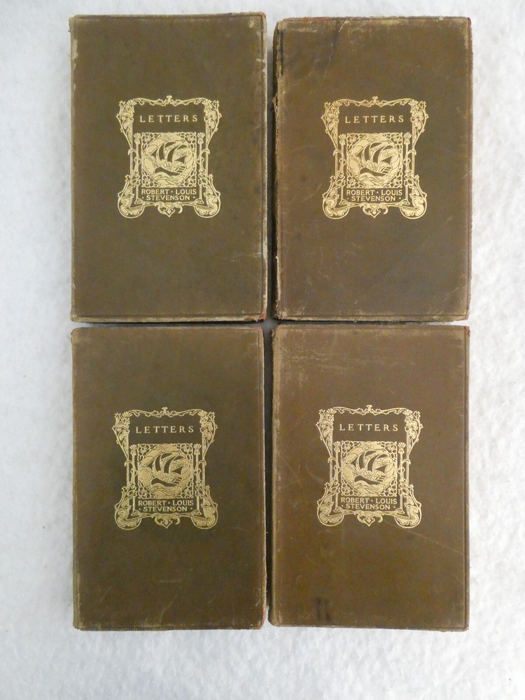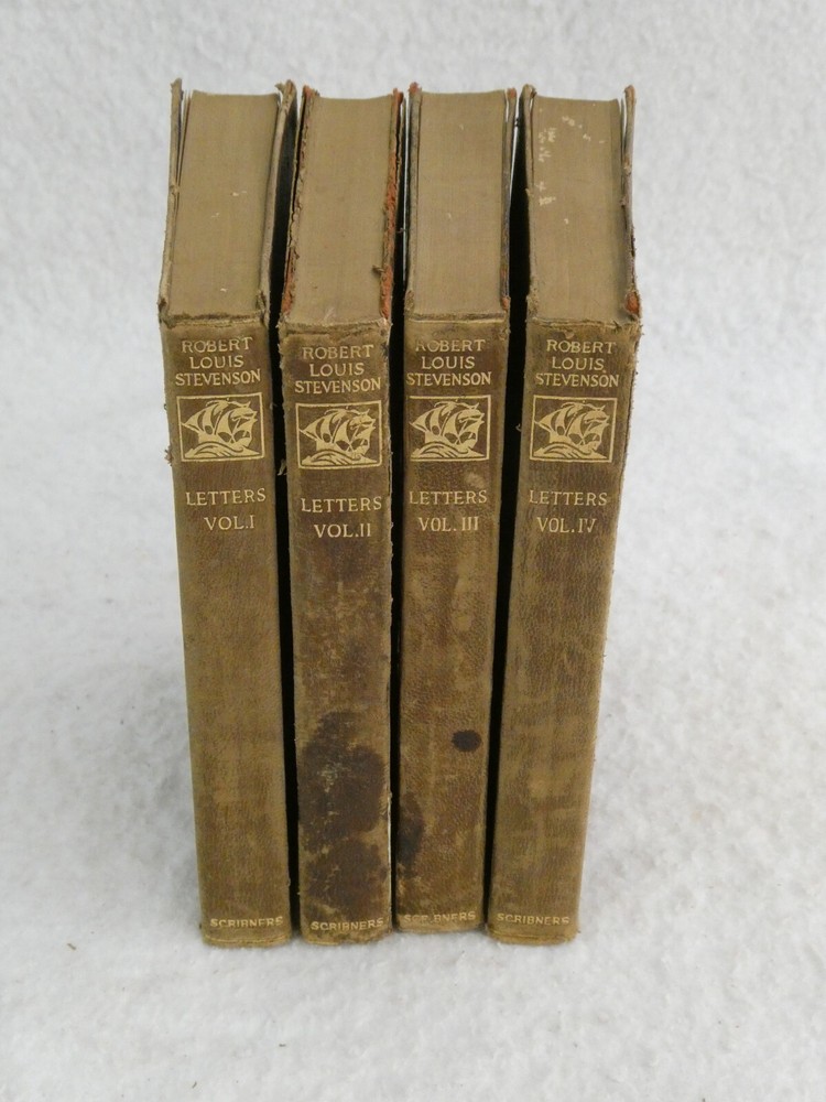 The Biographical Edition of the Works of ROBERT LOUIS STEVENSON LETTERS In Four Volumes New York: Charles Scribner's Sons, 1912 Four Leather Volumes in Good Condition. Spines are faded and stained. Leather is edgeworn. Front free endpaper of VOLUME II has been pasted to the front pastedown. Please examine photos for details. Condition: We strive to describe and photograph the condition of every item as accurately as possible. Photos are of the actual item that is being sold. Please examine the photos carefully for any condition details and possible flaws. Best Offers: We consider all offers in relation to current market values. We try to respond almost immediately to most offers. Most of our counteroffers are firm but we are open to bargaining. Shipping: We combine shipping. When ordering multiple items from us please request a total before paying. We charge postage based on weight plus $1 for each eBay listing. All of our orders are packed carefully to prevent damage during shipment. We ship most of our items within 24 hours. Contact Us: We are available 7 days a week and are happy to answer any questions you may have.