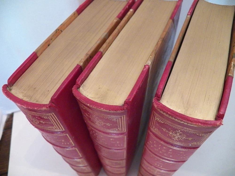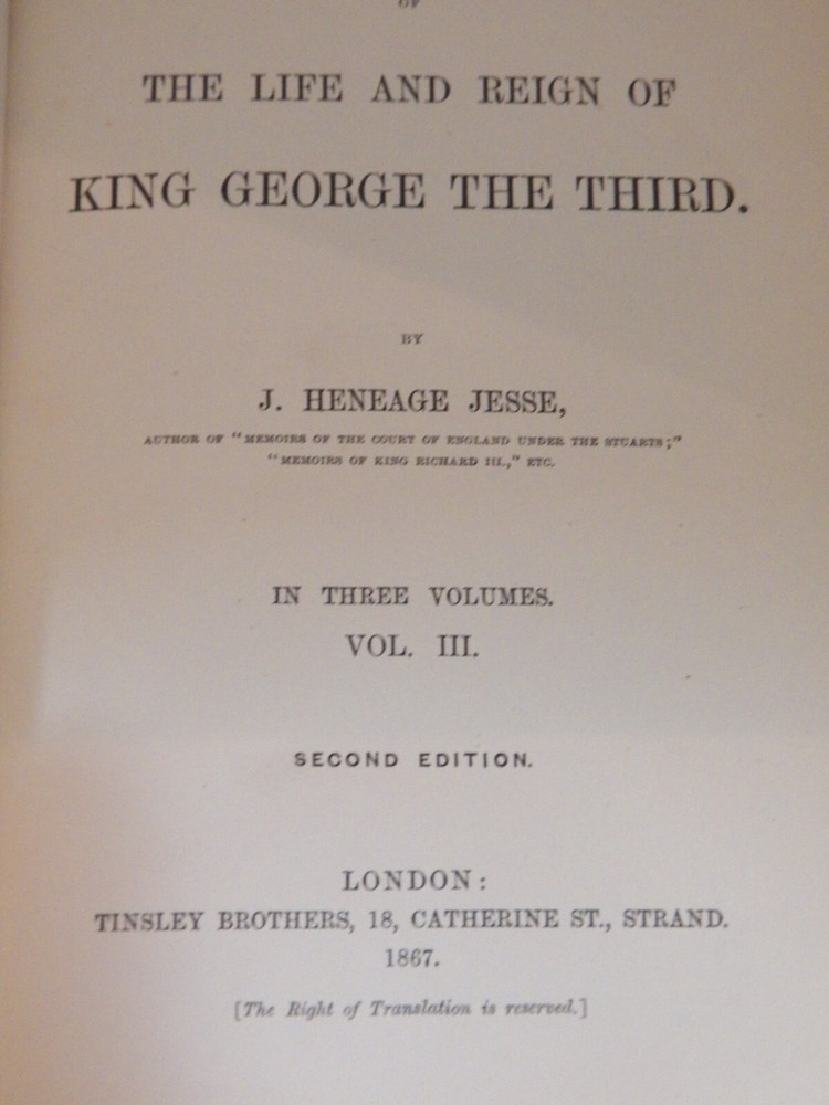 LIFE AND REIGN OF KING GEORGE THE THIRD, 3 VOLUMES IN 1/4 RED LEATHER AND CORNERS BY J. HENEAGE JESSE, 2ND EDITION. THESE ARE IN NICE CONDITION FOR THEIR AGE, JUST A FEW RUBS AND BUMPS ON THE LEATHER EDGES. THERE IS A PERSONALIZED BOOK PLATE INSIDE VOLUME I Dimensions: 9" X 6" Please email early with questions.