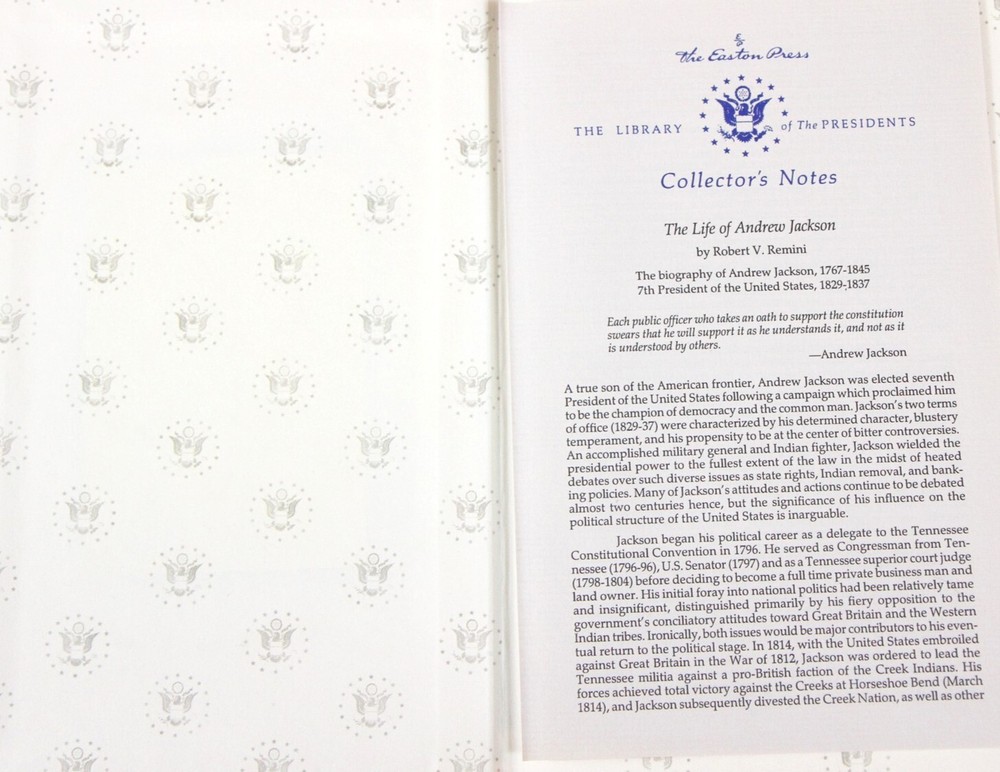 ***Copy of photos, personal formats, graphics, or text is prohibited . Ebay may drop listings with infractions. I review content regularly. Library of the Presidents The Life of Andrew Jackson Author: Robert Remini Illustrations by Description: From Regal Books - The now long discontinued (spring 2016) Leather Bound Library of the Presidents is far more than just a stodgy list of biographies of people you don't know. I was struck as I filed through most of these titles preparing them for photograph and sale. They are on the surface a cannon of very successful people. But look further, this is an incredible library of American History. It is America as we influence the world and as the world influenced us. On a micro scale, it is a slice of local life when these individuals were everyday persons growing up anywhere from log cabins to families of wealth. From the back woods, to rural America, or America's emerging metropolises. It is a taste of an era. This series is sometimes overlooked simply because people are not biography readers. However, I was amazed at how much is here beyond just biography. If you have any inkling you want to collect this series, you need to get started now while most prices are still reasonable. Condition : Leather is bright with only little sign of shelf wear. Light marr to gilt page ends with just a few marks. There is just a hint of an outline where I have carefully and cleanly removed a former owner bookplate(left side of photo 5). There are no scuffs, rips or tackiness that remains. Had I not mentioned it, you likely would not been able to tell, and soon forgotten. So light it hardly shows in photos. Editor's notes are included! This Fine Leather Book Features: Top grade, gold embossed/ornamented leather Gilded page ends to protect against dust and moisture Decorative end papers Acid neutral archival paper to last generations