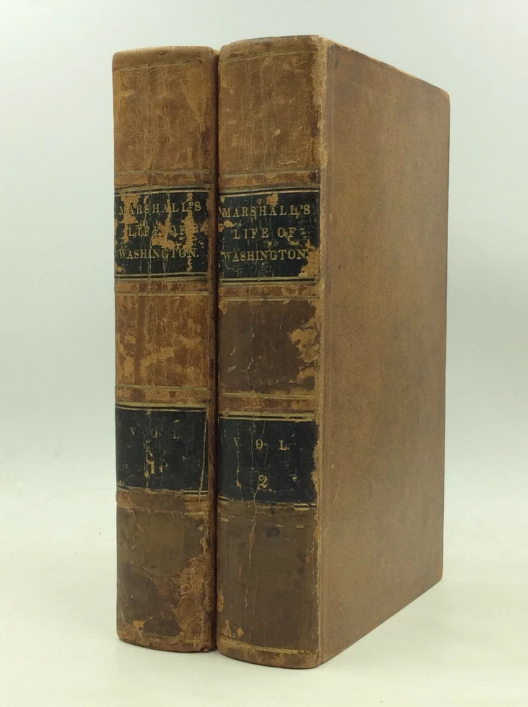 John Marshall THE LIFE OF GEORGE WASHINGTON Philadelphia: James Crissy, 1832. Second Edition. Leather bound. Marshall's classic biography of Washington in the revised and abridged second edition. This set contains the two text volumes but lacks the scarce atlas volume. Bound in full 19th century leather, lacking the spine labels. Scattered foxing throughout. Spines mildly rubbed and chafed. A set of hardcover books in good condition. Item #1245973 A famous history of the first president, written by the famed Supreme Court Chief Justice. The volumes are housed in a simple cardboard box made by a former owner.