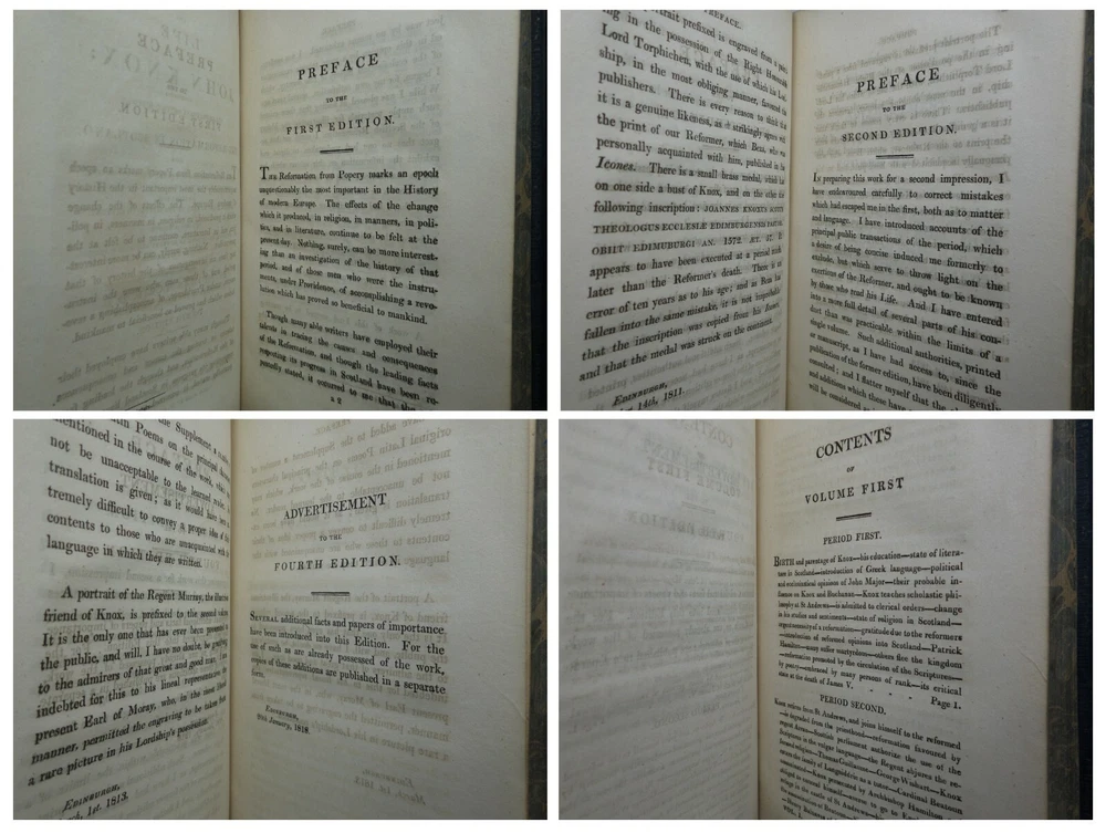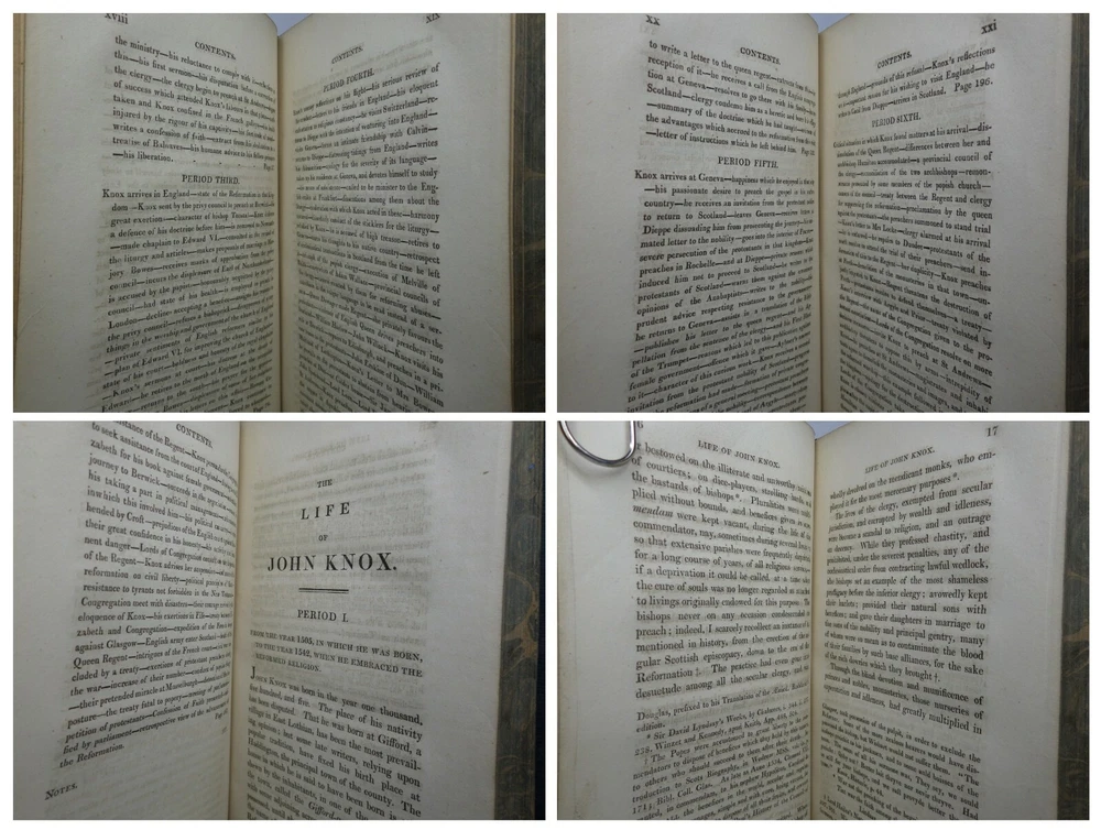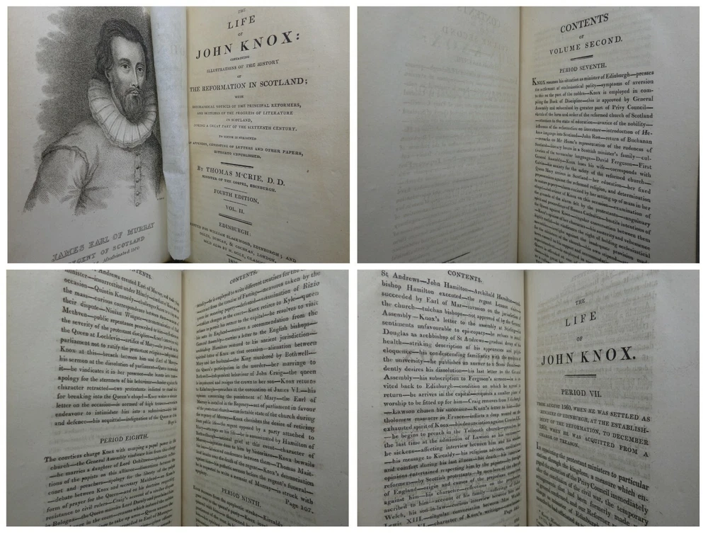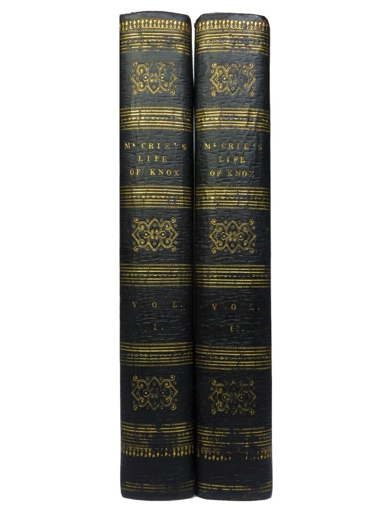 [M'CRIE, Thomas (1772-1835)]. The Life of John Knox: Containing Illustrations of the History of the Reformation in Scotland; with Biographical Notices of the Principal Reformers, and Sketches of the Progress of Literature in Scotland, During a Great Part of the Sixteenth Century. To which is Subjoined an Appendix, Consisting of Letters and others Papers, Hitherto Unpublished. Edinburgh: Printed for William Blackwood, 1818. FOURTH EDITION. Leather-bound; hardcover; octavo (220 x 130 mm); pp. [xxii], 451; [vi], 496. English text. Beautifully bound in contemporary full straight grain morocco; smooth spines gilt; gilt ruled frames to boards; marbled pages edges and endpapers; portrait frontispieces with tissue guard; volume 1 depicting John Knox, engraved by J. Beugo from a picture loaned by Lord Torphenchin, volume 2 engraved by R.Scott; footnotes throughout; volume 1 with notes to rear; volume 2 with notes, appendix, supplement, and index to rear. Printed by Caw & Elder. Provenance: bookplate of Mr. John Tawse [Advocate] to front pastedown. Condition: VERY GOOD. Collated complete. Bindings tight and secure, the hinges intact. Slight rubbing to extremities, particularly the points. Gilt a little rubbed in places. Contents nicely preserved, a little offsetting here and there. Signature and date neatly inked to fep in both volumes. A scarce set. International tracked shipping, dispatched promptly and securely. Please view my other rare books.