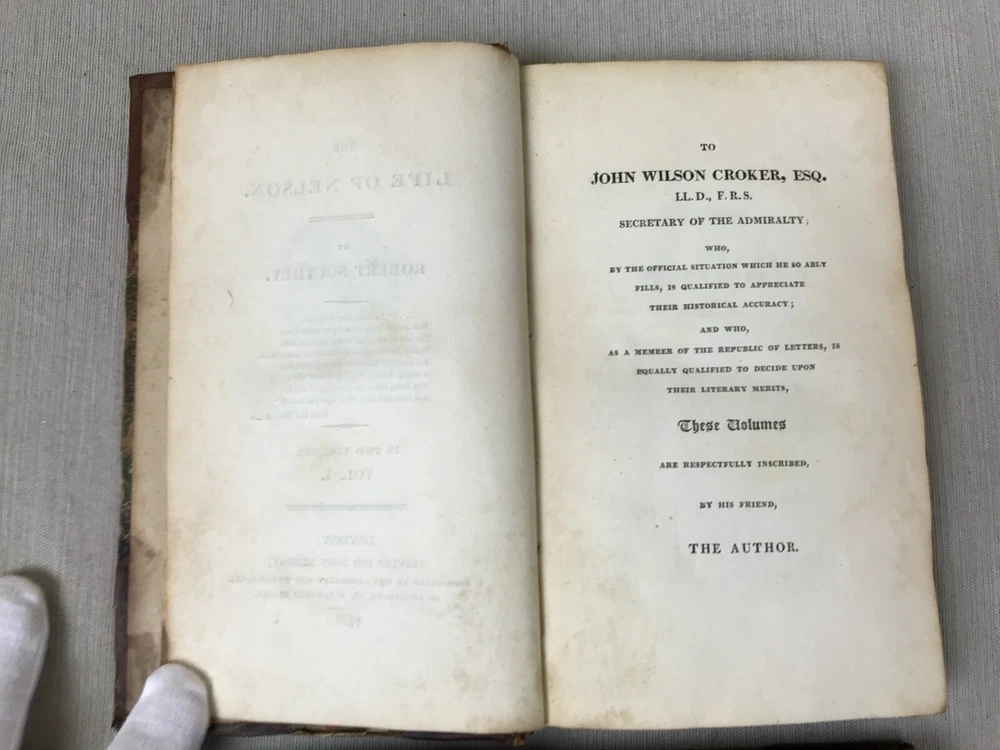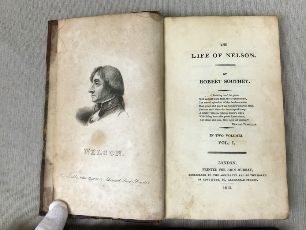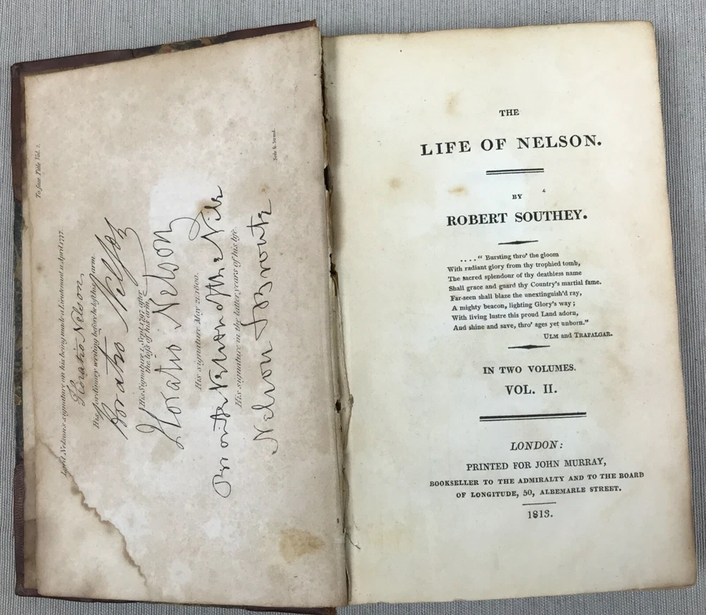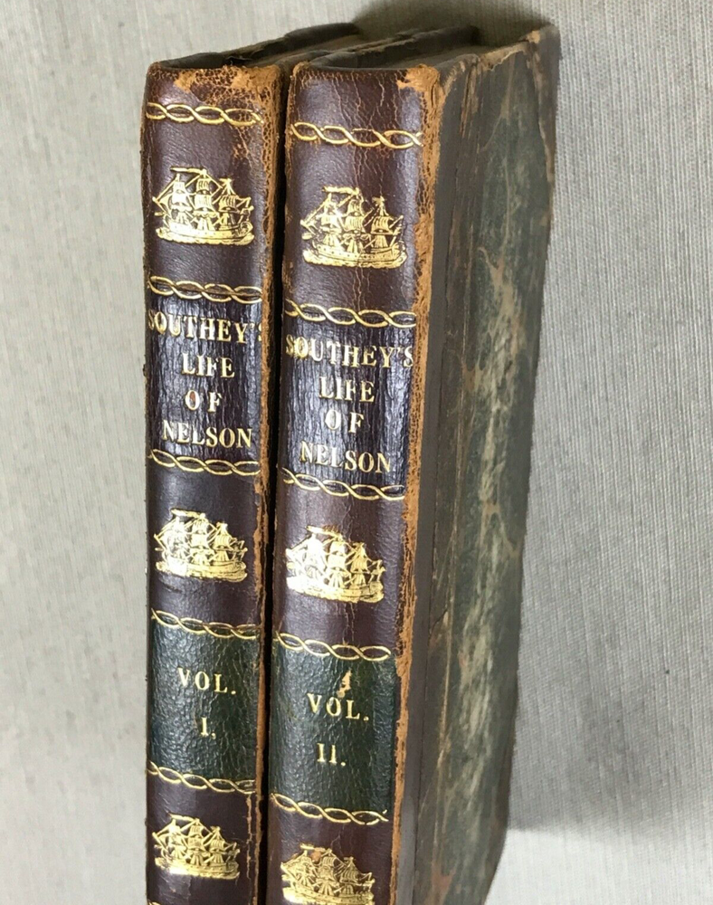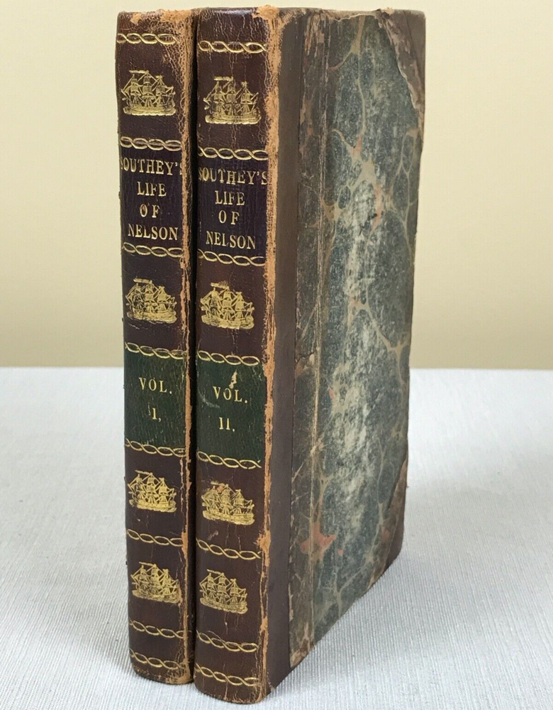 The Life of Nelson by Robert Southey, In Two Volumes. Printed in London for John Murray in 1813. Horatio Lord Nelson (1758-1805) was the first Duke of Bronte. He served in the Royal Navy bringing naval victories during the French Revolutionary and Napoleonic Wars. He is widely regarded as one of the greatest naval commanders in history. This set has gold ships printed on the spine - very fitting for his admiralty. Leather binding on the spine and corners. A beautiful set to display. Bookplates on inside covers for George D'Oyly, D.D. D'Oyly was an English cleric and academic theologian and biographer. In 1813, when this Life of Nelson set was published, D'Oyly was appointed domestic chaplain to Charles Manners-Sutton, the Archbishop of Canterbury. In 1815, he was elected a Fellow of the Royal Society. Printed in London for John Murray, Bookseller to the Admiralty and to the Board of Longitude, 50, Albermarle Street, 1813 (J. Moyes, Printer). I am providing high resolution photos for you to judge condition yourself, but if you need additional photos or have any questions, do not assume -- please contact me before purchasing. QUALITY SHIPPING! Shipped out no later than the next business day.