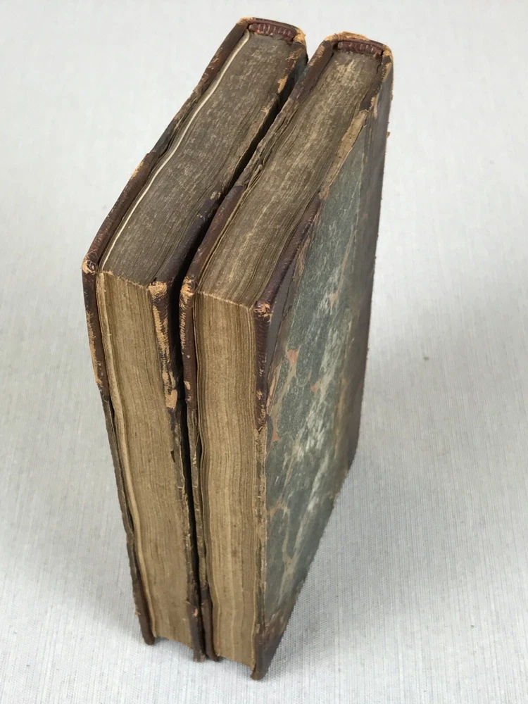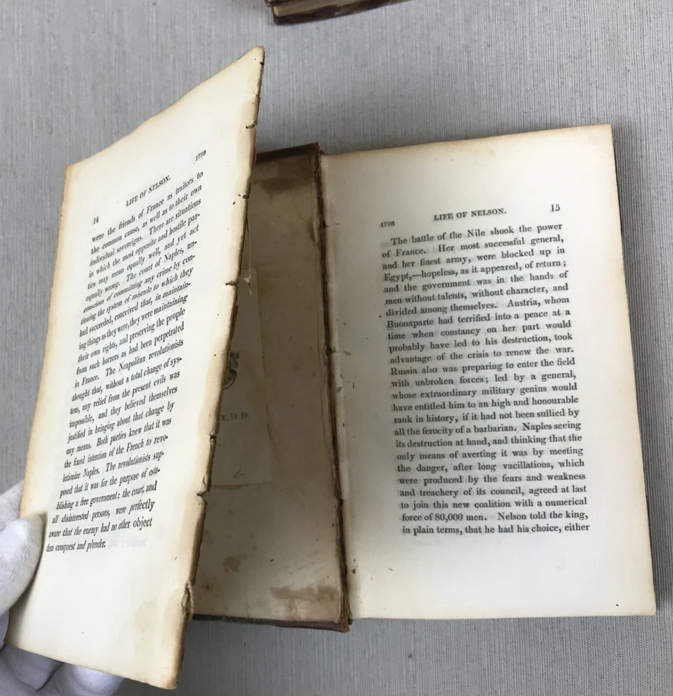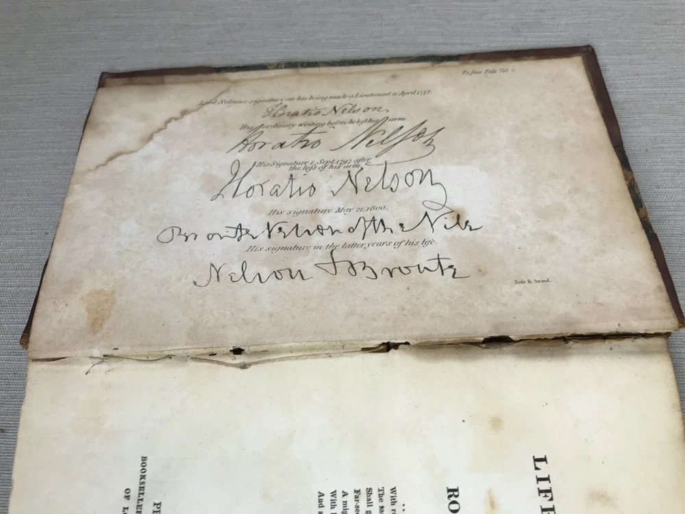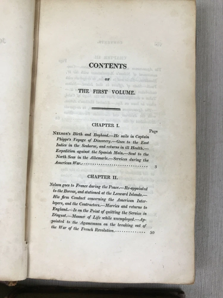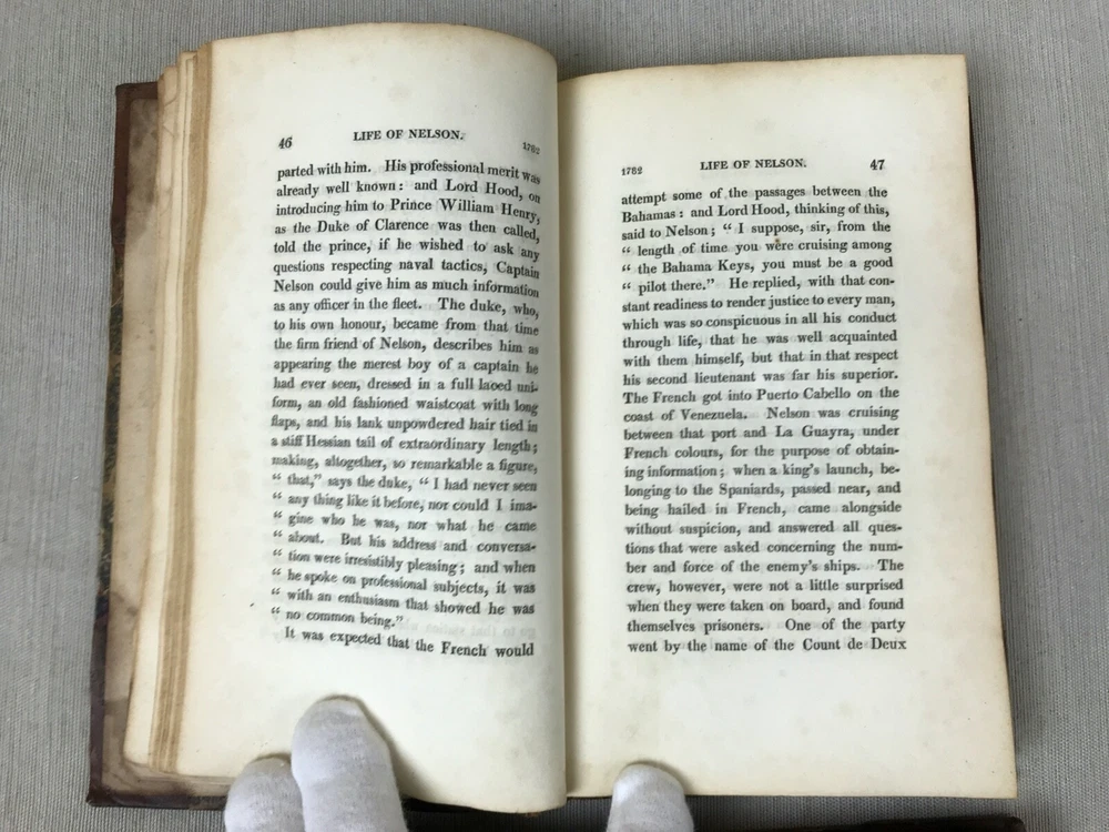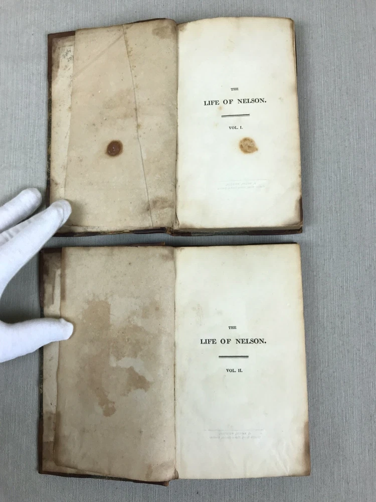 The Life of Nelson by Robert Southey, In Two Volumes. Printed in London for John Murray in 1813. Horatio Lord Nelson (1758-1805) was the first Duke of Bronte. He served in the Royal Navy bringing naval victories during the French Revolutionary and Napoleonic Wars. He is widely regarded as one of the greatest naval commanders in history. This set has gold ships printed on the spine - very fitting for his admiralty. Leather binding on the spine and corners. A beautiful set to display. Bookplates on inside covers for George D'Oyly, D.D. D'Oyly was an English cleric and academic theologian and biographer. In 1813, when this Life of Nelson set was published, D'Oyly was appointed domestic chaplain to Charles Manners-Sutton, the Archbishop of Canterbury. In 1815, he was elected a Fellow of the Royal Society. Printed in London for John Murray, Bookseller to the Admiralty and to the Board of Longitude, 50, Albermarle Street, 1813 (J. Moyes, Printer). I am providing high resolution photos for you to judge condition yourself, but if you need additional photos or have any questions, do not assume -- please contact me before purchasing. QUALITY SHIPPING! Shipped out no later than the next business day.