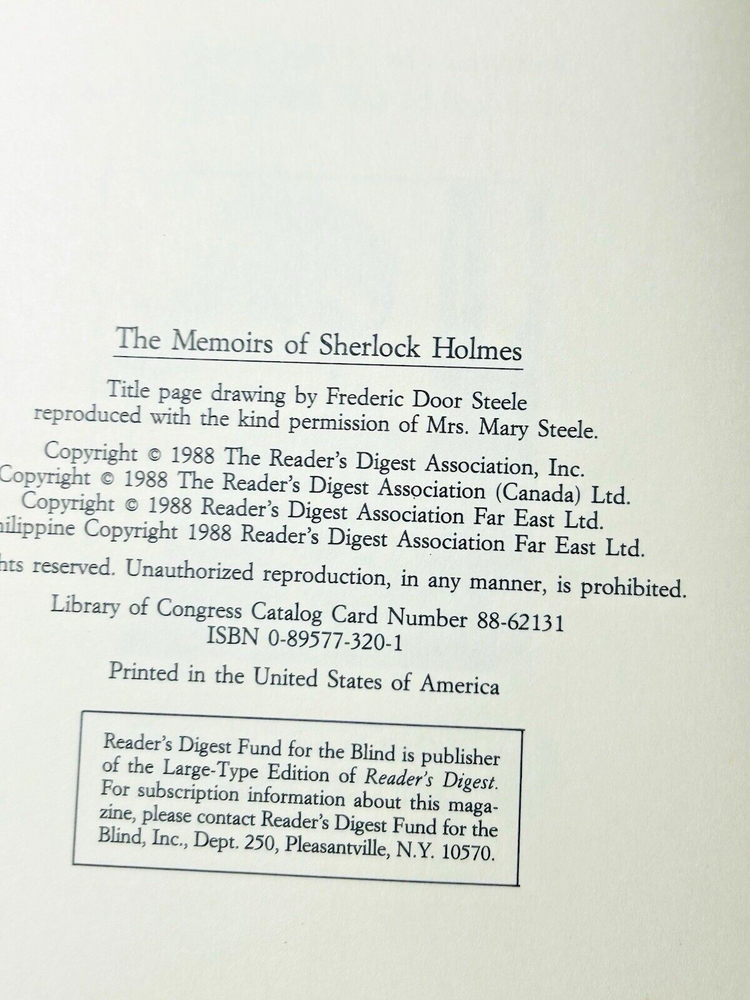 This vintage Readers Digest edition of *The Memoirs of Sherlock Holmes* is a must-have for any collector! The leather-bound hardcover is in pristine condition, making it a beautiful addition to any bookshelf. Inside, you’ll find eleven thrilling short stories packed with mystery, intrigue, and Holmes’ brilliant deductions. From family secrets to high-stakes crimes, each tale is a masterclass in detective fiction. A timeless classic that feels luxurious in your hands—highly recommended for fans of Doyle’s legendary sleuth!