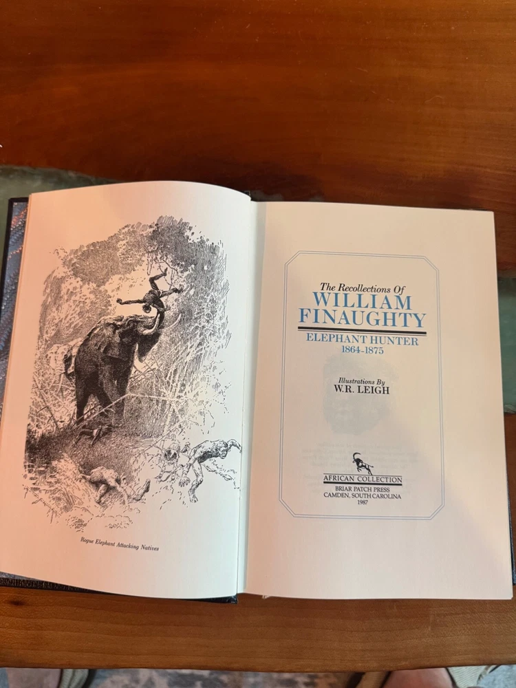 The Recollections of William Finaughty, Elephant Hunter 1864–1875 – Deluxe Leather-Bound Edition This is the highly collectible Briar Patch Press leather-bound edition (1990) of The Recollections of William Finaughty, Elephant Hunter 1864–1875, a foundational classic in African big game hunting literature. Elegantly bound in leather with gold gilt page edges, this edition is both attractive and durable-a standout addition to any Africana or sporting library. Finaughty’s memoir, first privately printed in 1916 in an edition of only 250 copies, recounts his pioneering exploits as one of Southern Africa’s earliest and most successful elephant hunters. Condition: Excellent. Features: Full leather binding, gold gilt page edges, illustrated, 242 pages. Collector’s Note: Highly sought after by collectors of African adventure and hunting classics.A beautiful and distinguished volume for any collector or enthusiast of African exploration and big game hunting. Detailed Contents Summary “The Recollections of William Finaughty, Elephant Hunter 1864–1875” is a classic memoir chronicling the remarkable career of one of Southern Africa’s earliest and most accomplished ivory hunters. Born in Grahamstown in 1843, William Finaughty began his hunting career at age 21 and, over the next decade, shot more than 500 elephants-amassing thousands of pounds of ivory and earning a reputation among contemporaries like Theodore Roosevelt, Chapman, and Lyell. The narrative, based on Finaughty’s original articles for the Rhodesian Journal and compiled by his friend George L. Harrison, provides gripping firsthand accounts of hunting expeditions through Matabeleland and the wilds north of Port Elizabeth. Finaughty describes the perils of the bush, the challenges of tracking and shooting elephants, and the evolving trade in ivory during the mid- to late-19th century. His stories are notable for their authenticity and detail, including accounts of acquiring over 5,000 pounds of ivory in a single season and encounters with the region’s wildlife and indigenous peoples. The book stands out for its historical significance, offering rare insight into the early days of professional elephant hunting in Africa and the frontier culture of the era. Originally published in a very limited private edition in 1916, it remains one of the most coveted titles in the genre. This edition is a leather-bound, gold gilt page edge copy in excellent condition-a truly distinguished and collectible volume for any Africana or big game hunting library.