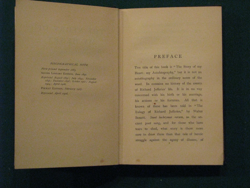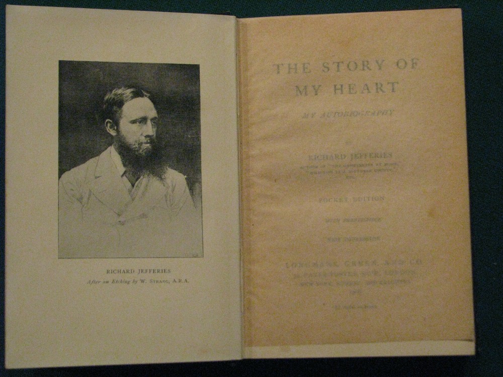 THE STORY OF MY HEART My Autobiography by Richard Jefferies 1908 Hardcover Leather Pocket Edition Hardcover is in good condition, rubbings, marks, soiling on the cover, worn cover corners and spine edges, name of the previous owner on the front end-paper, foxing on end-papers, several openings, clean text, good binding, please see photos LONGMANS, GREEN, AND CO., London, Pocket Edition, 1908, 208 pages, 1 photo of etching illustration, portrait John Richard Jefferies (6 November 1848 – 14 August 1887) was an English nature writer, noted for his depiction of English rural life in essays, books of natural history, and novels. Walter Besant wrote of his reaction on first reading Jefferies: "Why, we must have been blind all our lives; here were the most wonderful things possible going on under our very noses, but we saw them not."