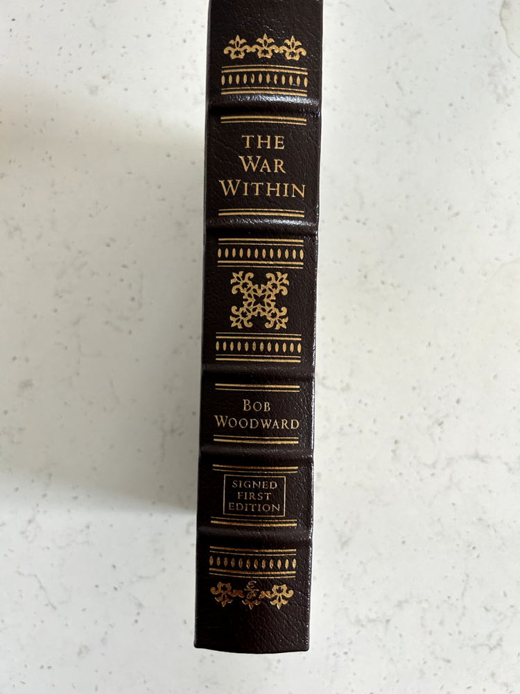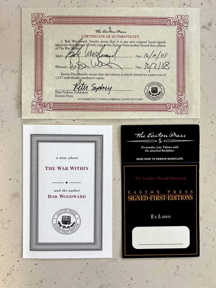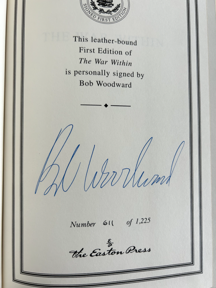 The War Within by Bob Woodward Signed leather bound 1st edition with COA, numbered 611 of 1,225 Like new - book has not been read, no bent pages Easton Press "Signed First Editions" (2008) Bound in fine genuine leather with 22K gold page edges Archival quality acid-free paper Domestic shipping only Returns accepted within 30 days