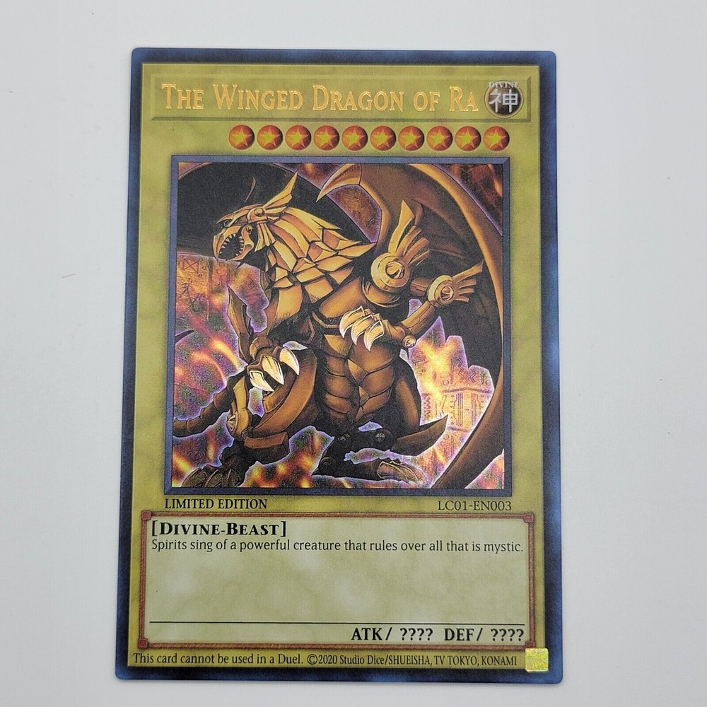 You are bidding on : 1 x Yu-Gi-Oh Legendary Collection 25th Anniversary Edition THE WINGED DRAGON OF RA (Ultra Rare - Limited Edition) LC01-EN003 All cards are in Near Mint condition unless specified Pictures are stock pictures ONLY it is not of the actual card How we identify the condition of the card: Near Mint: Most of the time cards in this condition are pack fresh but, the card may have minor flaws that are not visible with a quick inspection, small white dots or scratches that you have to closely examine the card to see. Excellent: Overall the card looks near mint but may have minor scratches, slightly worn edges that are visible but they do not interfere with the way the card looks. Lightly Played: Similar to a card in excellent condition except there is more whitening around the edges and the corners are a little more worn or slight bends or creases that are visible. There might be some slight whitening on the back or front of the card. Imperfections will be visible with a quick inspection. When the card is sleeved the imperfections will not be noticeable and the card will look just like the rest of your cards Played: There is a large amount of whitening around the edges and the corners have a good amount of damage, many scratches, bends and/or creases on the card. When the card is sleeved it can still be played Shipping and Handling : Canada Shipping is $1.50 CAD Tracking is offered for $13 CAD BUT tracking is required on any purchases that are over $50 CAD Please contact us for combined shipping if interested in purchasing multiple cards before paying USA Shipping is $1.99 CAD Regular Mail for all orders under $19.99 Shipping is $7.99 CAD with USPS tracking for all orders $19.99 and over Please contact us for combined shipping if interested in purchasing multiple cards before paying INTERNATIONAL Shipping is $4.99 CAD with regular mail Tracking is offered for $29.99 CAD BUT tracking is required for purchases over $50 CAD Please contact us for combined shipping if interested in purchasing multiple cards before you pay Combined shipping: We offer combined shipping: each and every additional item after the first one is only $0.25 (25 cents). To obtain combined shipping fees, please use the shopping cart or ask for the combined shipping invoice BEFORE you pay. If you pay item-by-item, right away after the purchase, we will not be able to offer you combined shipping anymore. Handling Your order will be shipped 1-3 business days after payment has been received *“Business days” are normal weekdays. Saturdays, Sundays, and major holidays do not count as business days. Cards purchased are packaged and shipped in a sleeve, toploaders, a team bag and an envelope to ensure protection of cards Payment : Payments should be made within 5 days after purchase Epic Cards and Games Any questions feel free to email us and allow 1 day for a response. Thanks for looking! Sales Tax (Canada Only) : Purchases made by Canadian residents are subject to applicable GST/HST, depending on your province/territory. (If you do not agree to this, please do not bid. We have a registered business in Canada and are required by law to charge taxes to anything shipped within the country.) Thank you for shopping with Epic Cards and Games