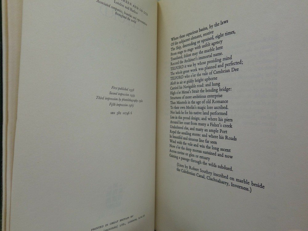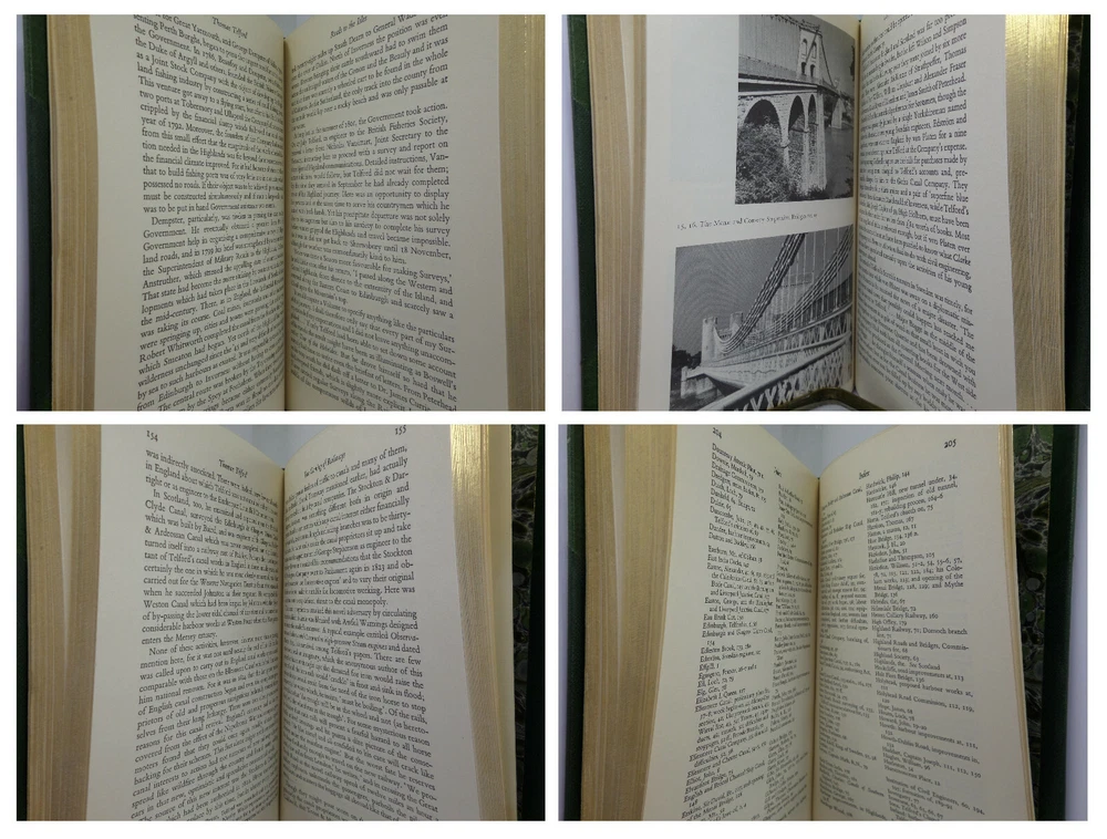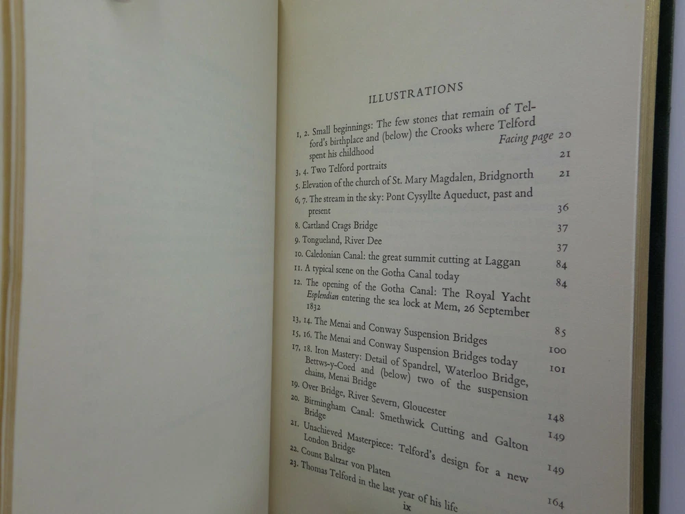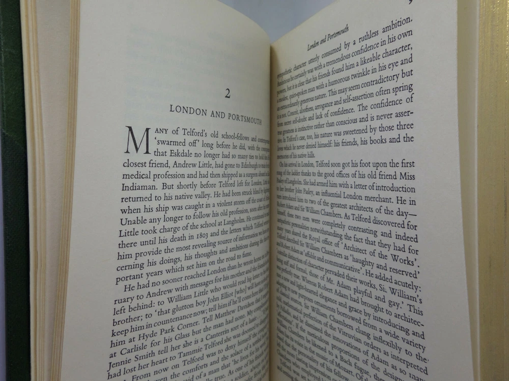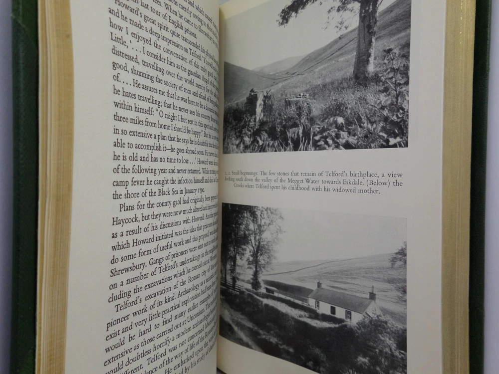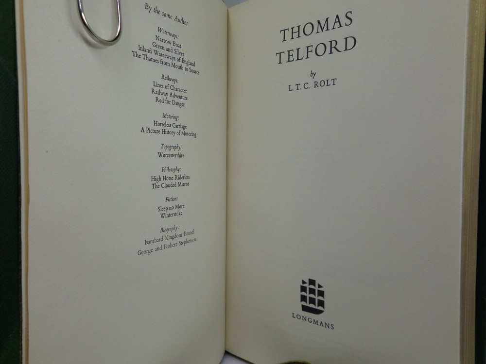 [ROLT, L. T. C.]. Thomas Telford. London: Longmans, 1969. Reprint (fifth impression). Leather-bound. Hardcover. Octavo (220 x 140 x 25 mm.). Pp. xv, 211. Handsome binding of half green morocco, spine gilt, all page edges gilt, marbled endpapers, half-title present, 23 illustrations, 4 maps. Printed by Lowe & Brydone Ltd. Condition: Very good. Binding tight and secure, covers clean with trivial light fading to spine. Contents immaculate and without previous ownership markings. Notes: The life and work of the man considered to be the father of civil engineering. International tracked shipping - dispatched promptly and securely. Please view my other books.