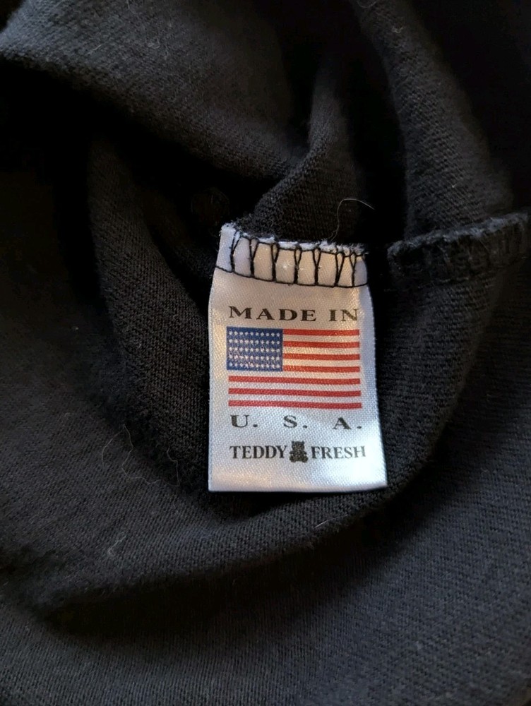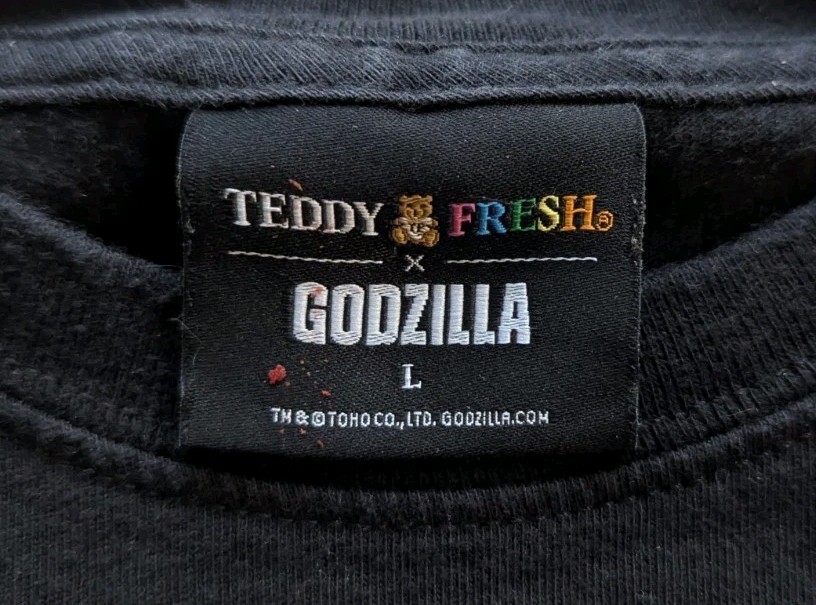 The Teddy Fresh x Godzilla t-shirt in size L features a solid black color with a crew neck and short sleeves. Made from fleece fabric, this classic fit shirt showcases the iconic Godzilla character logo as accents. Perfect for all seasons and featuring themes like hipster, nature, and comics, this designer shirt is a must-have for fans of the movie and anime cult classic. With the brand's signature style and high-quality construction, this shirt is a unique and stylish addition to any wardrobe.