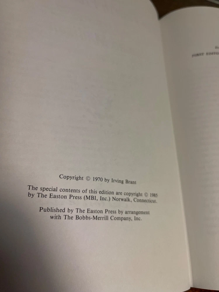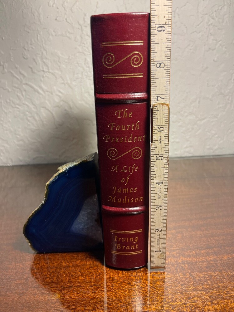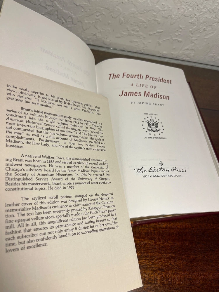 "The Fourth President: A Life of James Madison" by Irving Brant. The library of the presidents by the Easton press. The special contents of this edition are copyright 1985 by the Easton press, Norwalk, Connecticut. The book is in new, unread condition. The dark red leather book measures 9.25" x 6.25" x 2". Please review photos carefully, as they are part of the description.