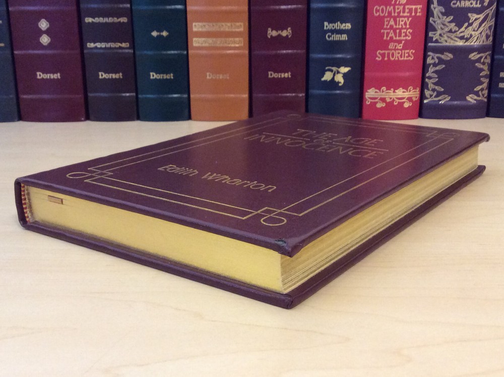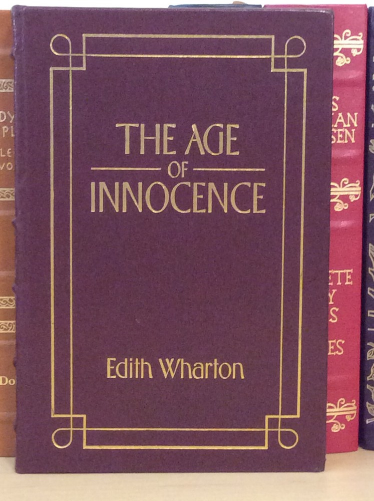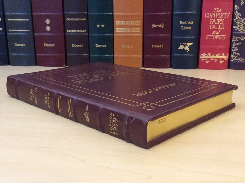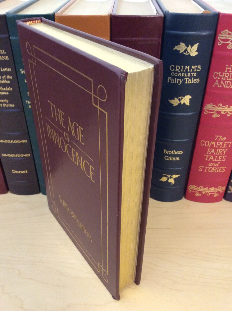The Age of Innocence by Edith Wharton bound in leather, with gilt edged pages and a ribbon marker. Item Condition: This is a leatherbound hardcover in Good condition. There are no names, bookplates or stamps from previous owners inside. The binding is tight and the pages are clean. The gilt edging is bright and shiny with dings and marks to the edges. The leather has wear on the spine (see photo #3 & #6) and the corners are bumped with wear. Dimensions are approx: 9.25" x 6.25" x 1" This book will ship in a box with bubble wrap. Photos are of the actual book that will be shipped.