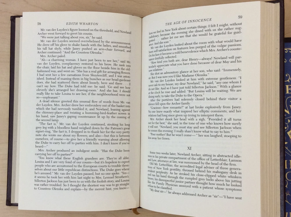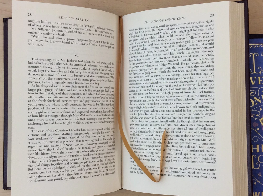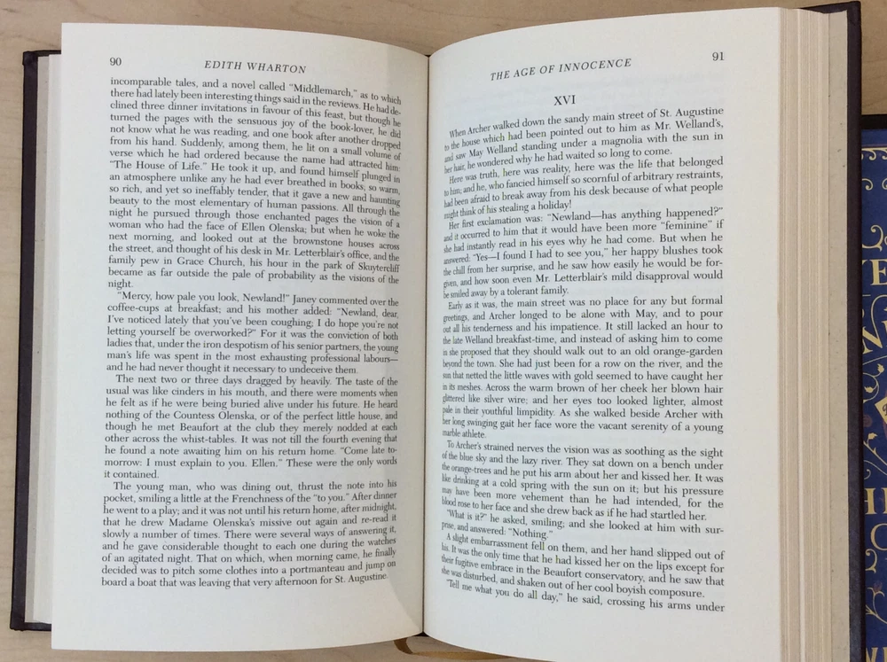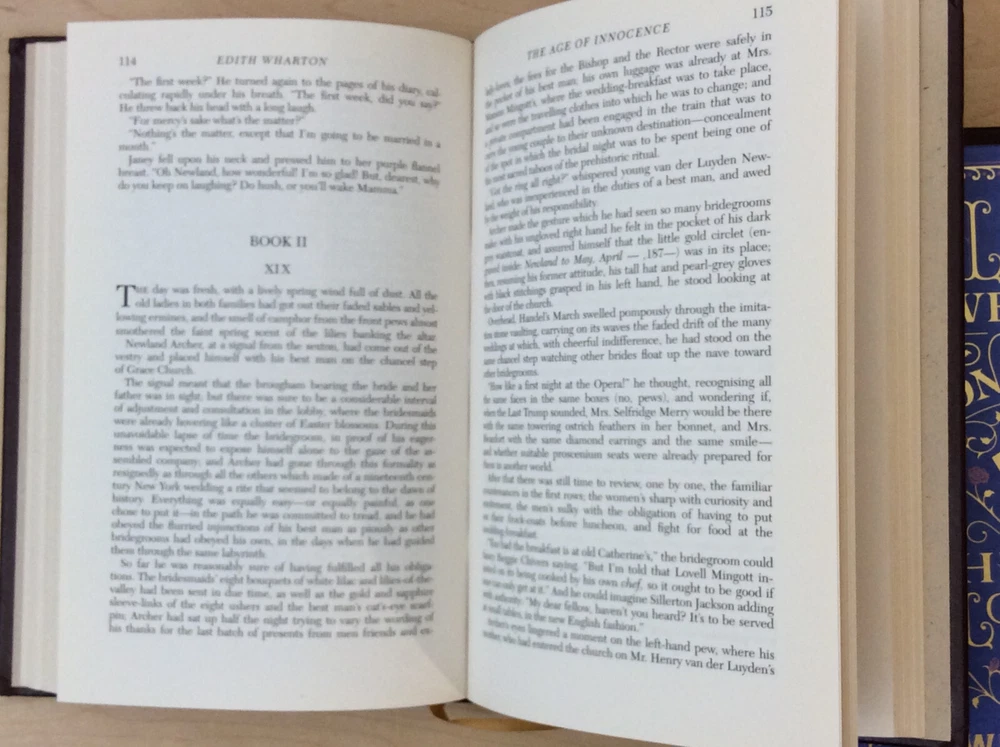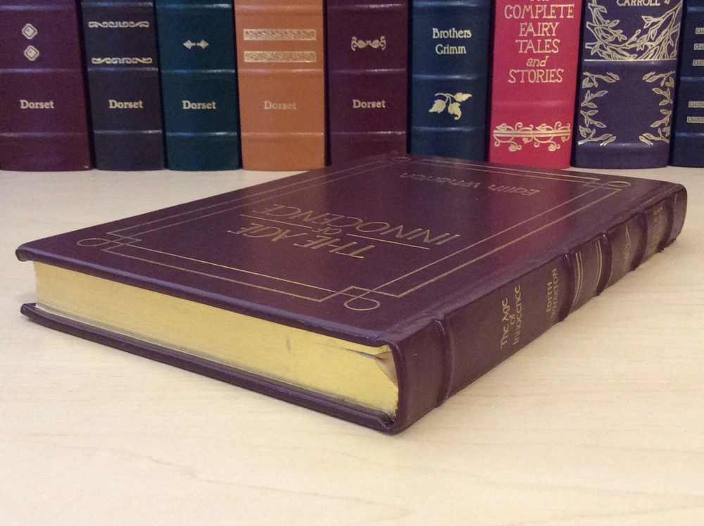 The Age of Innocence by Edith Wharton bound in leather, with gilt edged pages and a ribbon marker. Item Condition: This is a leatherbound hardcover in Good condition. There are no names, bookplates or stamps from previous owners inside. The binding is tight and the pages are clean. The gilt edging is bright and shiny with dings and marks to the edges. The leather has wear on the spine (see photo #3 & #6) and the corners are bumped with wear. Dimensions are approx: 9.25" x 6.25" x 1" This book will ship in a box with bubble wrap. Photos are of the actual book that will be shipped.