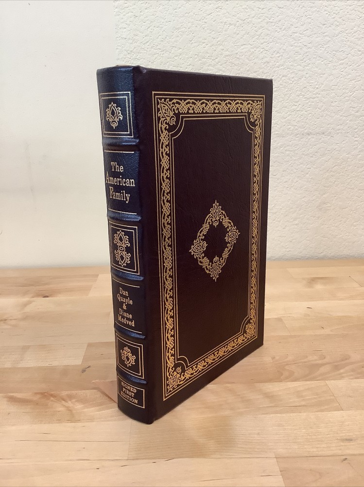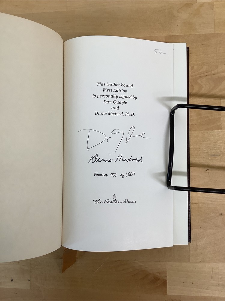 Easton Press leatherbound hardcover, 1996, 1st edition. Signed by Dan Quayle and Diane Medved. Number 937 of 1600 printed. Very good condition, tight binding, pages are clean and unmarked, with exception of bookseller price penciled in top corner of title page. Small scratch to leather on back panel. Gilt edges show minor scratch on top and bottom textblock.